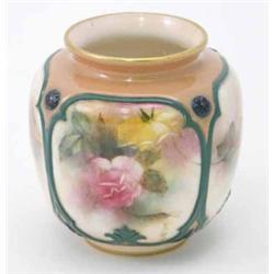 A Hadley's Worcester vase, painted with ogee panels of pink and yellow roses against a peach ground, printed mark, 3.25in. £100-150