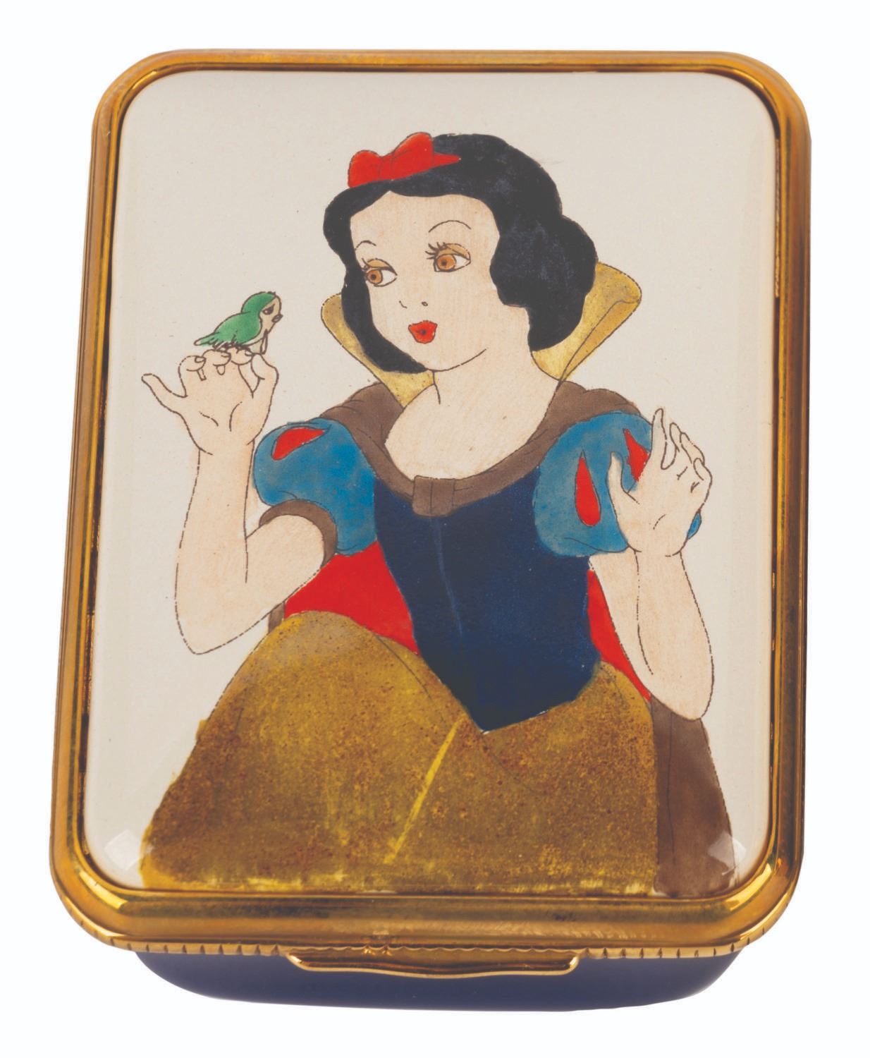 (Halcyon Days, 2012) A trinket box with a lid featuring Snow White, created for The Walt Disney Family Museum’s first major exhibit, Snow White and the Seven Dwarfs: The Creation of a Classic. Measuring 2” x 1.5” x 1” tall, the box comes with its original packaging and is in very good condition with light wear.