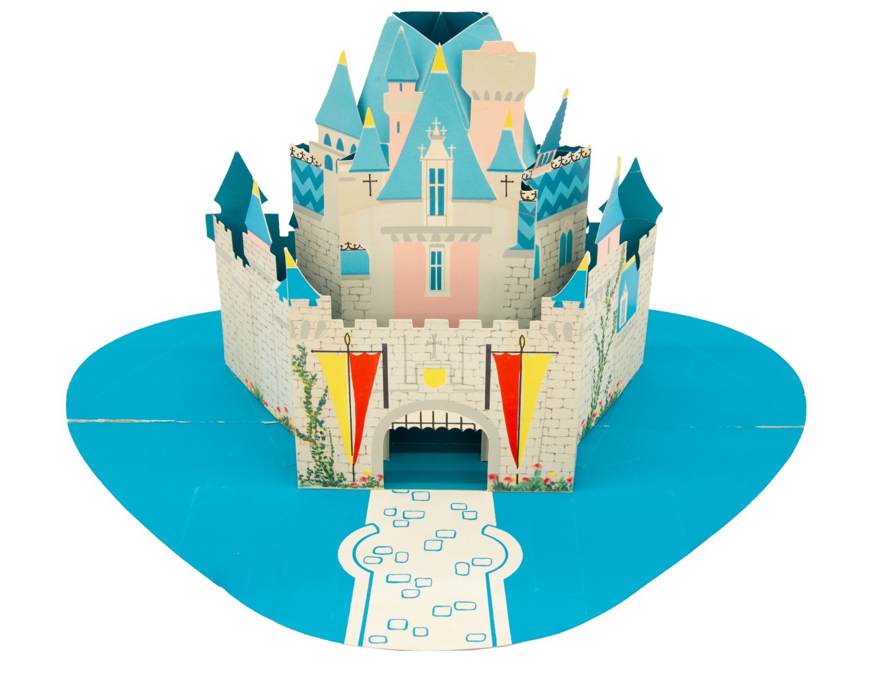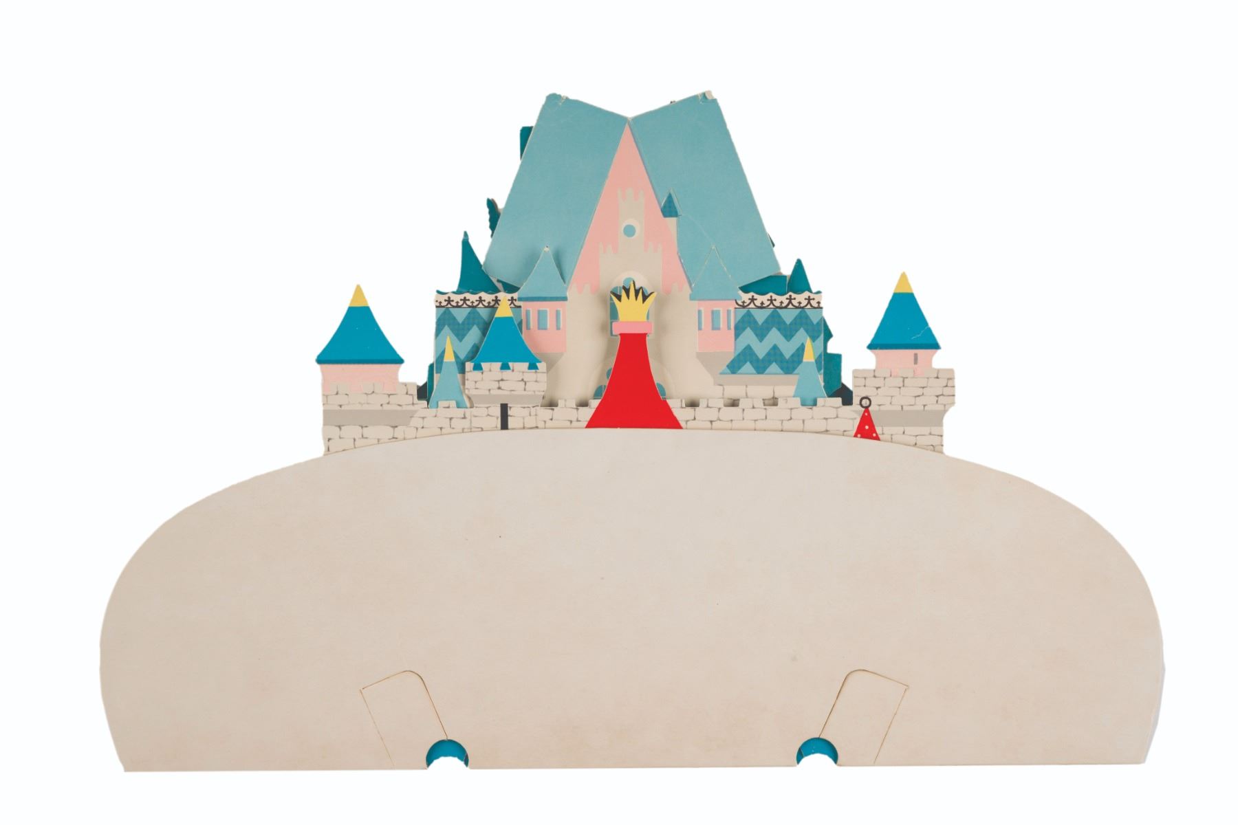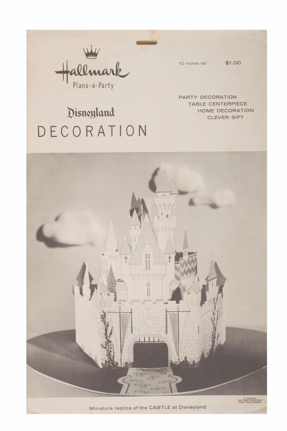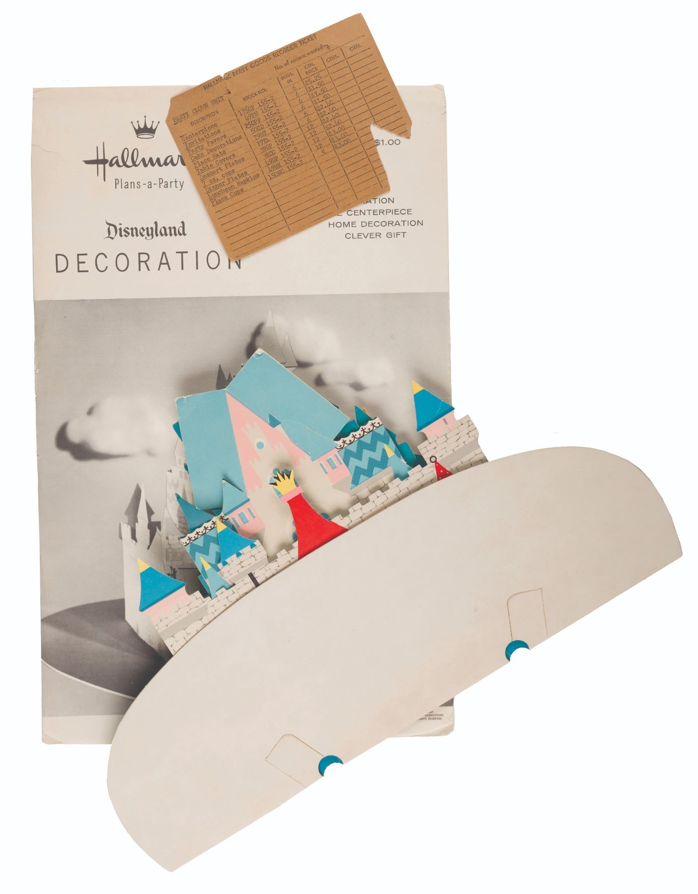 (Disneyland, 1956-60s) An impressive Hallmark Plans-a-Party Disneyland Decoration. This three-piece, miniature replica of Sleeping Beauty's Castle at Disneyland comes within original envelope and would have been offered for sale with other related merchandise through Hallmark Communication Center beginning in 1960. Measuring 10" tall when assembled, the entire piece and 15.75"x10" package, display in very good condition, with slight creases and wear from use.