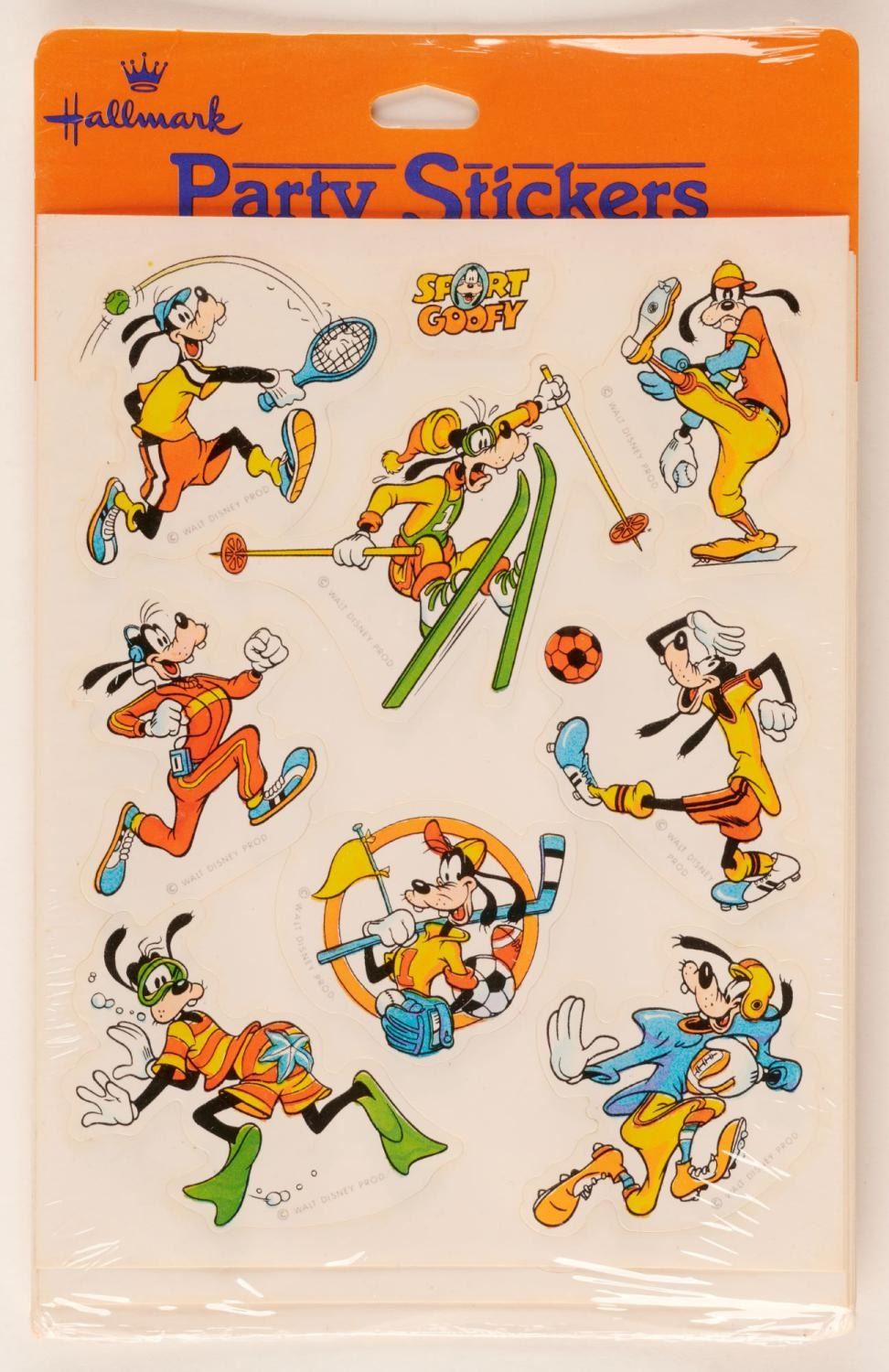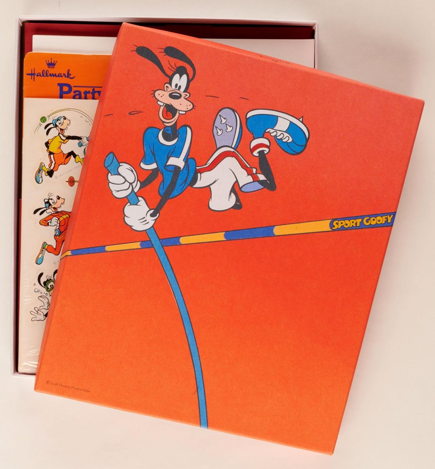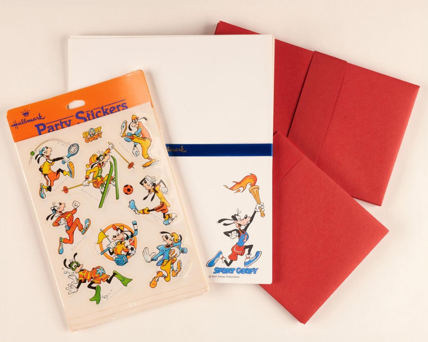 (Hallmark, 1983) A set of Sport Goofy Stationery manufactured by Hallmark. The set includes 12 sheets of Sport Goofy stationery, 15 blank sheets, 13 envelopes, and a sealed package of Party Stickers. The stationery is all in very good to fine condition, in the 7” x 8.5” x 0.75” very good condition box with very minor corner wear.