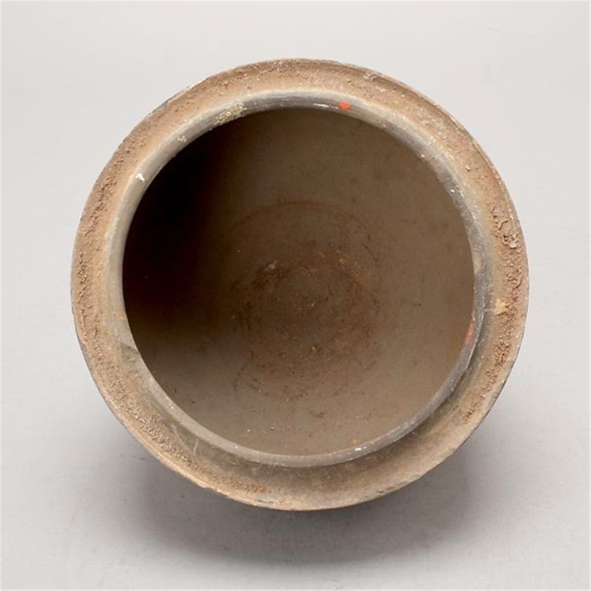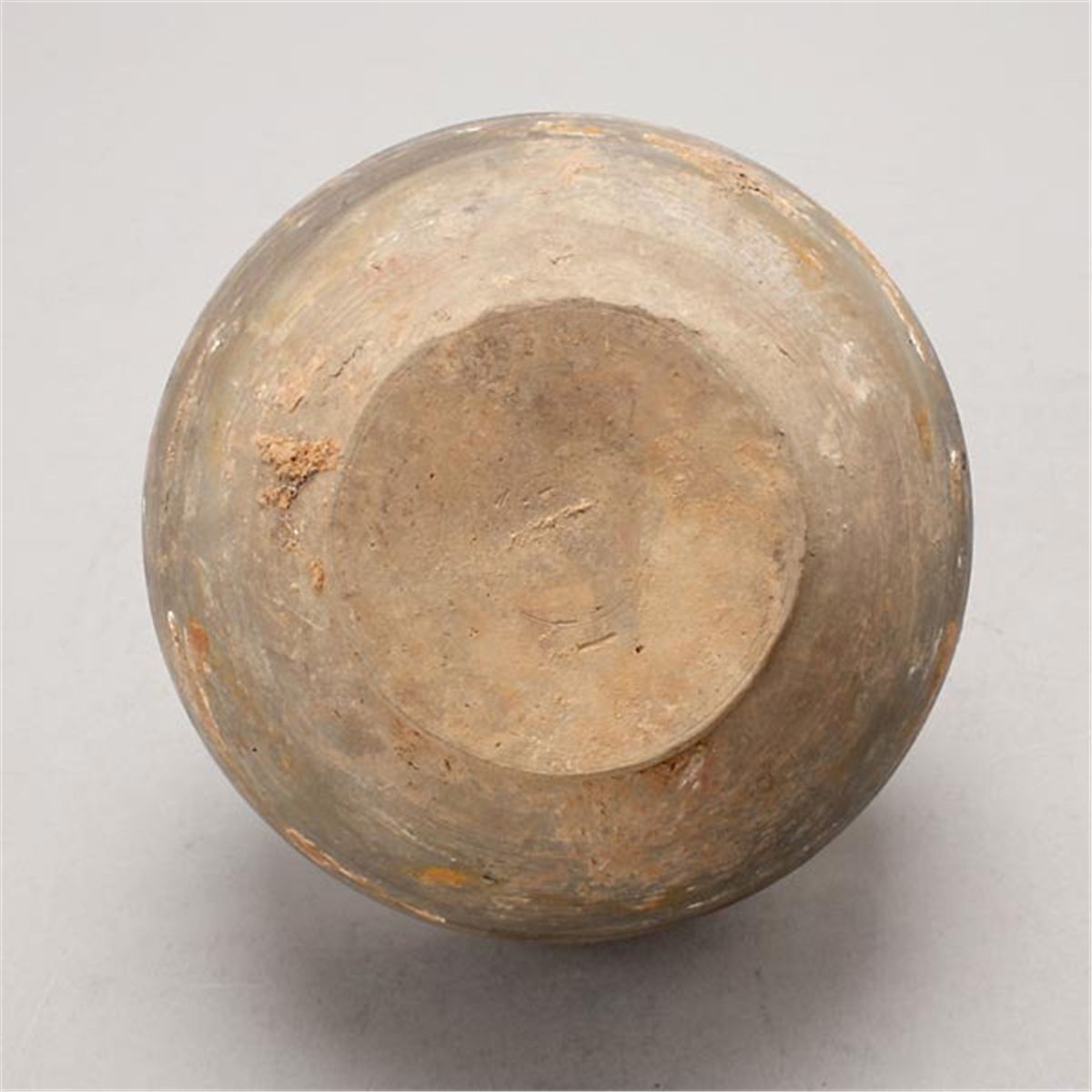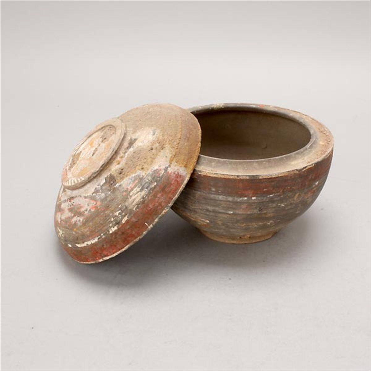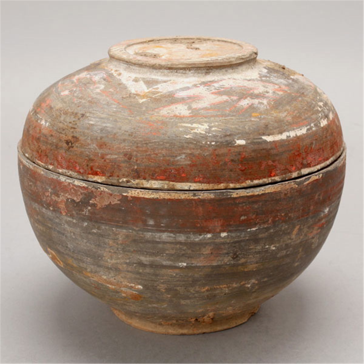 A Han Style Painted Circular Ceramic Container and Lid, of globular shape with horizontal bands, the lid decorated with geometric designs and with a recessed circular knob {Height: 6 3/4 inches (17.1 cm)} [Surface wear, chips]