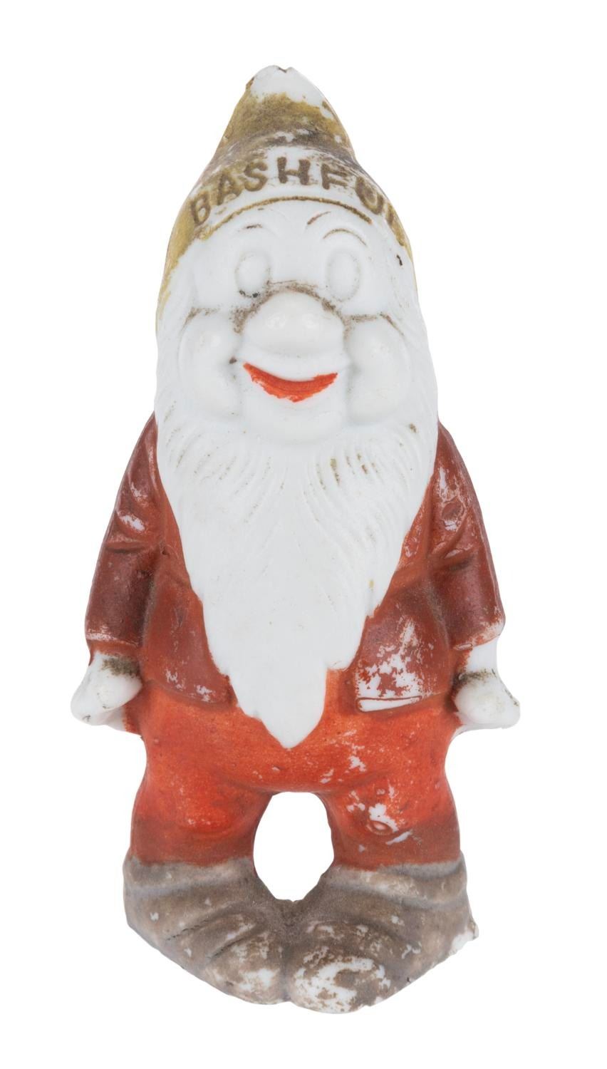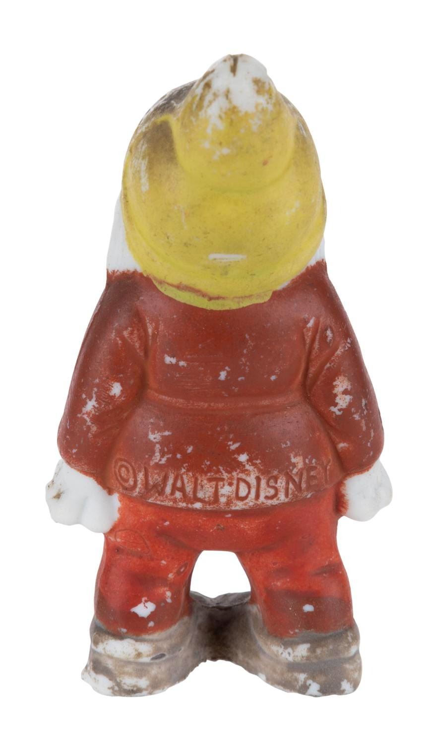 (George Borgfeldt Corp., 1938) A hand-painted bisque figure of Bashful from Disney's Snow White And The Seven Dwarfs. Manufactured in Japan, the figure was part of a set distributed by early Disney Licensee, The George Borgfeldt Corp. Bashful measures 3.25" tall and is in very good condition with some wear to its hand-painted elements.