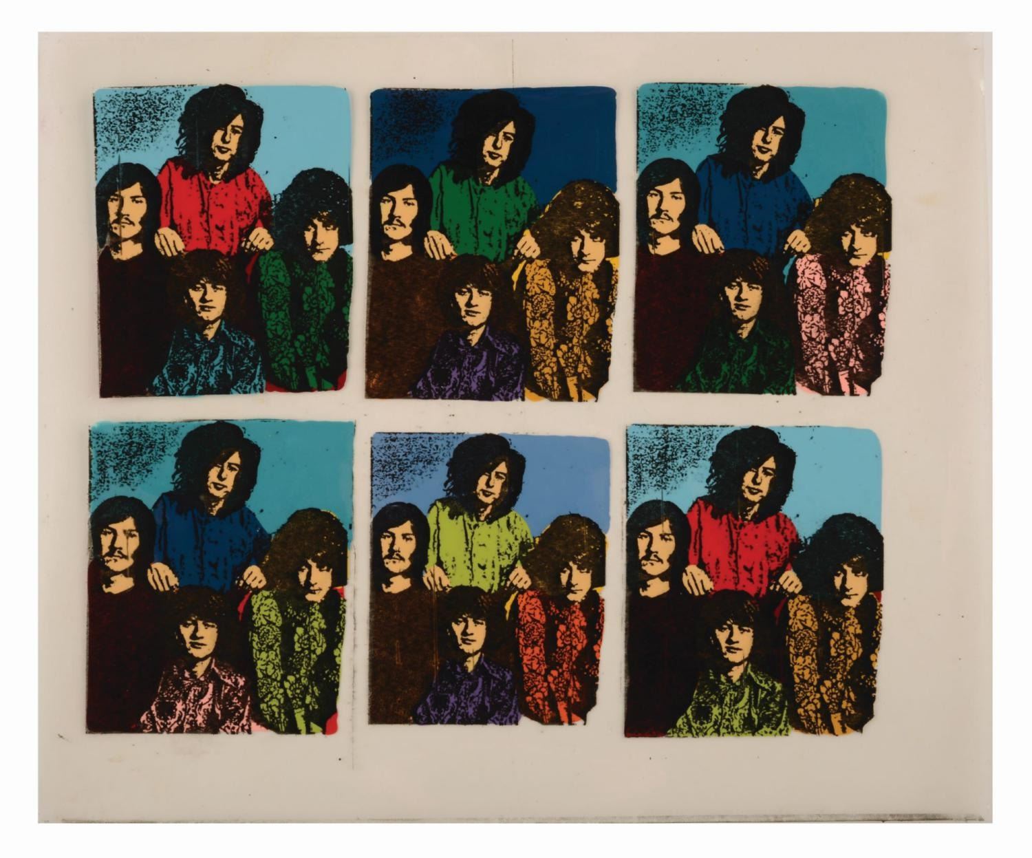 (Led Zeppelin, 1970s) A transparency featuring multiple hand-painted photographic portraits of the Led Zeppelin bandmates Jimmy Page, Robert Plant, John Bonham, and John Paul Jones. Having been painted on the reverse, the portraits resemble an animation cel, with each portrait exhibiting a unique combination of colors. Measuring 10.5" x 12.5", the transparency is in good condition with discoloration, pinholes in the corners, creasing, and wear from handling.