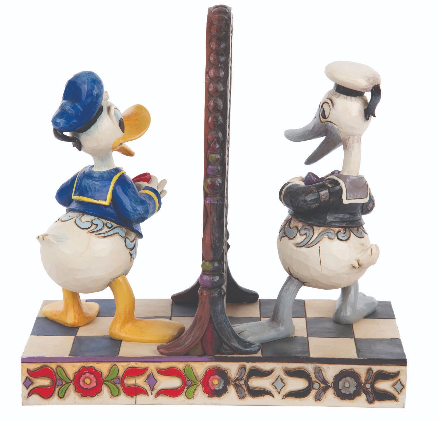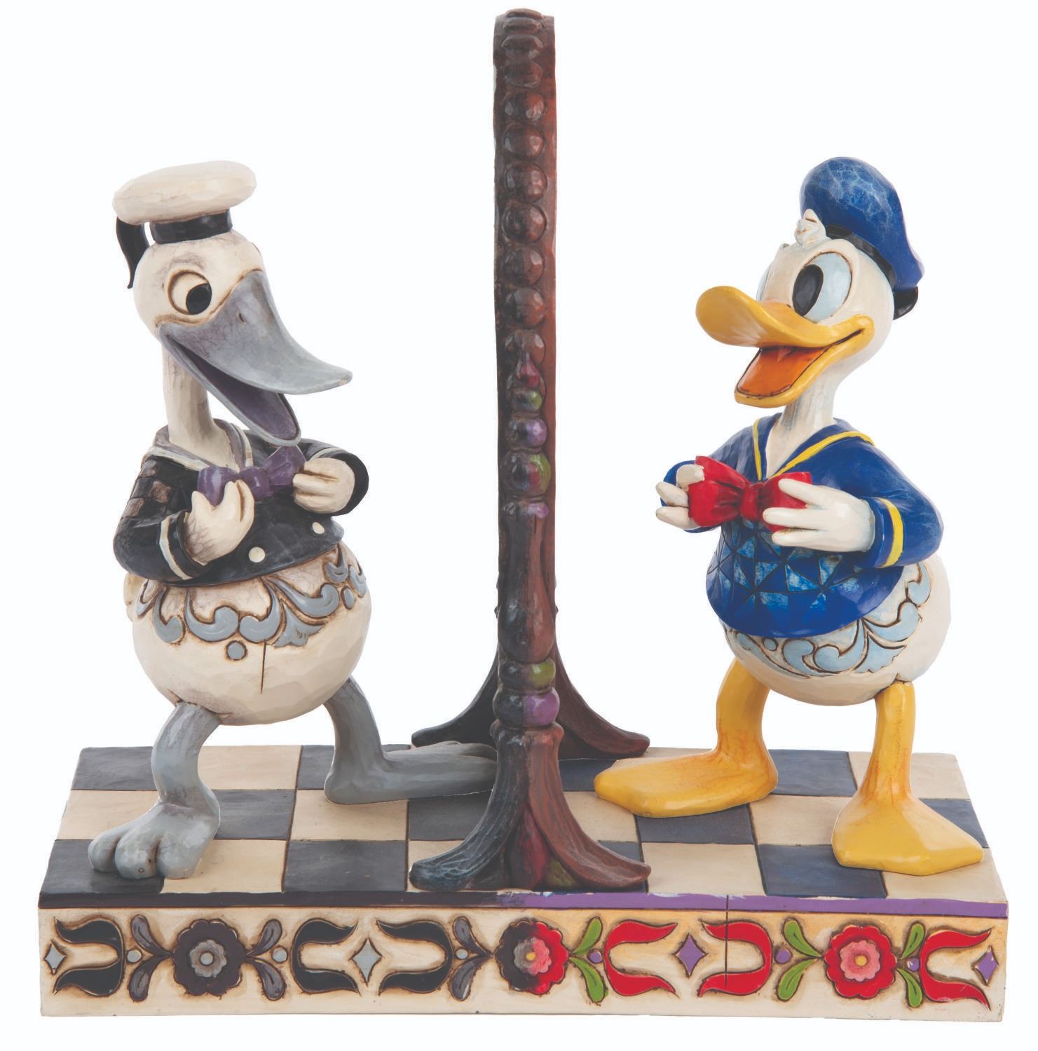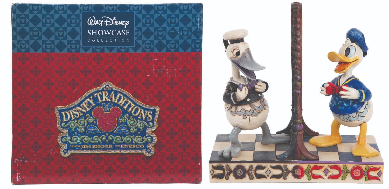 (Enesco, 2009) A Disney Traditions Jim Shore and Enesco figurine titled "Handsome as Ever" featuring Donald Duck as he appeared in the 1930s and at the present. The figurine was released for the beloved character's 75th anniversary as part of the Walt Disney Showcase Collection. Measuring 8.25" tall and 8" x 4", the piece displays in fine as-new condition with the original box.