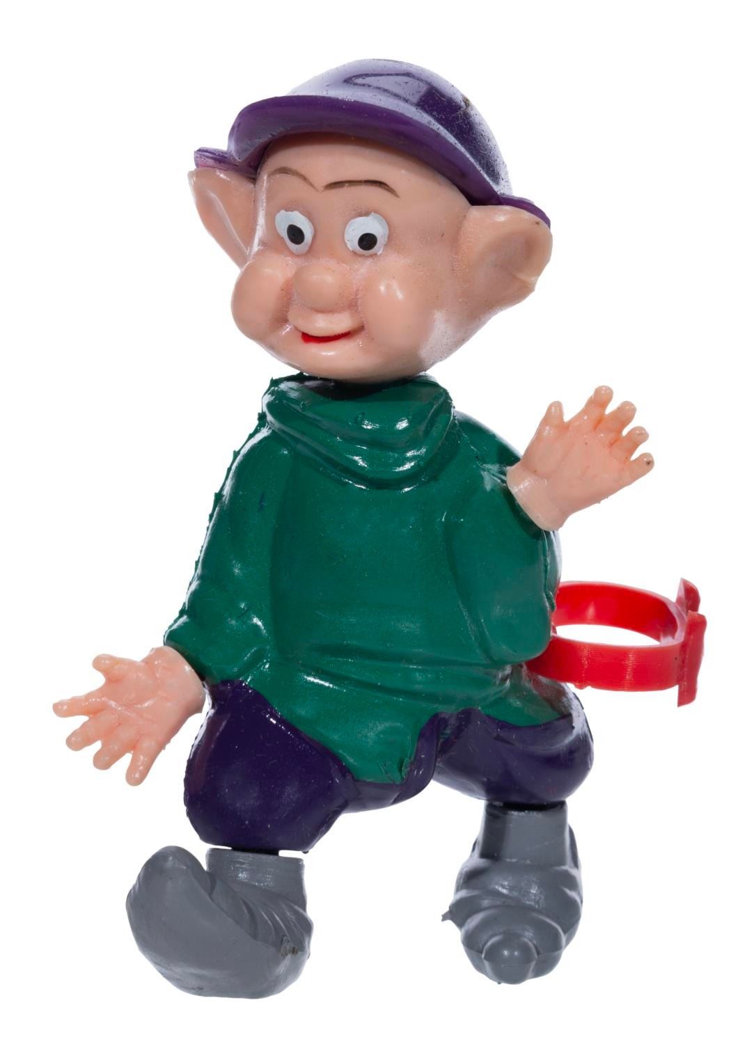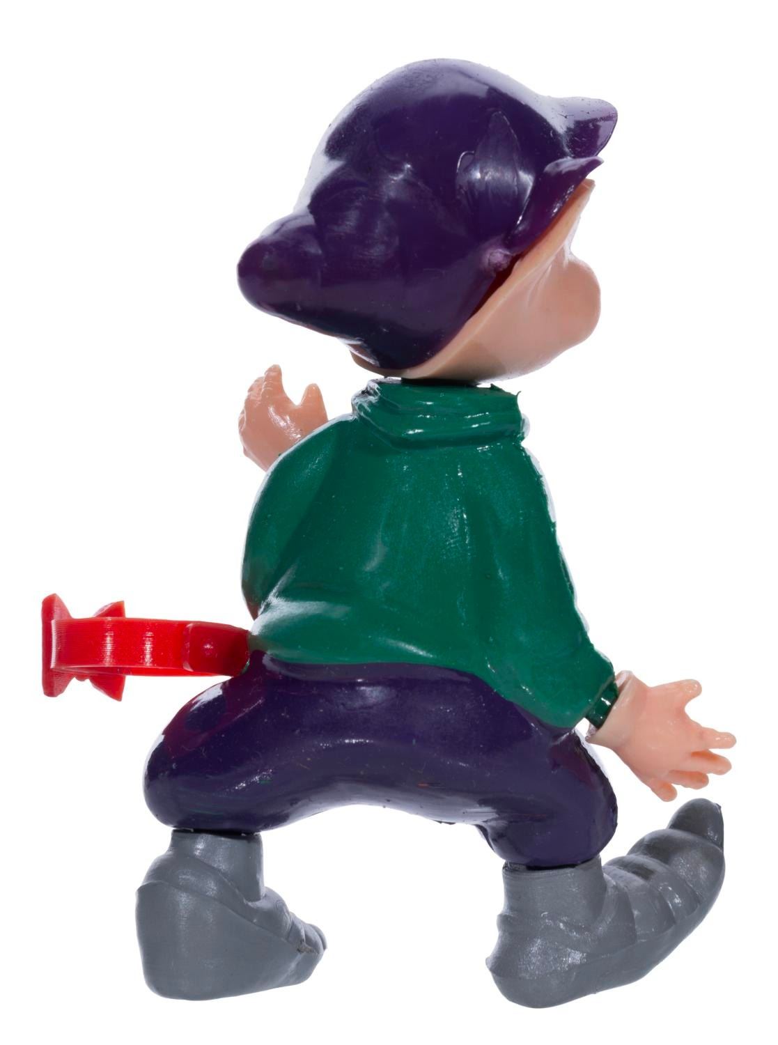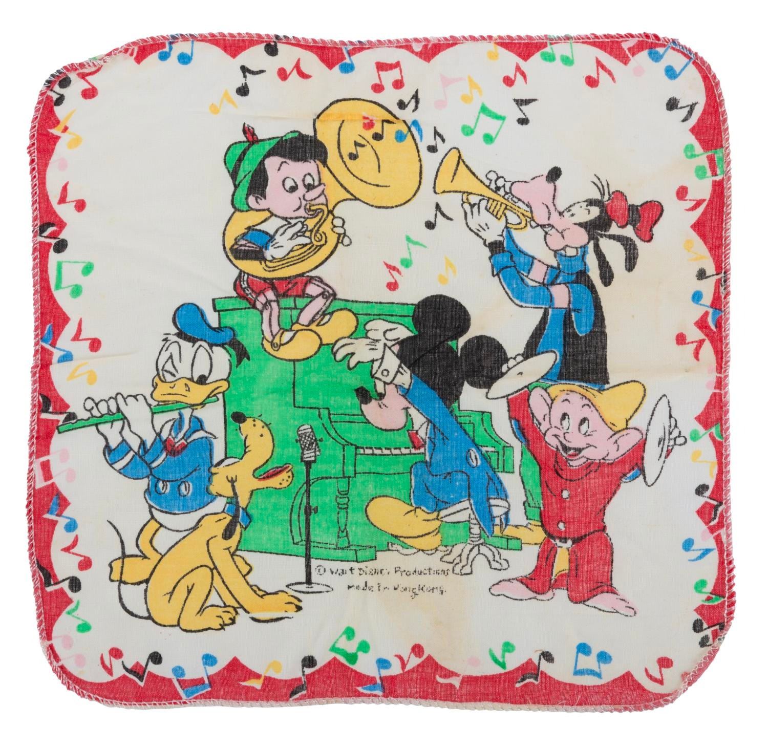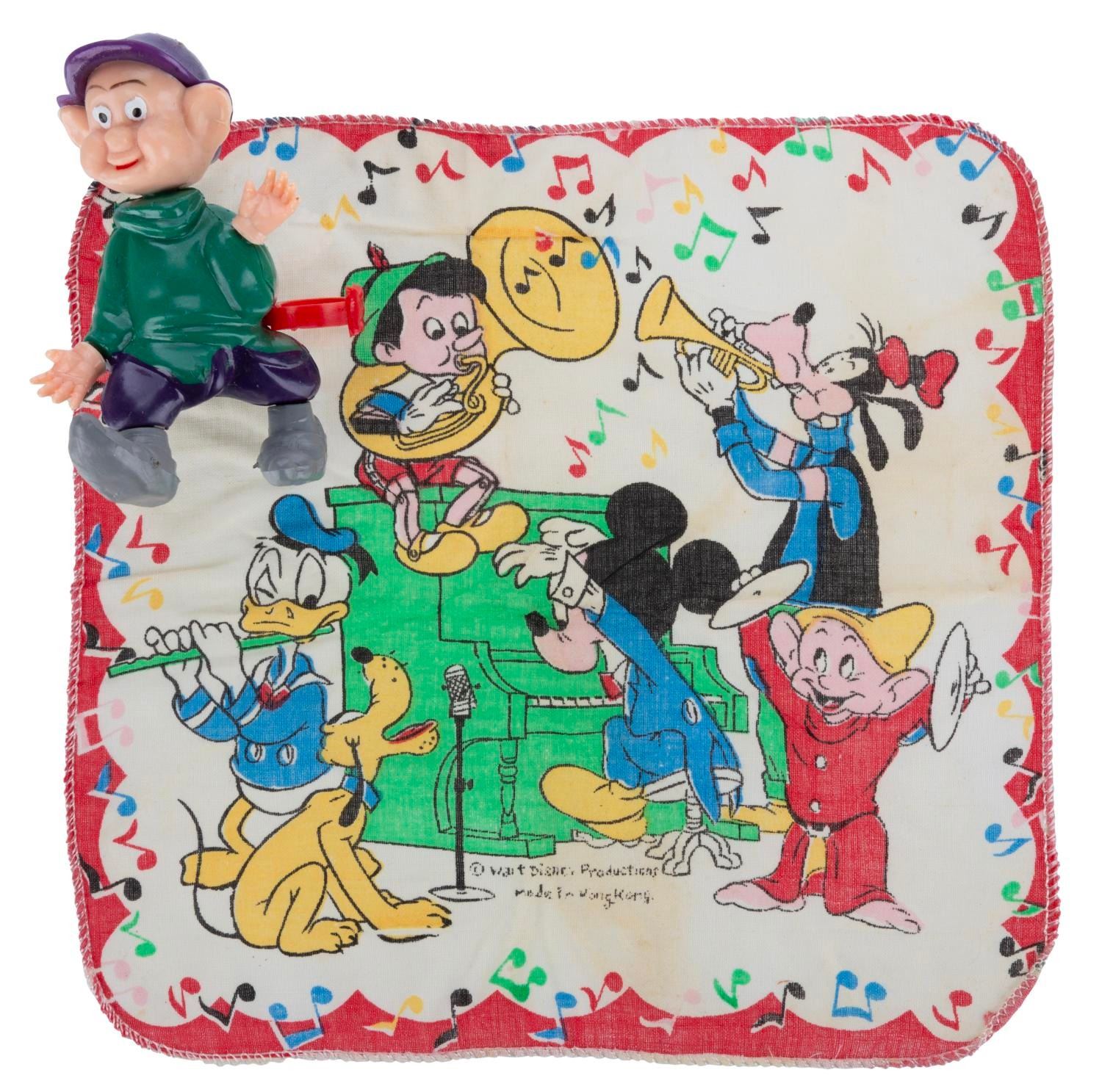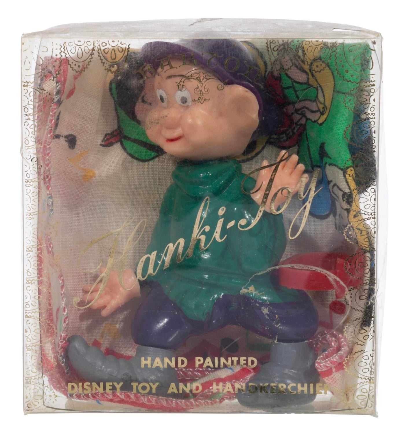 (Barton, 1970s) A Hanki-Joy Dopey Toy and handkerchief set in its original box. The handkerchief measures 8.5”x8.5”, the figure is 4”x3” and the box is 3.5”x3.75”x1.25”. The pieces are in very good condition with some fading and typical wear from age. The plastic box is in good condition with expected wear and chipping and cracking from age.