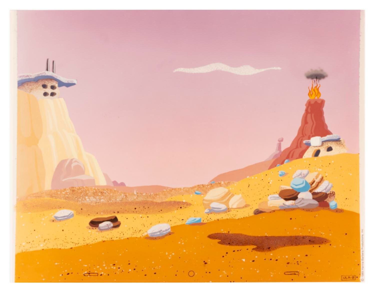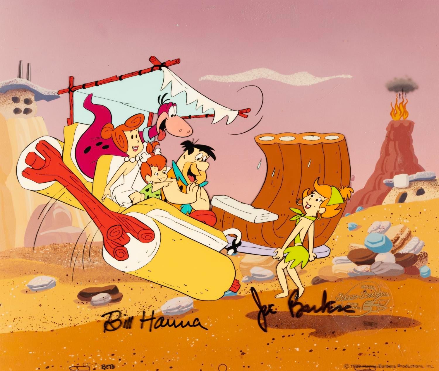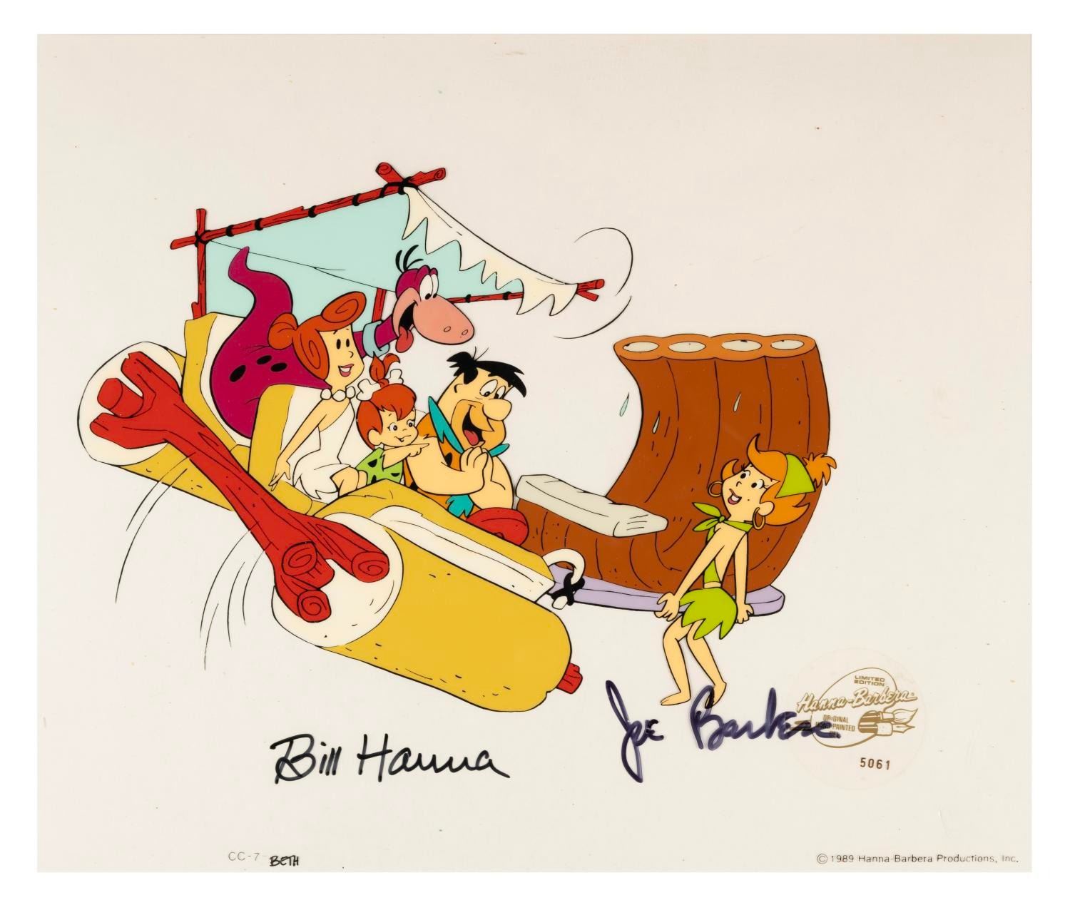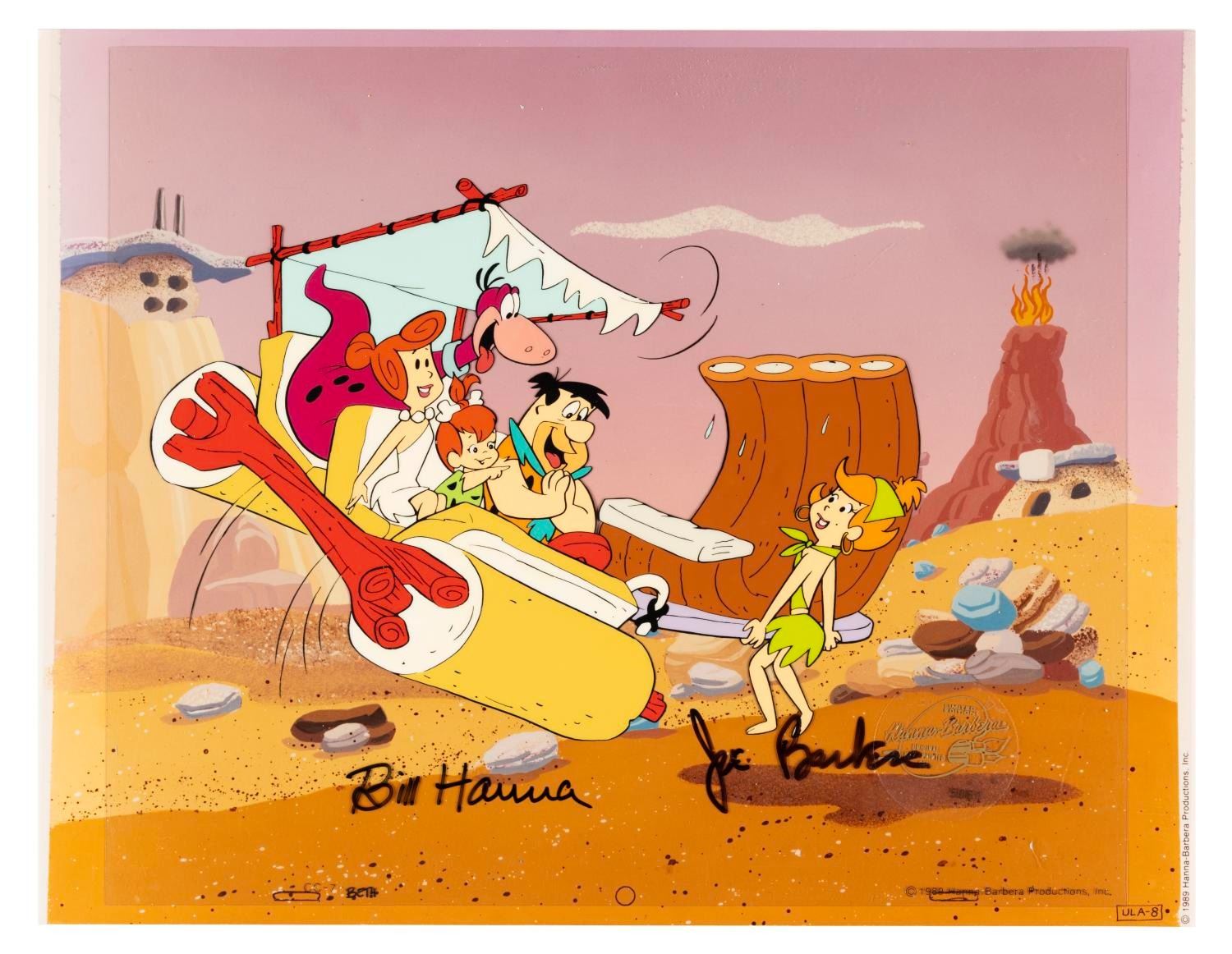 (Hanna-Barbera, 1989) A limited edition cel of “The Flintstones” signed by Bill Hanna and Joe Barbera in black marker. The cel itself was painted for a limited Edition titled "Ed's Mammoth Ribs" and was limited to 300 numbered pieces. This unumbered edition was created at the studio, hand-signed and given to an employee. The color copy background is not the same one used in the numbered edition. With an image size of 6.75” x 9.5” on a 10.5” x 12.5” cel, and paired with an 11” x 14.25” color reproduction background, the piece displays in very good condition with light scratches, wear, and a crease at the bottom right corner.