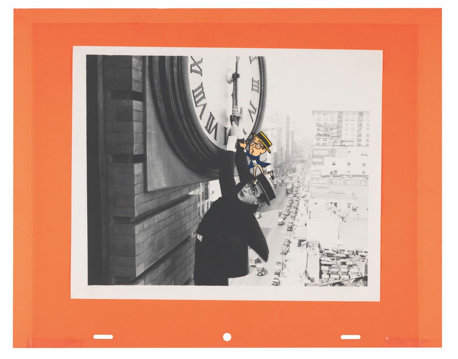 (Clampett, 1950s) A concept art presentation for a proposed animated project starring Harold Lloyd. Bob Clampett and Harold Lloyd, who were personal friends, worked together to develop an idea for a series in which a cartoon version of Lloyd would be animated into his original silent comedies. The two shopped the idea around Hollywood, but it was never picked up and the project was ultimately abandoned. This concept art is the only known record of the unproduced project to exist. Measuring 10.25” x 12.25” with a character image size of 1.75” x 1.25”, the cel is overlaid on an 8” x 10” glossy photo which has been mounted to an 11” x 14” piece of matte board and is in fine condition.