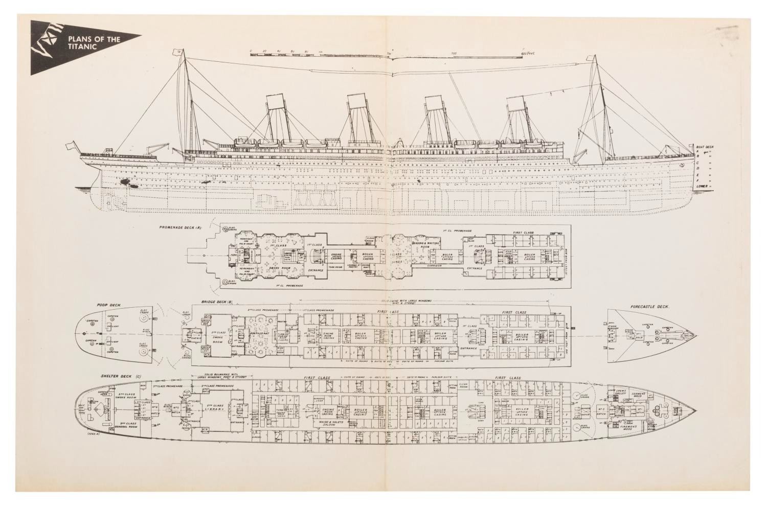 (Goff, 1940s-50s) A print titled"Plans of the Titanic" owned by Harper Goff. Disney Legend Goff is best known for his design of the Nautilus for"20,000 Leagues Under the Sea," and also painted"The Sinking of the Titanic," published in Esquire magazine in July of 1946. This elevation view with three upper deck plans was possibly an aid in creating that painting. Measuring 11" x 17", the plans are in very good condition with slight handling wear and typical light color shift from age, and an original vertical fold.