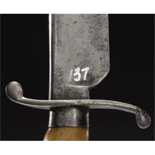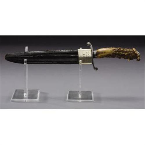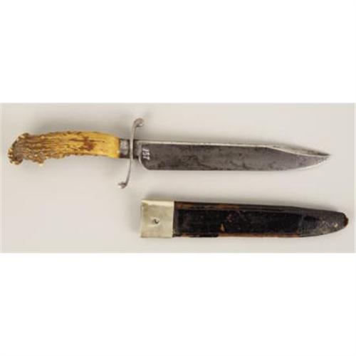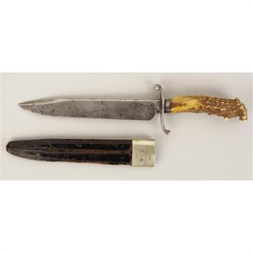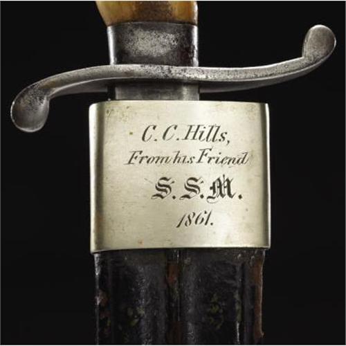<B>A Hassam of Boston Fighting Knife and Scabbard From The Civil War Era dated 1861.<BR></B></I><BR>This fighting knife was made by the Hassam Brothers of Boston for use by Union troops in the Civil War. It has the classic horn grips with the silver ferrule and cap. With the attractive and desirable 'S'-shaped crossguard, the 8" blade has a nice, even patina and is clearly stamped with the 'Hassam, Boston' mark at the ricasso. The dark brown sheath makes this weapon especially important since the owner's name 'C. C. Hills' and the date '1861' is engraved on the throat of the sheath. Also engraved is the presenter's name as 'From his friend S. S. M.' as well. While the silver throat of the scabbard is intact, there is some minor crackling of the leather on the sides and at the tip. Measuring 13" overall, this is an excellent example of a well-made Union fighting knife.<I> From The William Turner Collection.</B></I><BR><BR><b>Shipping:</b> Bats, Clubs, Sticks, Swords, Rif (<a target="_blank" href="http://www.heritageauctions.com/common/shipping.php">view shipping information</a>)