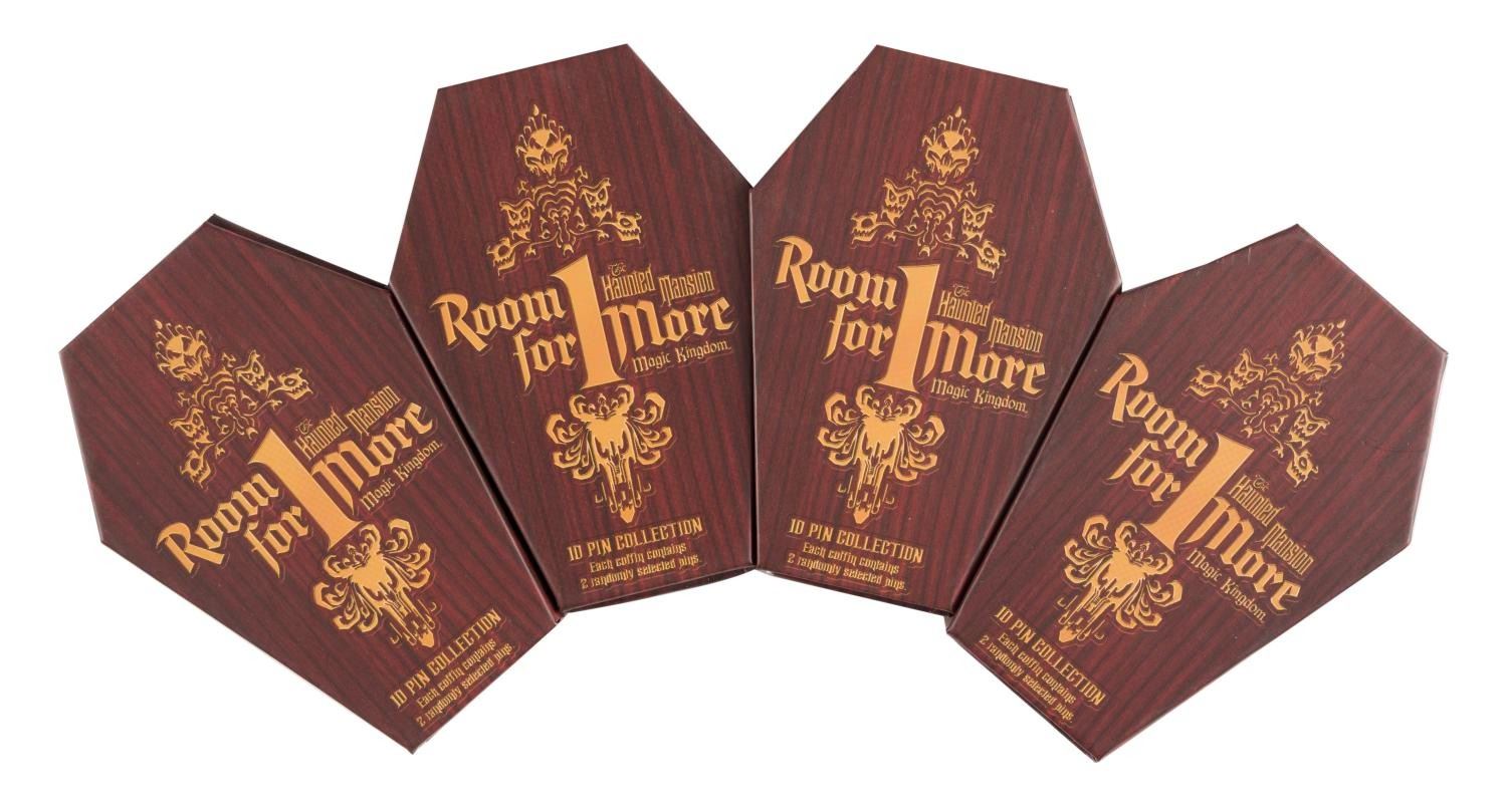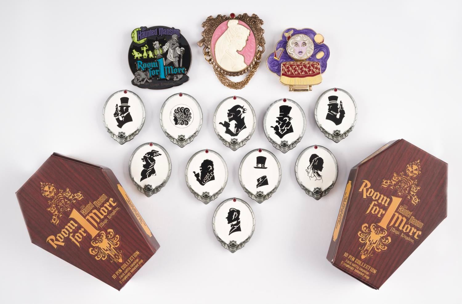 (Walt Disney World, 2011) A Haunted Mansion "Room for 1 More" Pin set from The Magic Kingdom. The complete set includes 10 Mystery Pins and 3 limited edition event pins with slider, chain, and "pin-on-pin" features. Each pin is in fine condition with few signs of wear from handling.