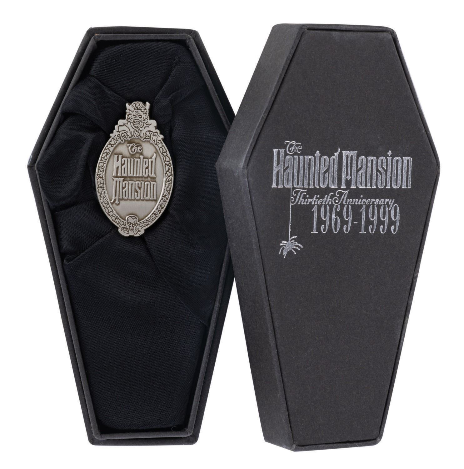 (Disneyland, 1999) A limited edition Haunted Mansion pin that was created in celebration of the attraction's 30th anniversary. Limited to only 1969 pieces in a nod to the attraction's opening year, it comes in a stylish coffin-shaped box which mentions the anniversary on the lid. Measuring 1.5"x1" in its 5" tall coffin box, the pin is in very good condition.