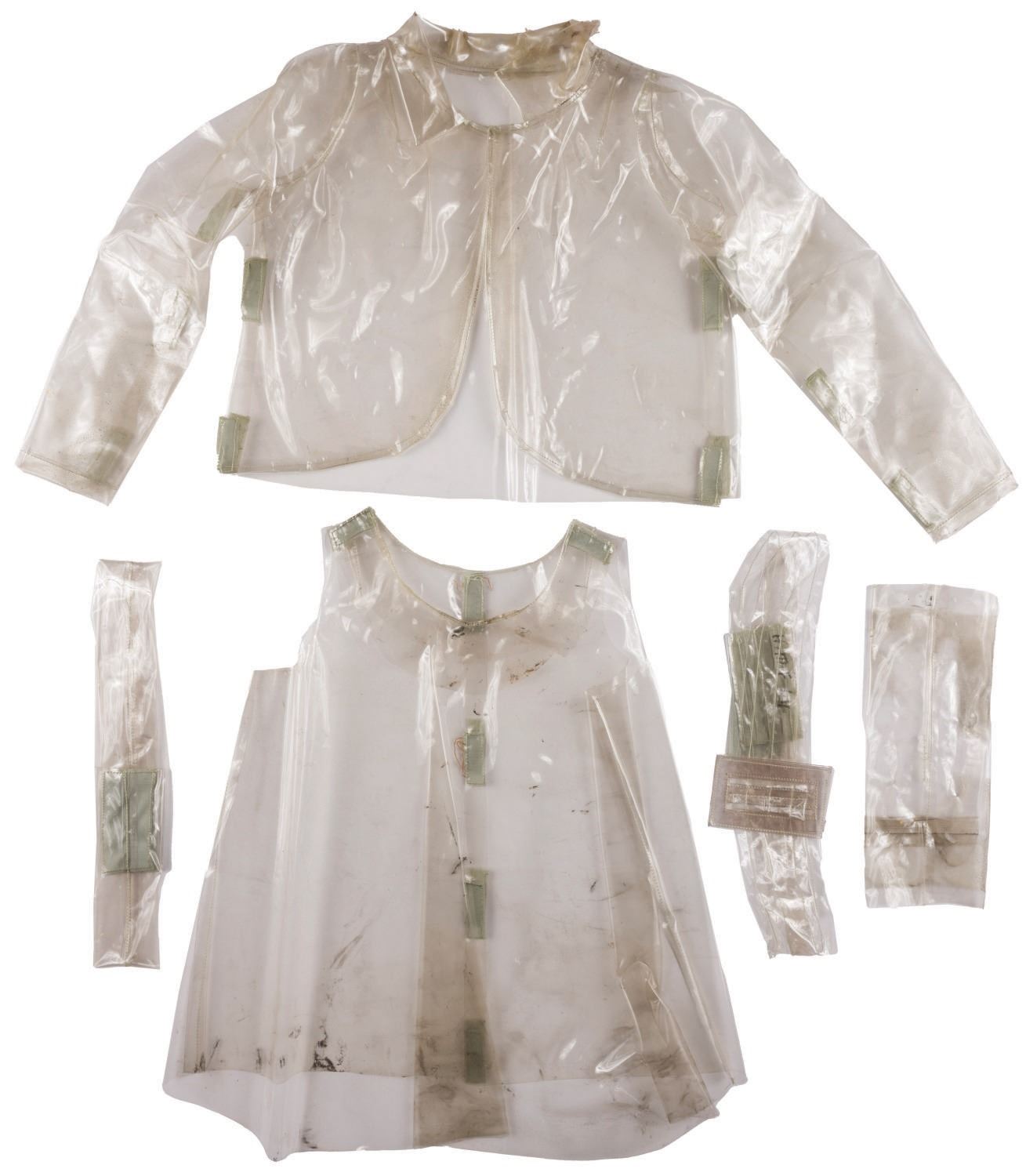 (Disneyland, 1980s) A costume for an Audio-Animatronics ghost figure of the Graveyard scene in The Haunted Mansion. This (5) piece costume features a shirt, coat, and three "belts" manufactured from a slick, clear vinyl material with velcro binding, two pieces retaining annotation linking this particular costume with Haunted Mansion Audio-Animatronic figure #64. Measuring various custom sizes, each piece is in good overall condition, exhibiting slight yellowing, stains, and wear from Park use.