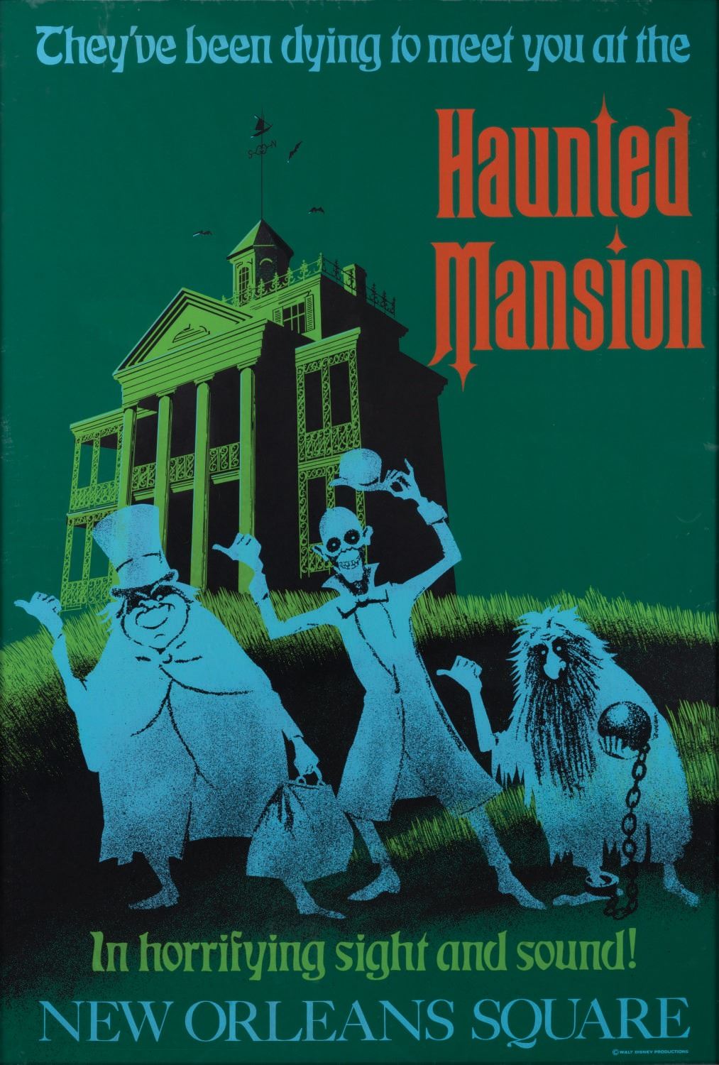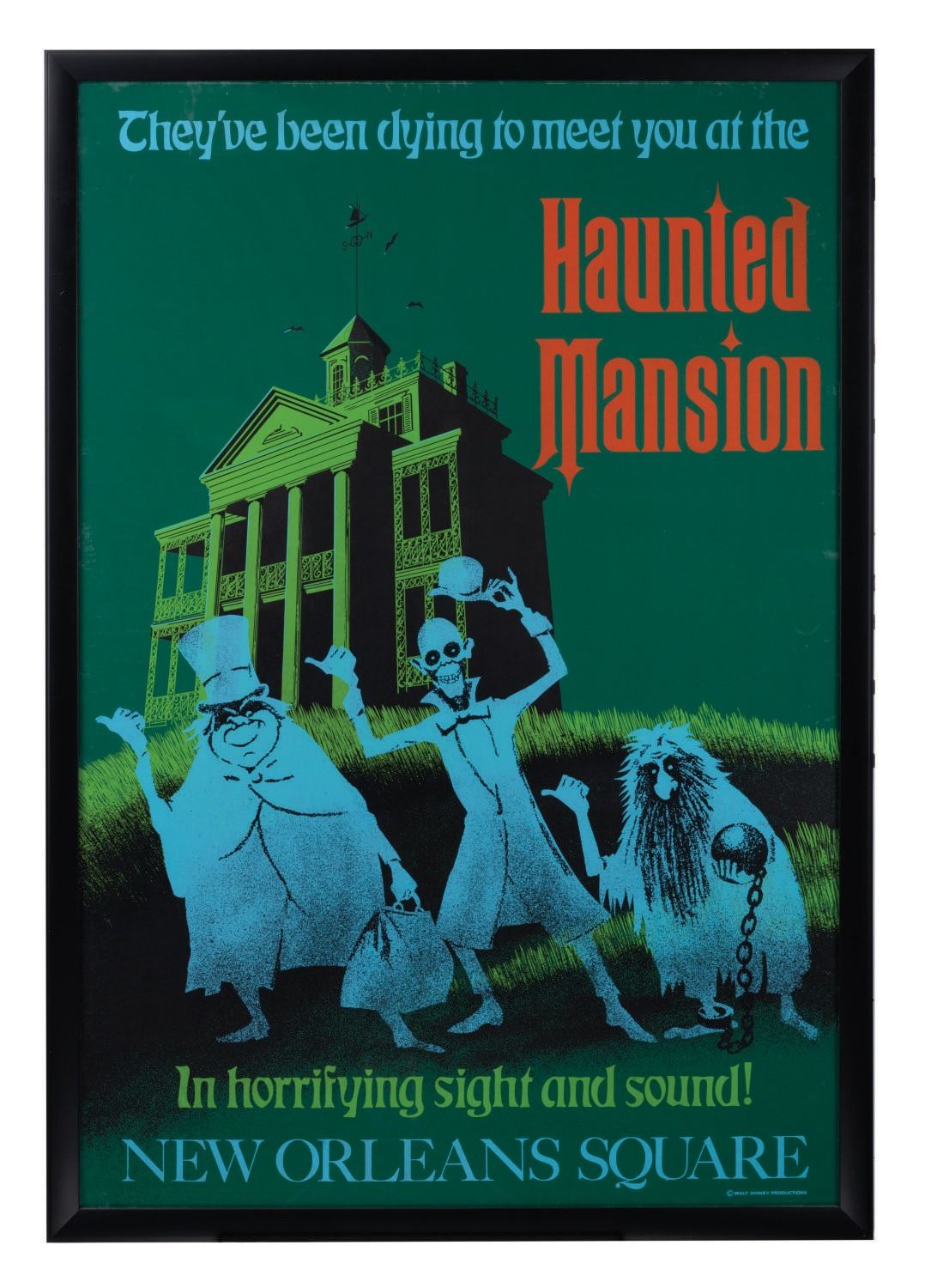 (Disneyland, 1969) An original hand-silkscreened attraction poster for the Haunted Mansion in New Orleans Square. Designed by Imagineers Marc Davis and Ken Chapman, this iconic attraction poster was later adapted for both the Magic Kingdom at Walt Disney World and Tokyo Disneyland Park. Measuring 36"x54", the poster is in very good condition with some scuffs around edges, few small creases throughout and light wear.