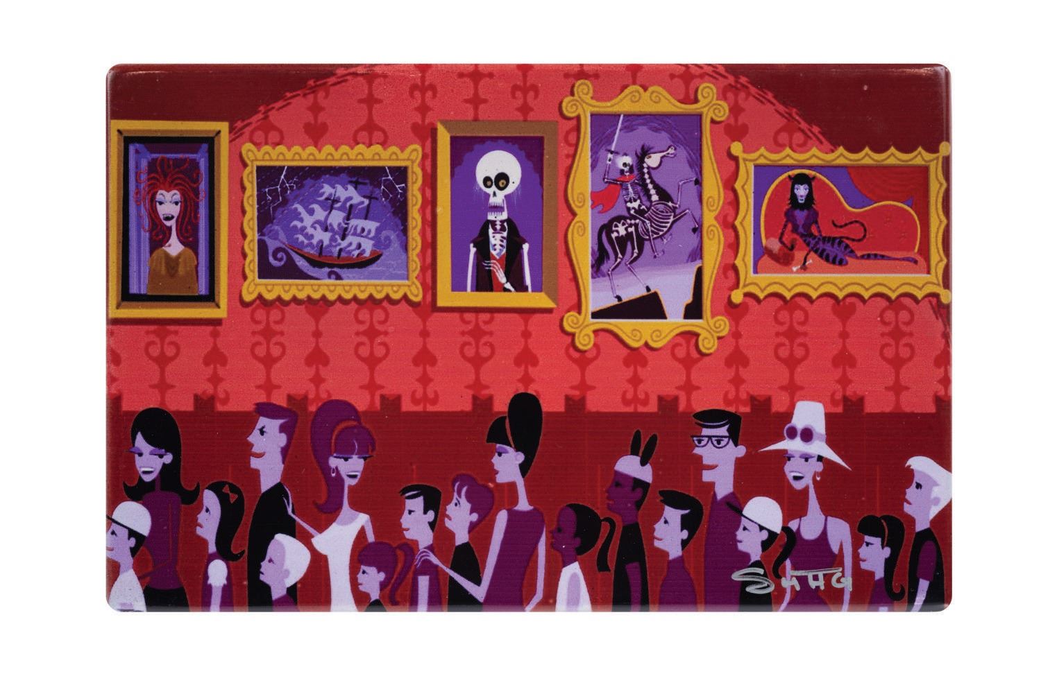 (Disneyland, 2009) A signed jewelry box created exclusively for the 40th anniversary of The Haunted Mansion at Disneyland Park. The decorative box features artwork inspired by the changing portraits along the queue of The Haunted Mansion and has been signed in silver ink by artist Josh "Shag" Agle. Measuring approximately 5.75"x8.75" and 2.5" deep, the box is in very good overall condition, exhibiting a few of the slight scuffs.