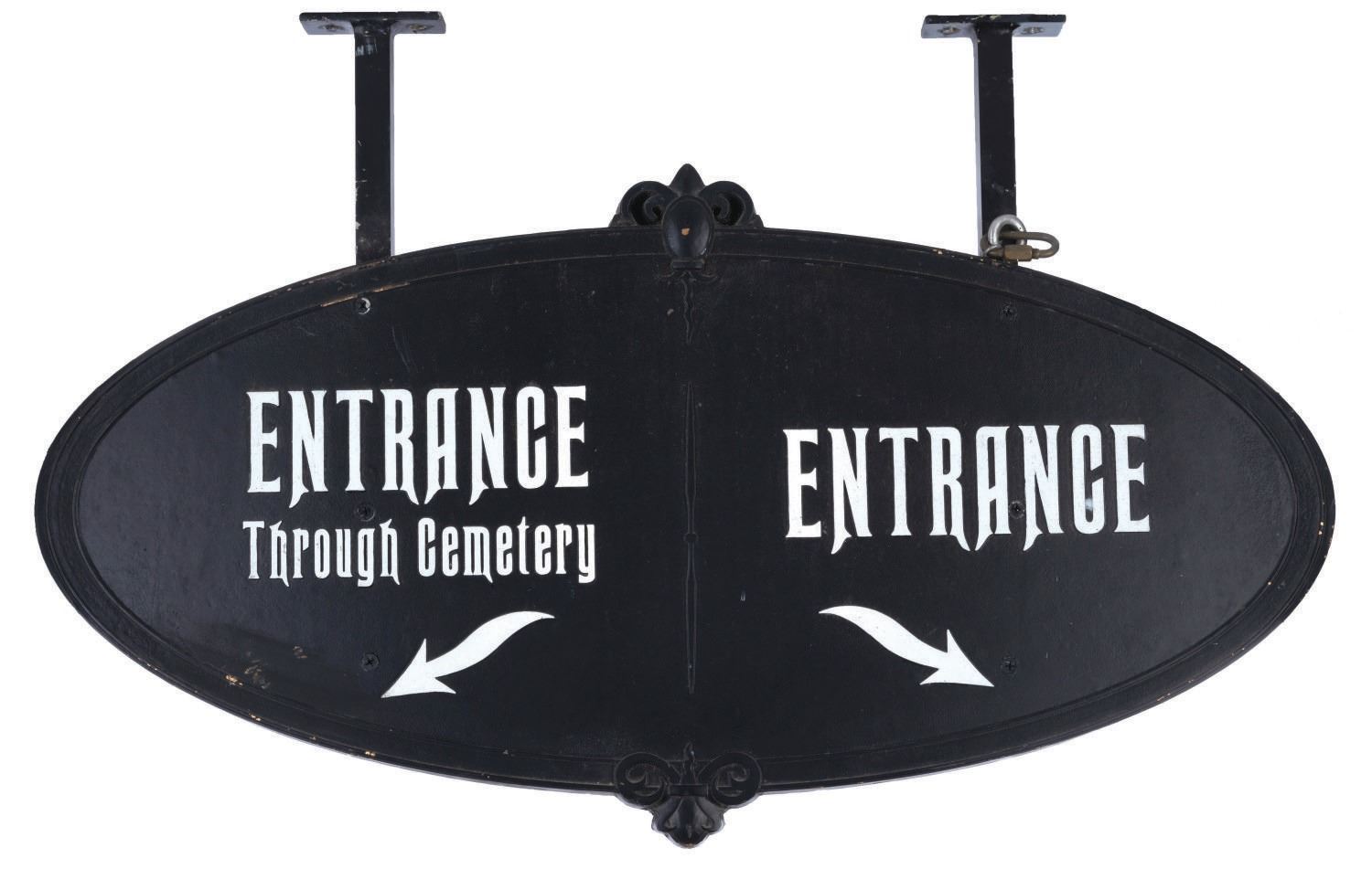 (Walt Disney World, 2011-20s) A sign directing Guests toward the two queues of The haunted Mansion in Liberty Square at The Magic Kingdom. The overhead sign was added with the introduction of The Haunted Mansion Interactive Queue through the Cemetery. Measuring 36"x24" and 2.25" deep, the metal sign is in very good condition with scuffs, scratches, and wear from exposure, handling, and age.
