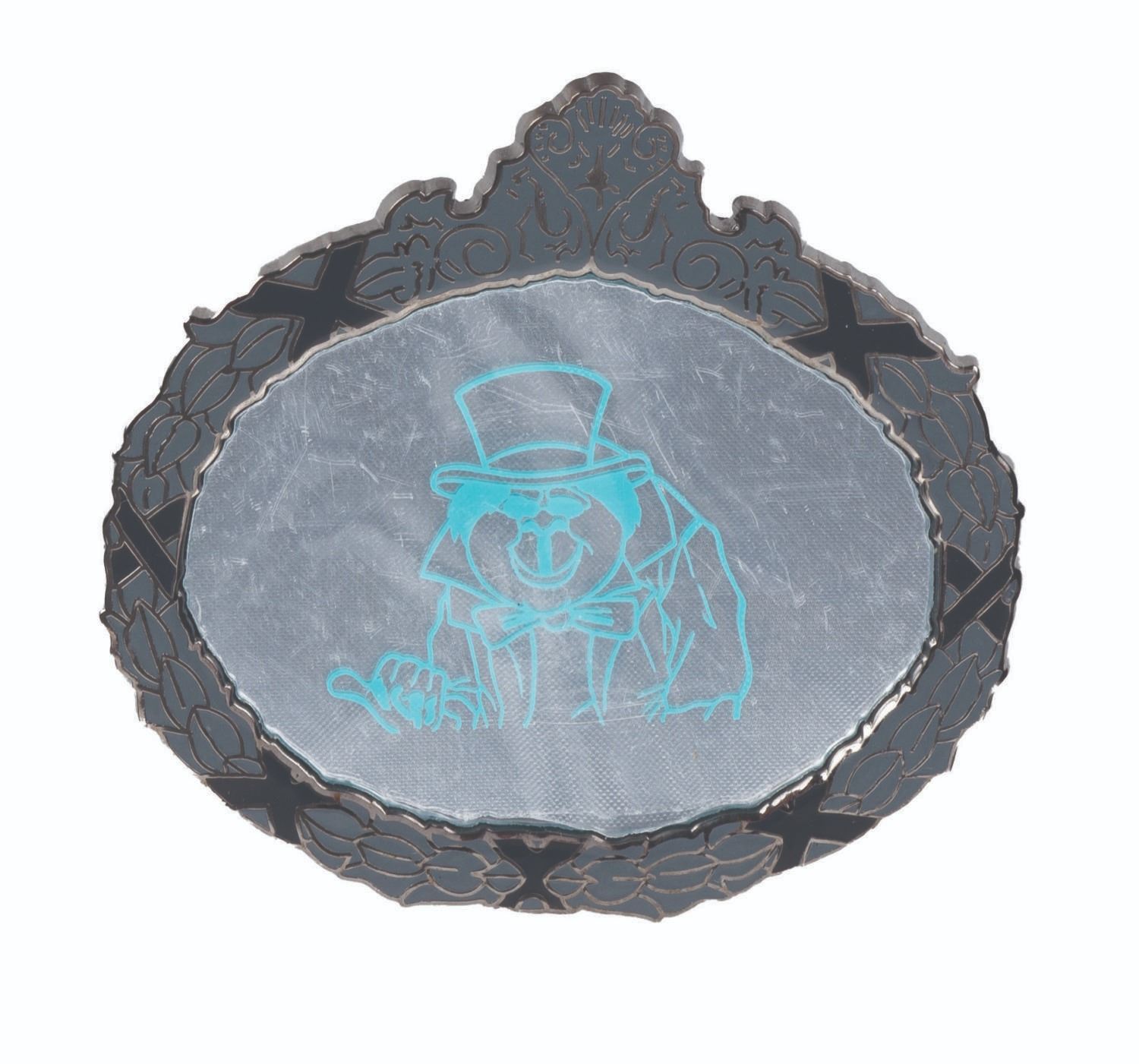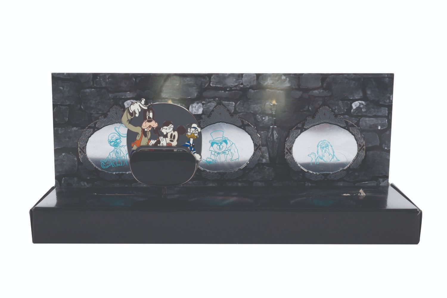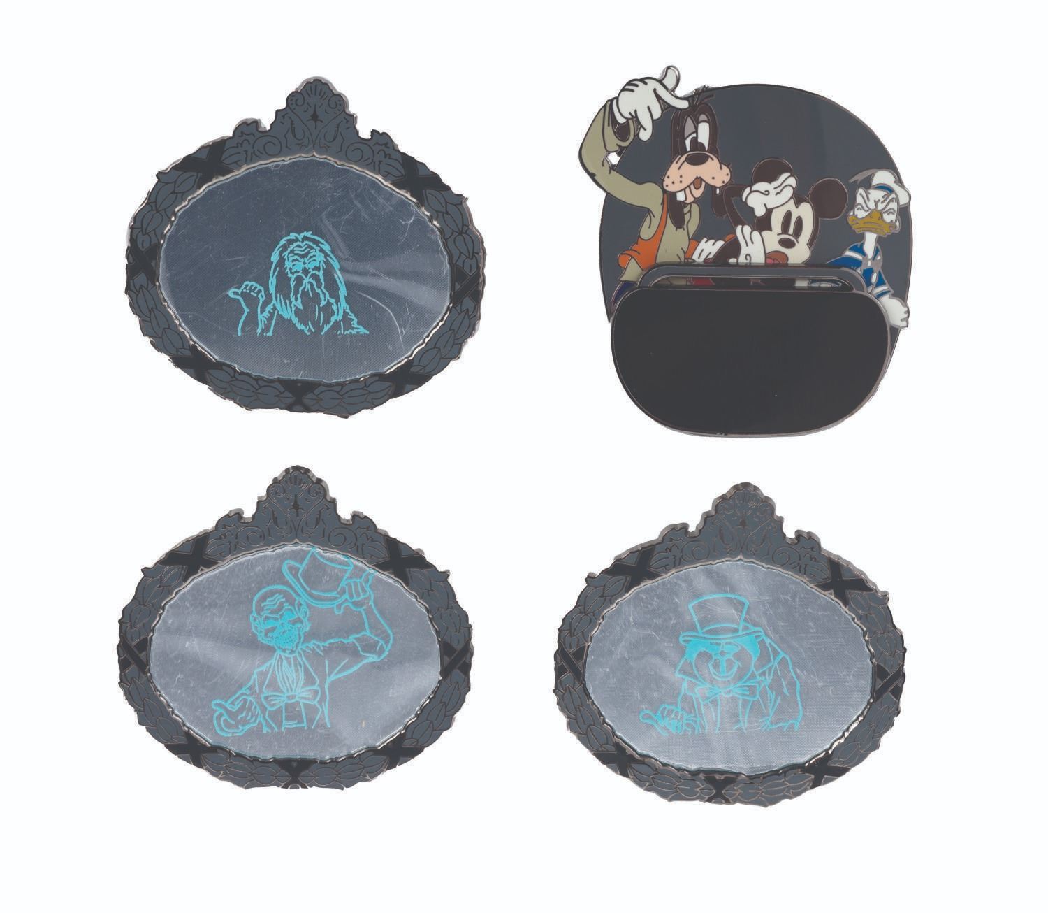 (WDI, 2005) A Haunted Attraction Collection 4-piece pin set released exclusively for Walt Disney Imagineering. The pins featuring the Hitchiking Ghosts, Mickey, Donald and Goofy, are displayed on a diorama with sliding action. Measuring from 2.5" x 2" to 2" x 2", the pins and diorama display in fine as-new condition.