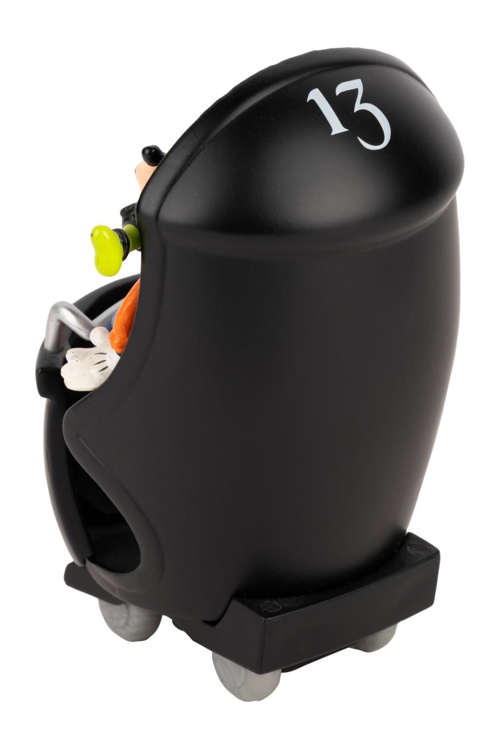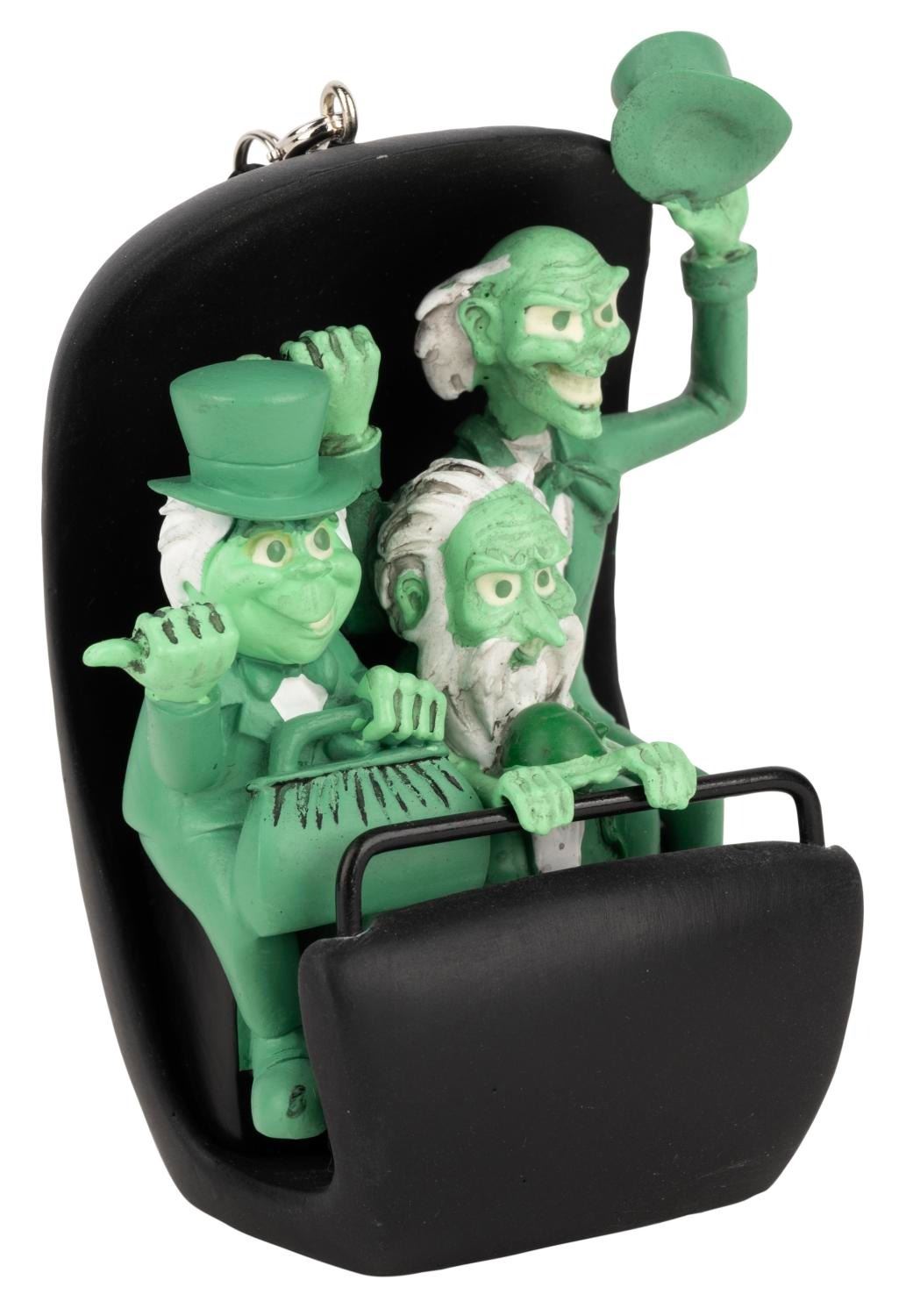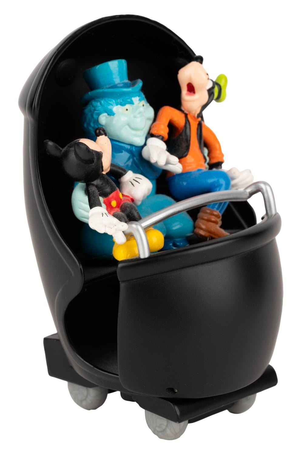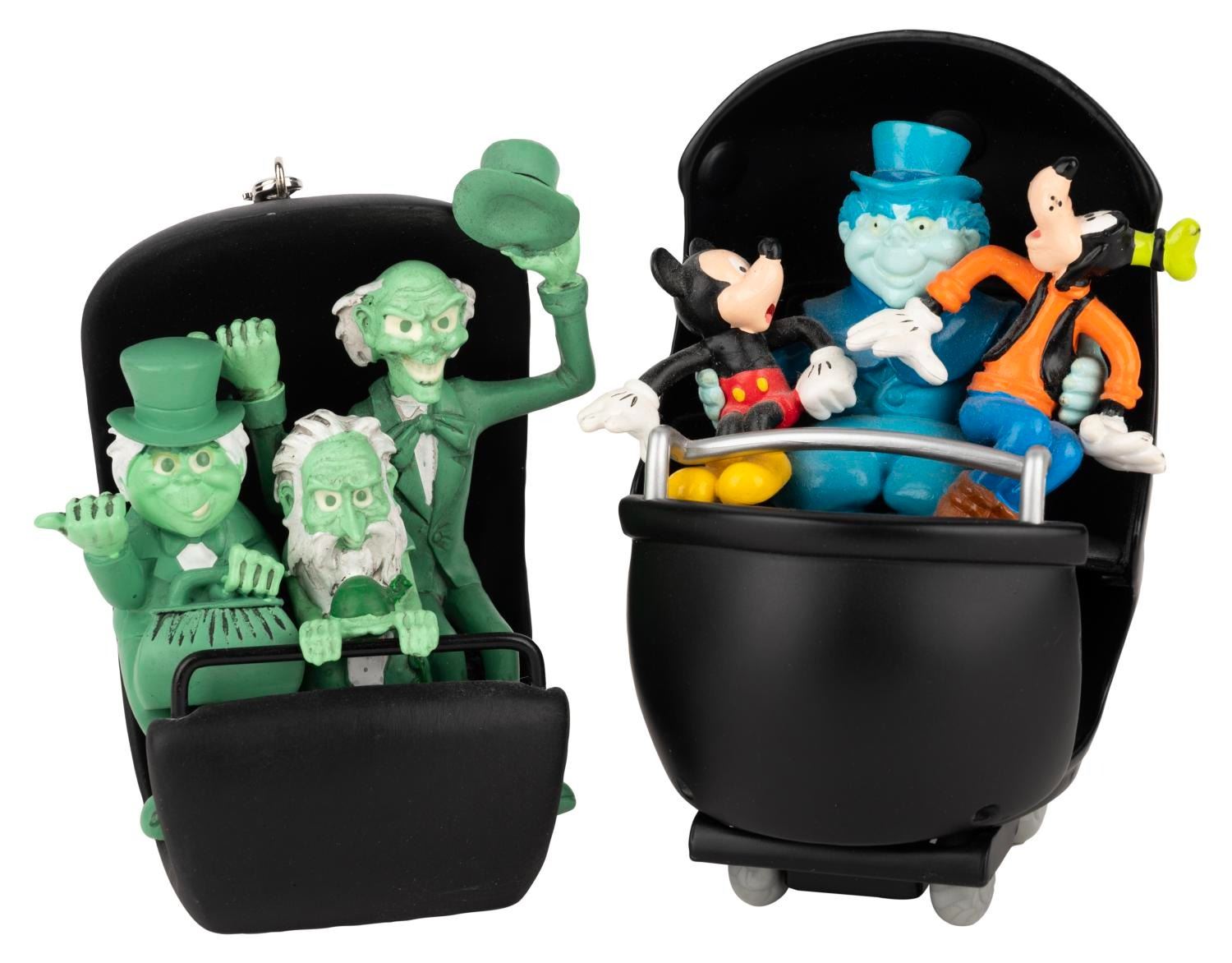 (Disney Parks/Disney, 2000s) A hand-painted Hitchhiking Ghosts ornament and die-cast Doom Buggy attraction vehicle toy featuring Mickey, Goofy, and Phineas. The ornament measures 2.75” x 2” x 3.75” and the die-cast Doom Buggy measures 2.5” x 2.75” x 4” tall, both in very good condition with light scratches and wear.