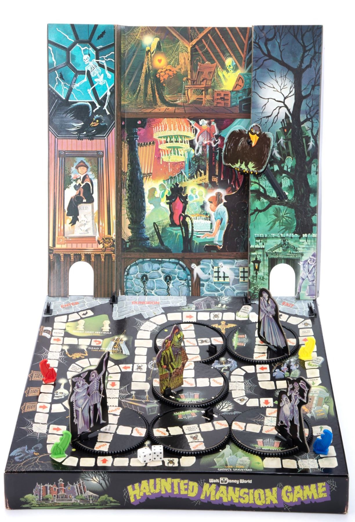 (Disney/Lakeside, 1975) A complete copy of the very rare Lakeside Walt Disney World Haunted Mansion Game. Included are all (4) Doom Buggies, (4) spinning spooks, (6) turntable inserts, (2) original dice, (4) backdrop supports, and the backdrop with extension and raven, box, and game board. The game is in fine condition, with only slight wear to the box exterior typical of handling. The interior pieces all appear unused, with only the bottom tabs of the backdrop showing the slight wear of having been assembled.