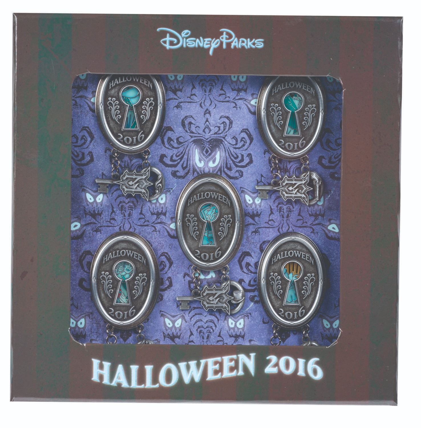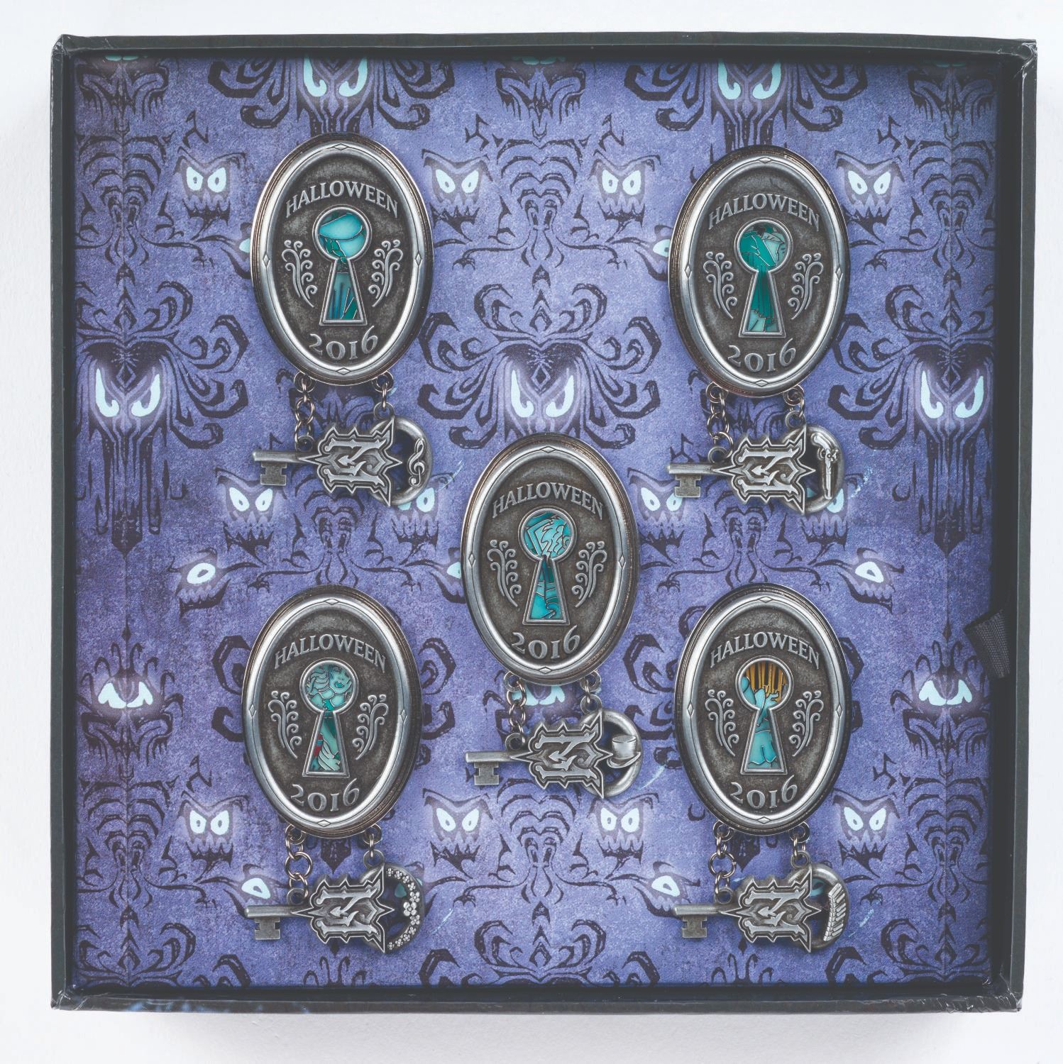 (Disney Parks, 2016) A Haunted Mansion five pin set released for Halloween 2016. The set includes The Bride, Hatbox Ghost, Opera Singers, Dueling Ghosts, and Organist, each concealed by a swiveling keyhole with a unique, dangling key charm. Four of the pins were limited to an edition of 5000 with the Hatbox Ghost Completer pin exclusive to this box-set and limited to an edition of 1000. Each pin is in fine as-new condition within the original box.