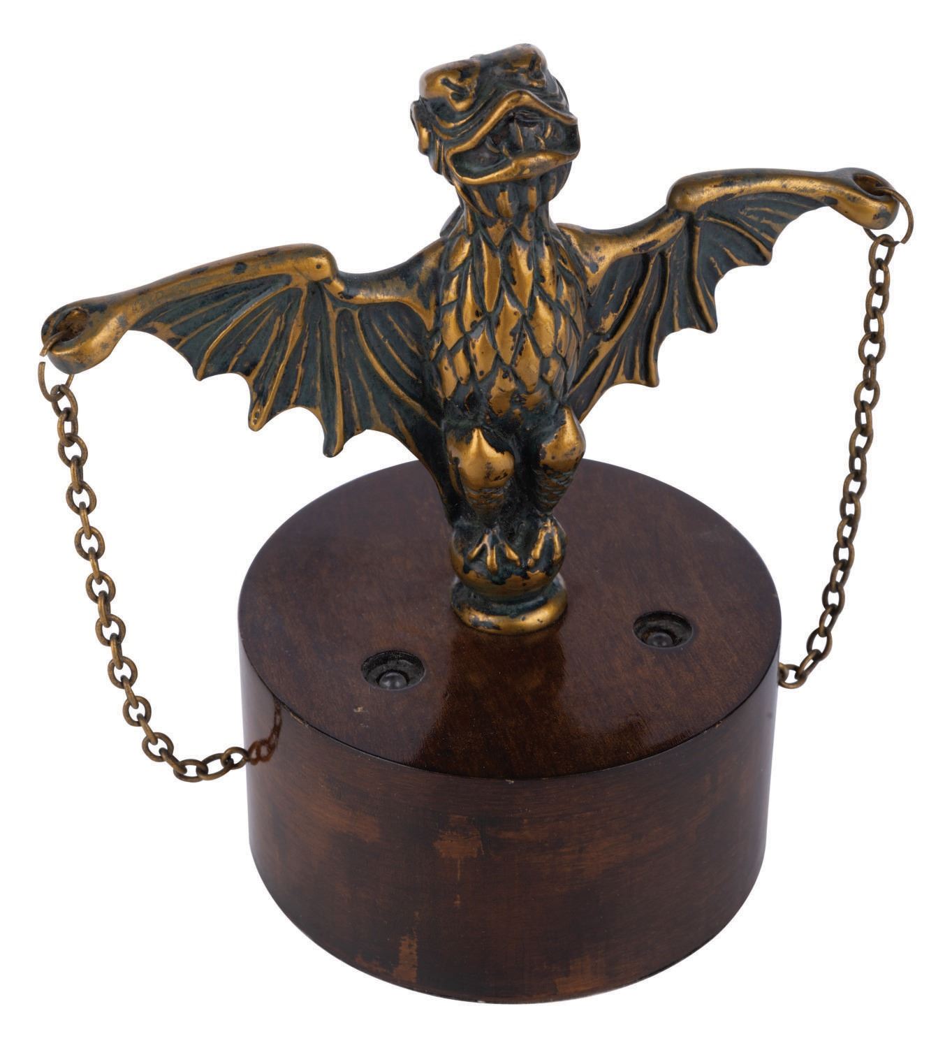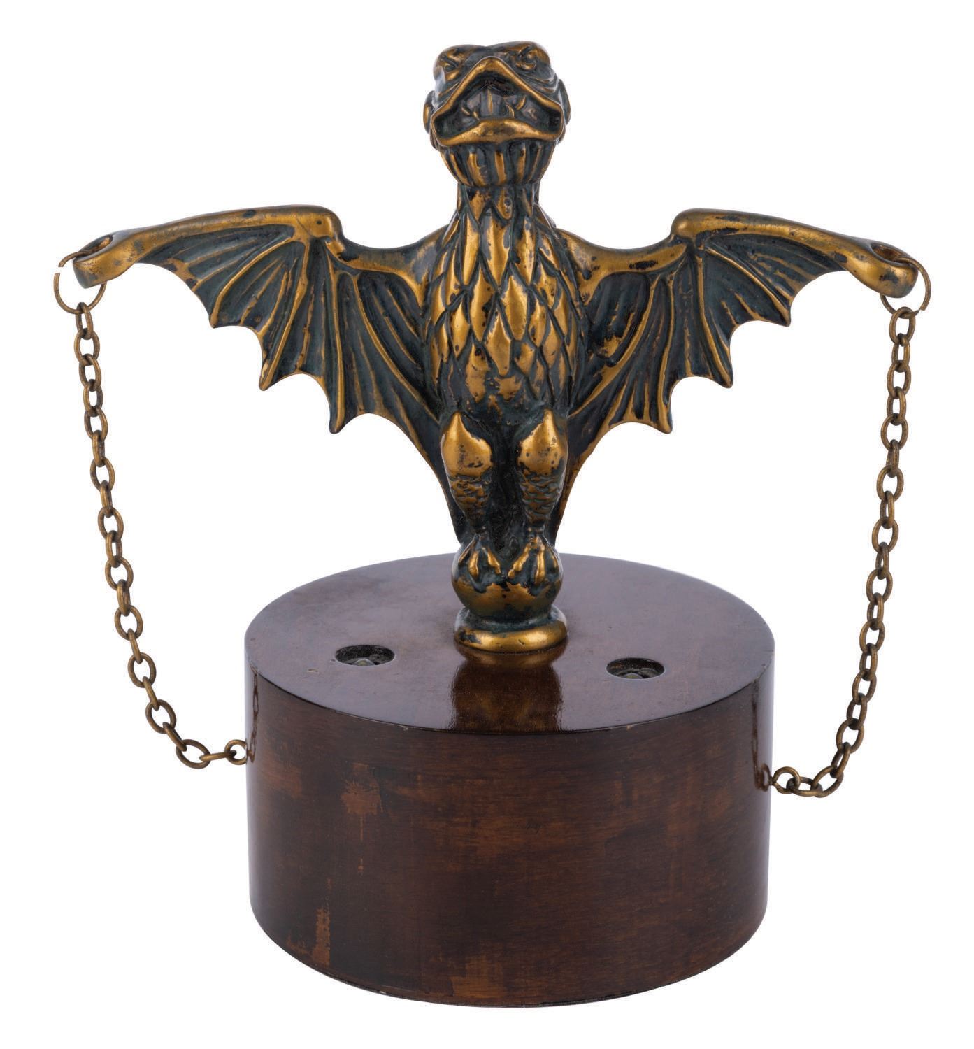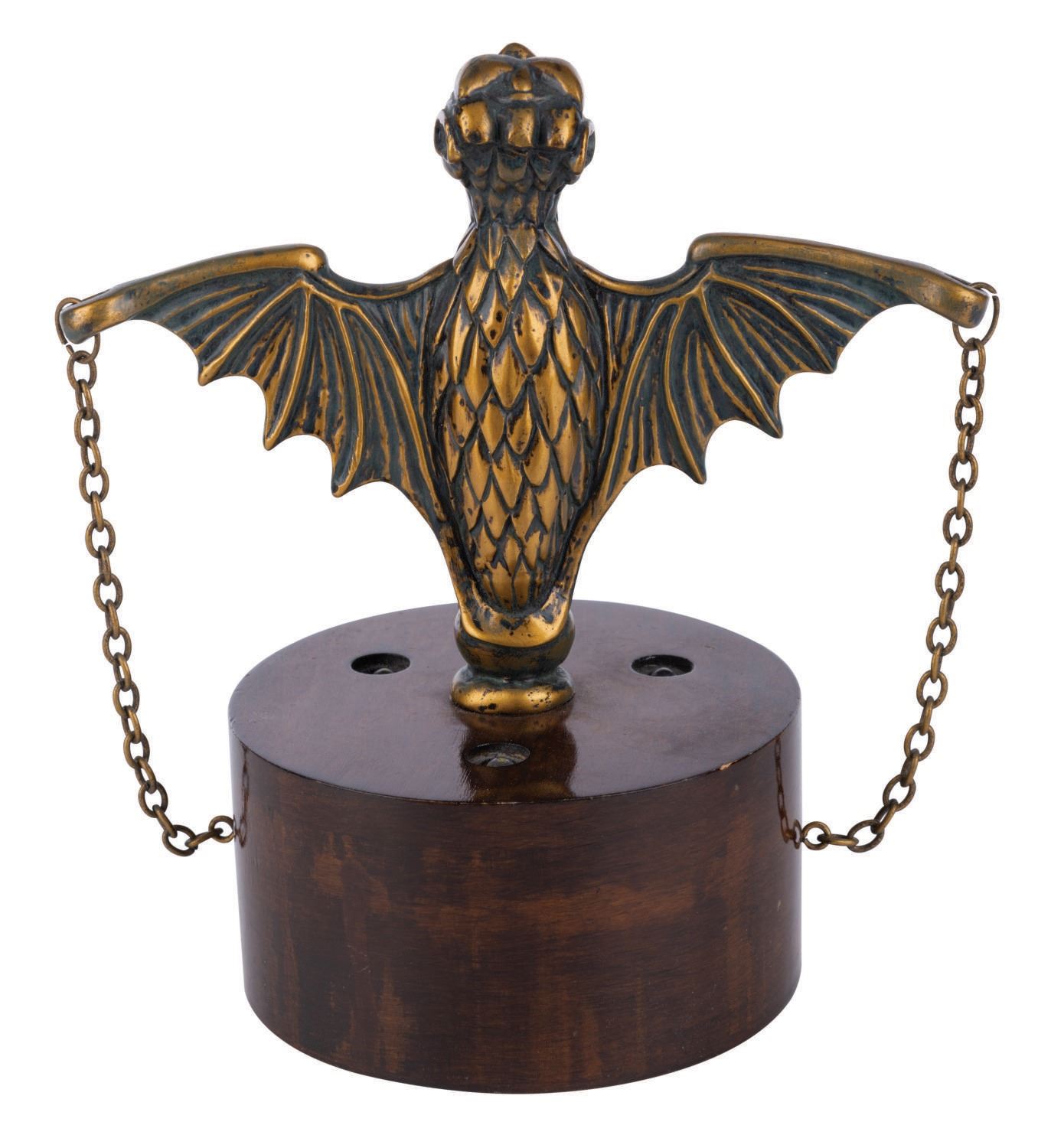 (Walt Disney World, 2004) A limited edition bat stanchion figure created for the Magic Kingdom exclusive 999 Happy Haunts event. The bat is composed of cast metal and affixed to a wooden base with integral LED lights. Only 250 of these figures were created, and the felted bottom of the base is stamped in silver with event and edition statements. The electronics have been tested for function and are operational. Measuring 6.5"x6" and 3.75" deep, the piece is in very good condition with minor wear.