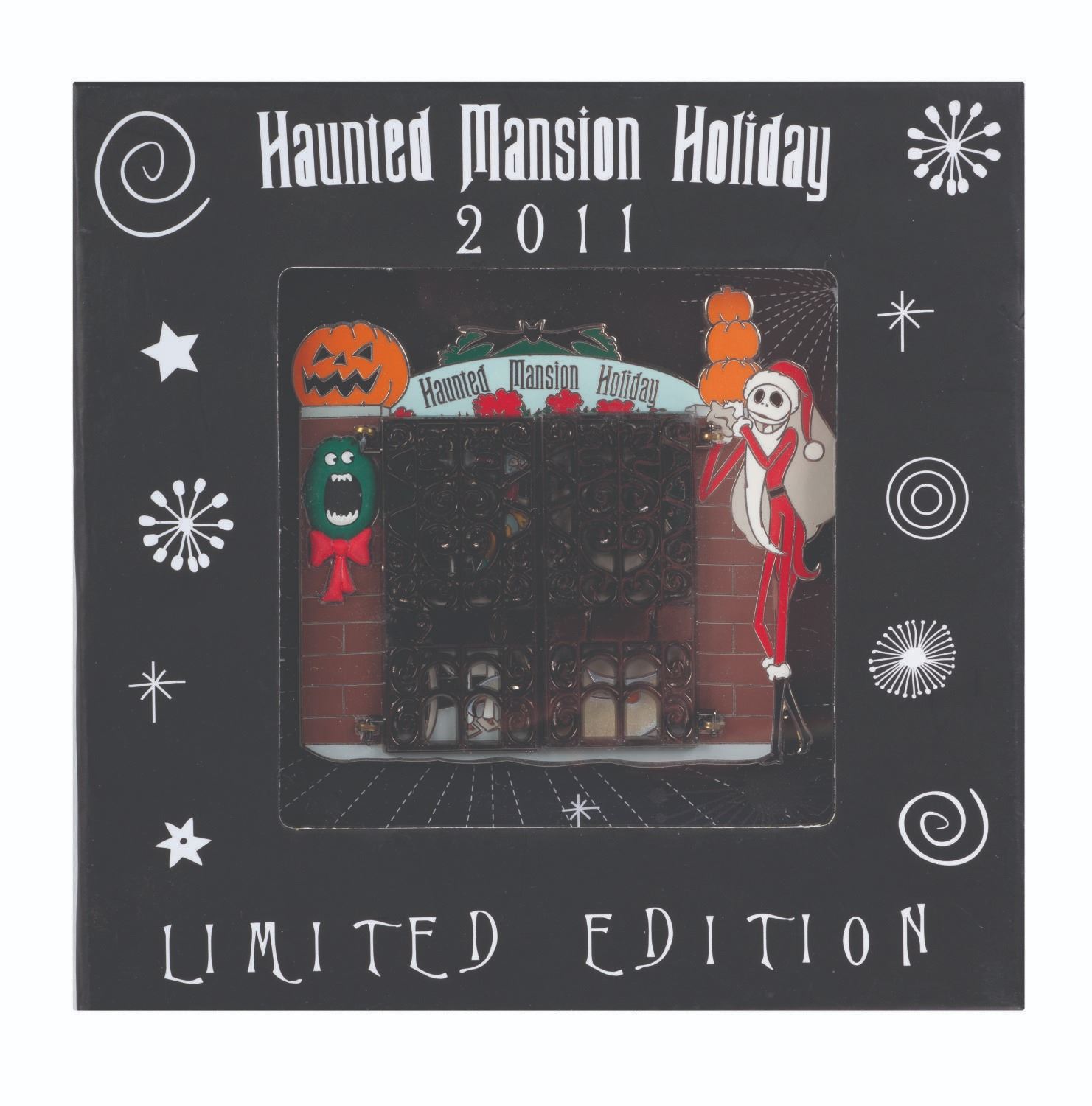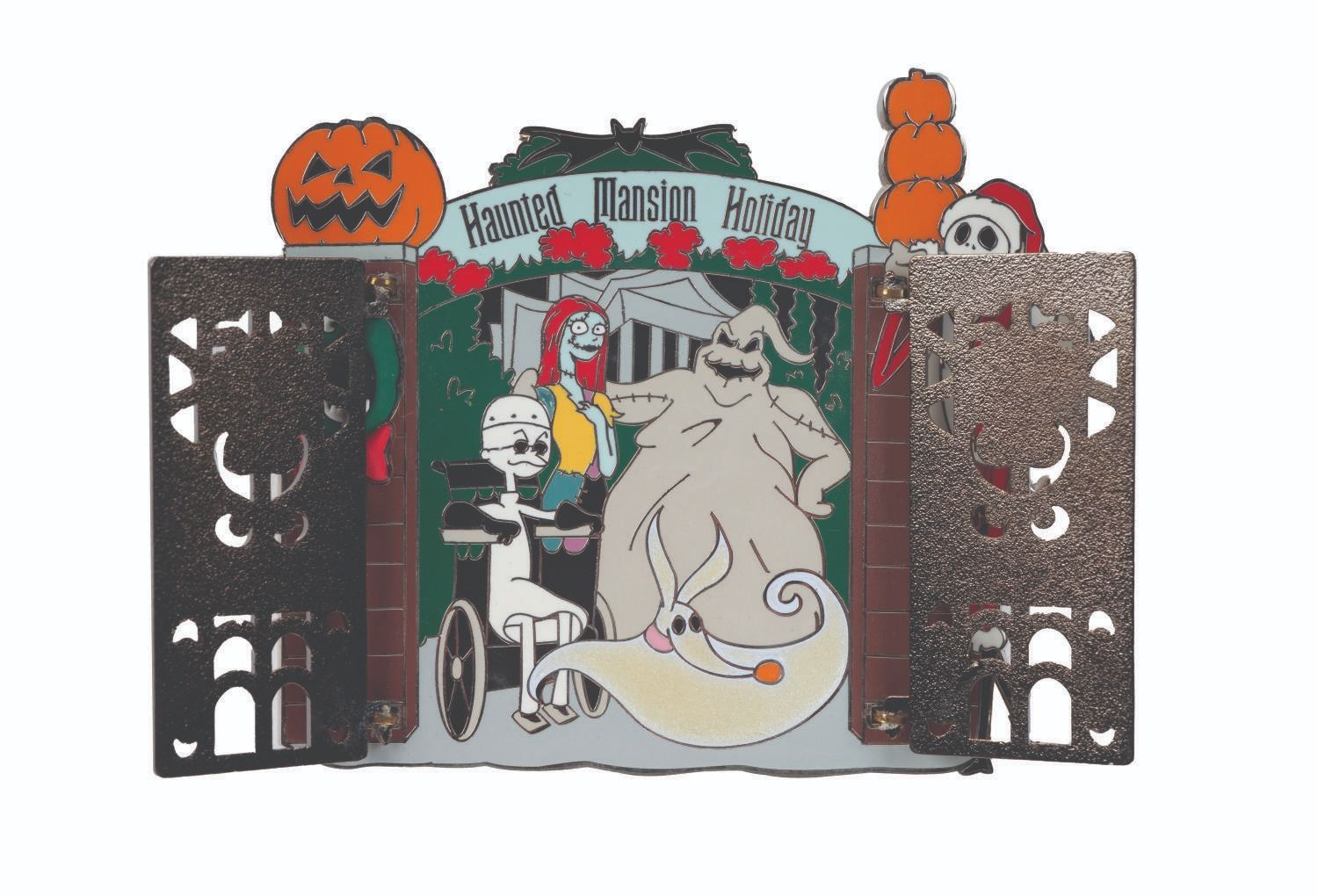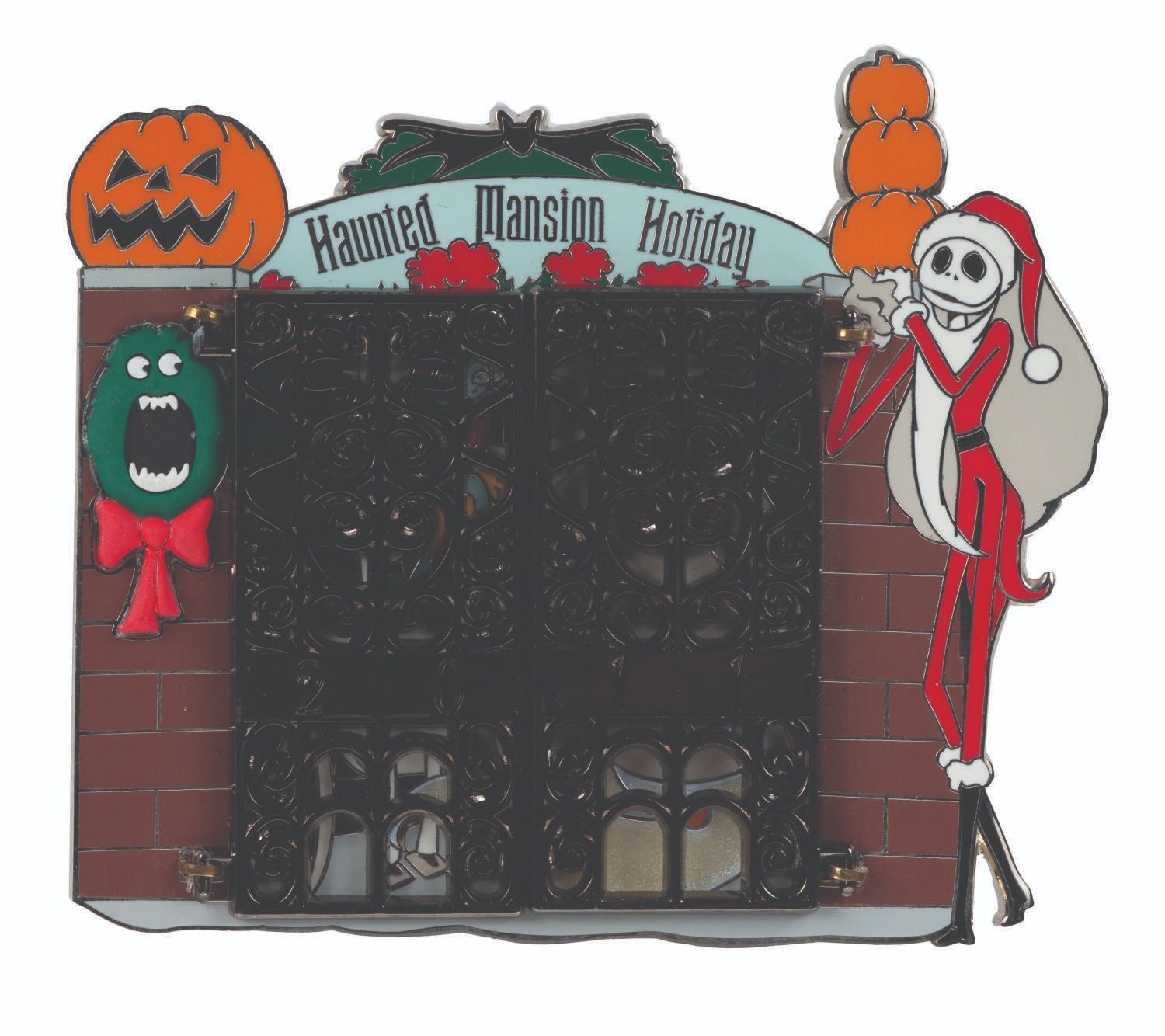 (Disneyland, 2011) A Haunted Mansion Holiday pin with hinged gates that reveal Jack Skellington and other characters from “Tim Burton’s The Nightmare Before Christmas.” Measuring 2.5" x 3", the pin is in fine as-new condition within its original 5" x 5" and 1" deep box.