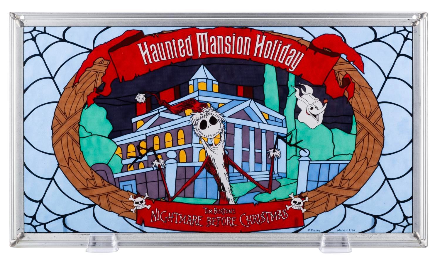 (Glassmasters, 2000s) A framed Haunted Mansion Holiday stained glass artwork featuring Jack Skellington dressed as Sandy Claws from "Tim Burton's The Nightmare Before Christmas." Measuring 7.75" x 13.5", the stained glass is in very good condition with light scratches and wear on the metal frame.