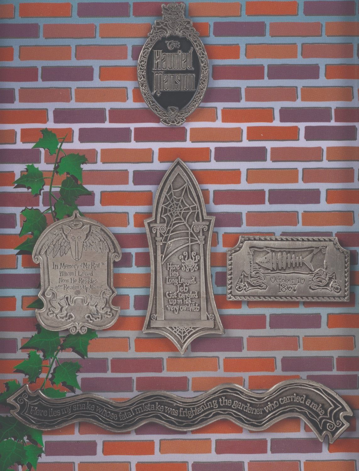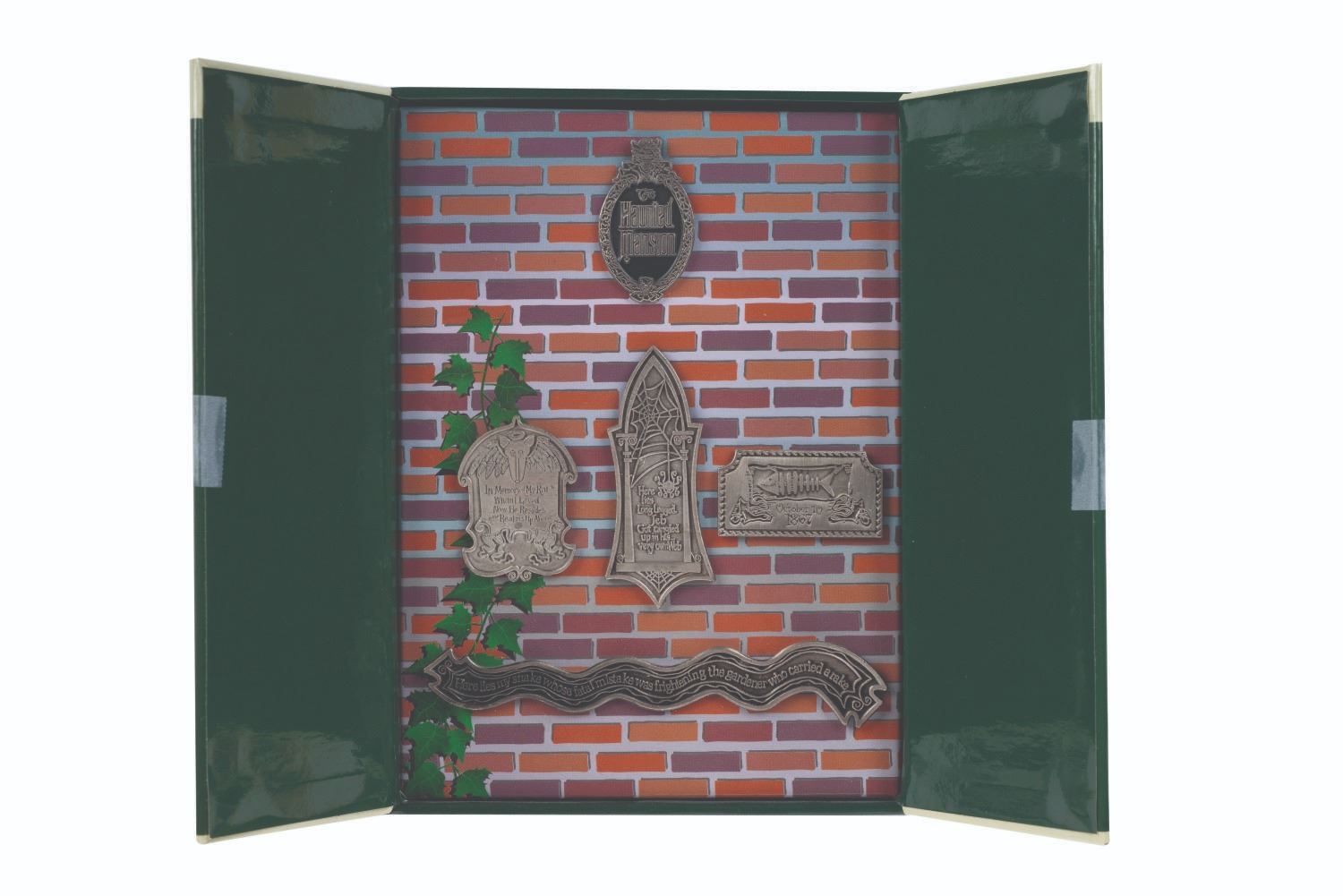 (Disneyland, 2009) A Pet Cemetery Tombstones five pin set in the original box. The pins include pet epitaph headstones and the Haunted Mansion gate plaque. Released in an edition of 5000, the pins measuring from 1.5" x 1" to 0.5" x 4.25" are mounted within their original 6.75" x 7.25" and 1" deep Mansion Gate box. The set is in fine condition.