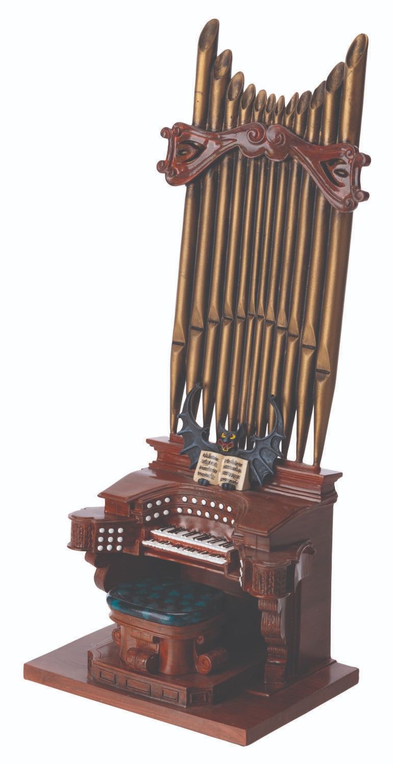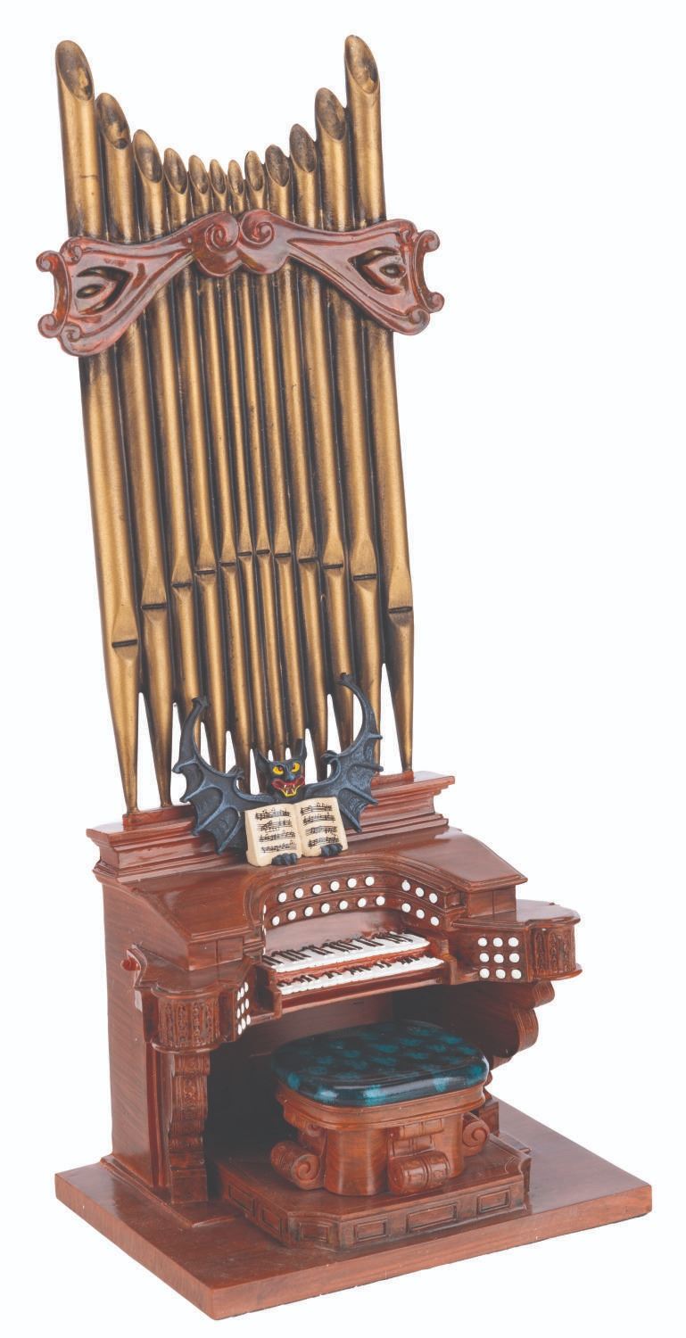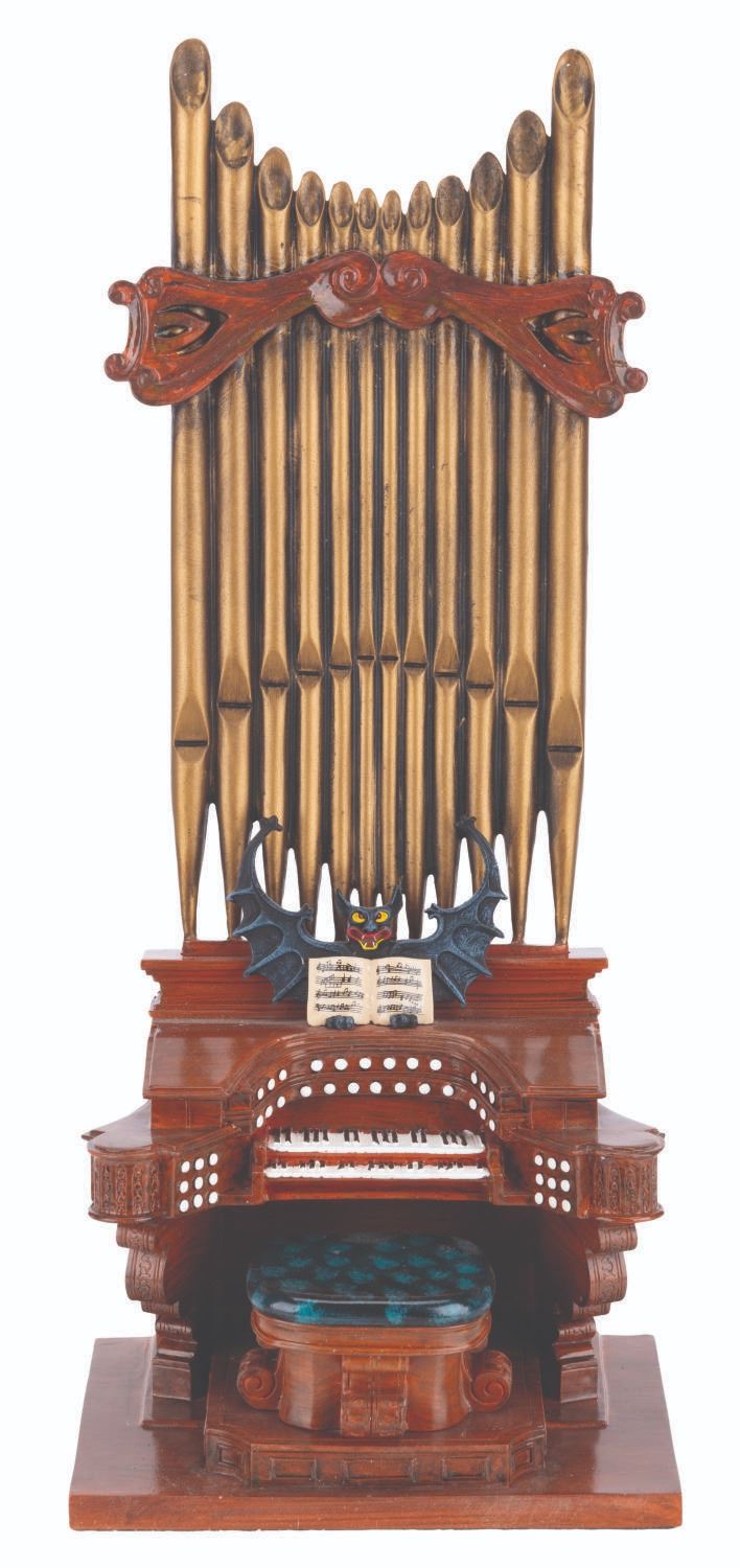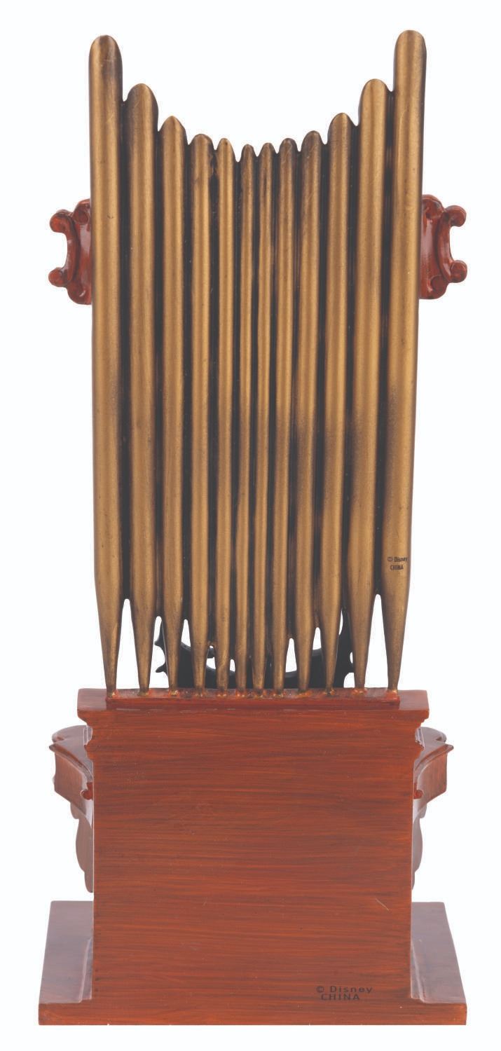 (Walt Disney World, 2004) A limited edition resin figure of the iconic organ from the Haunted Mansion featuring a hidden compartment revealing a pin of the organ’s sheet music. This figure was offered at the 999 Happy Haunts event and limited to only 1330 pieces. The 10.5” x 4.5” x 3.25” deep sculpture and 1” x .5” pin are in very good condition with light wear from display. The pipes are a separate piece that attach to the organ base but do not fit tightly and securely. The organ is packaged in its original 9” x 6.5” x 5.5” deep box in good condition with moderate shelf wear.