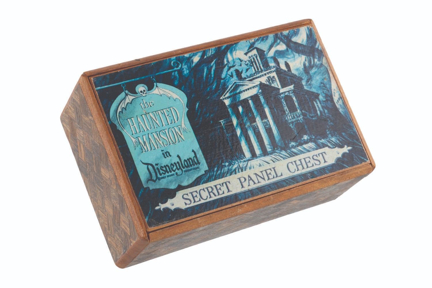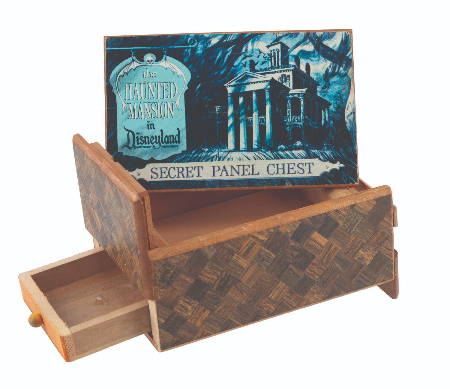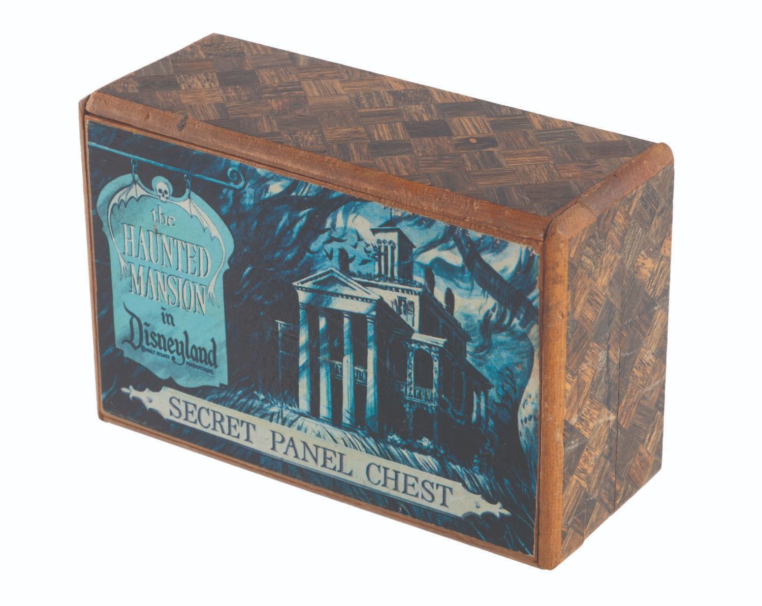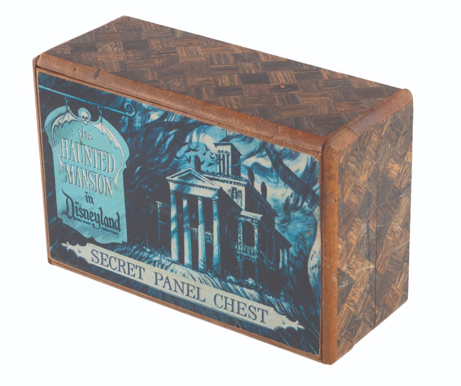 (Disneyland, 1970s) A very rare small-sized Haunted Mansion Secret Panel Chest puzzle box from Disneyland. A hidden latch on the side opens in a specific pattern to reveal a large hidden compartment on top, and a secret drawer in the side of the chest. This very charming and intricately built item measures 5.5" x 3.5" and 2.25" tall, and displays in good condition with light wear.