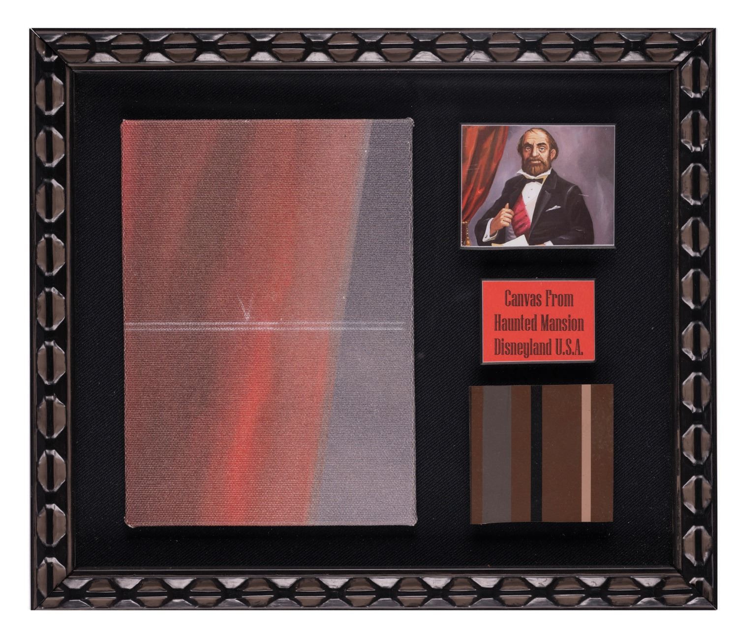 (Disneyland, 1980s-90s) A fragment of painted "wallpaper" and canvas from the Alexander Nitrokoff Stretching Room Portrait prop in The Haunted Mansion at Disneyland. The props were removed from the memorable show scene during a rehabilitation and mounted for display within a shadowbox frame. Measuring 5.75"x8" within a 13.25"x11.5" frame, the piece is in very good condition with wear from display, handling, and age.