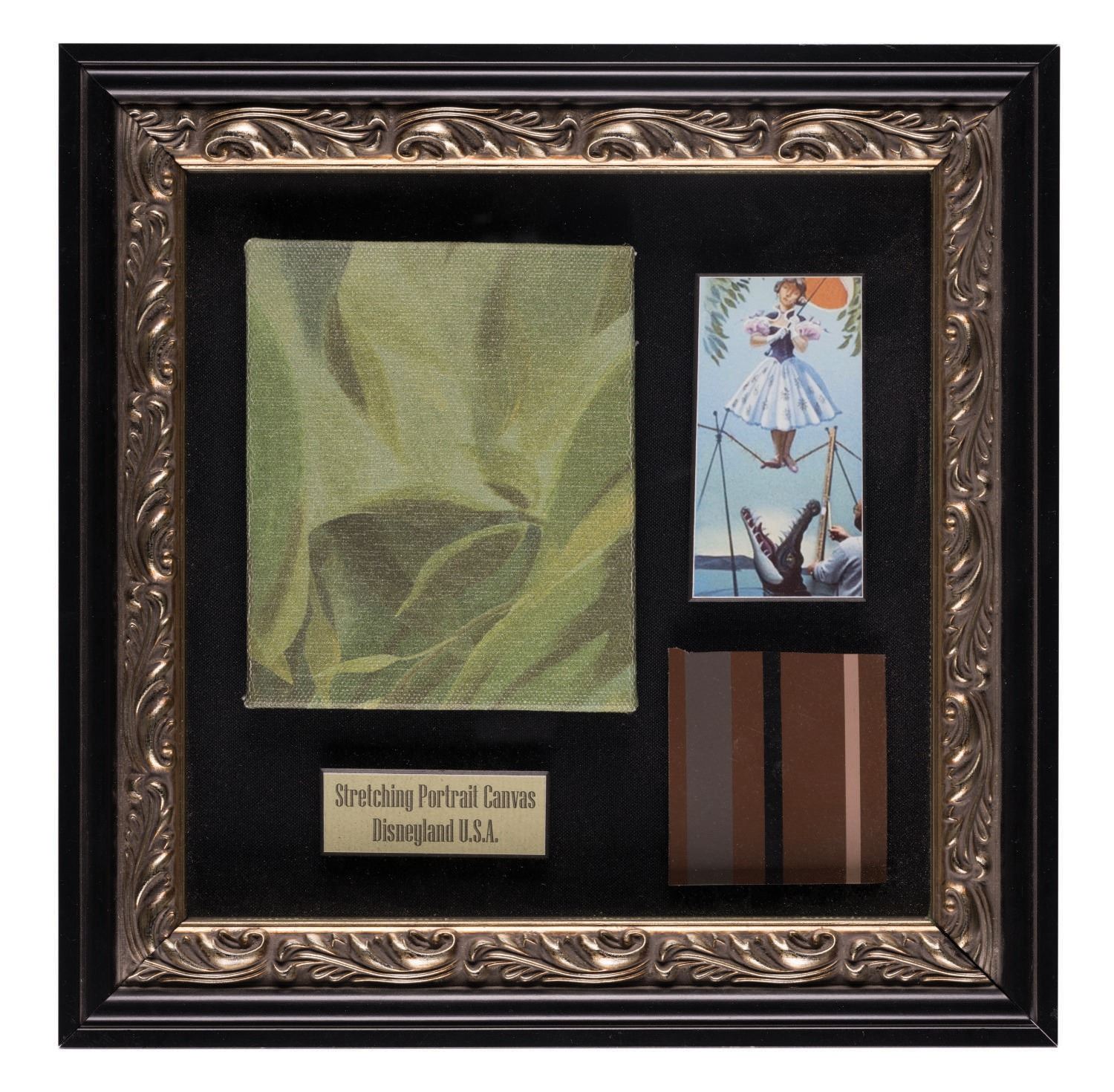 (Disneyland, 1980s-90s) A fragment of painted "wallpaper" and canvas from the Sally Slater Stretching Room Portrait prop in The Haunted Mansion at Disneyland. The props were removed from the memorable show scene during a rehabilitation and mounted for display within a shadowbox frame. Measuring 4.75"x5.75" within a 12"x12" frame, the piece is in very good condition with wear from display, handling, and age.