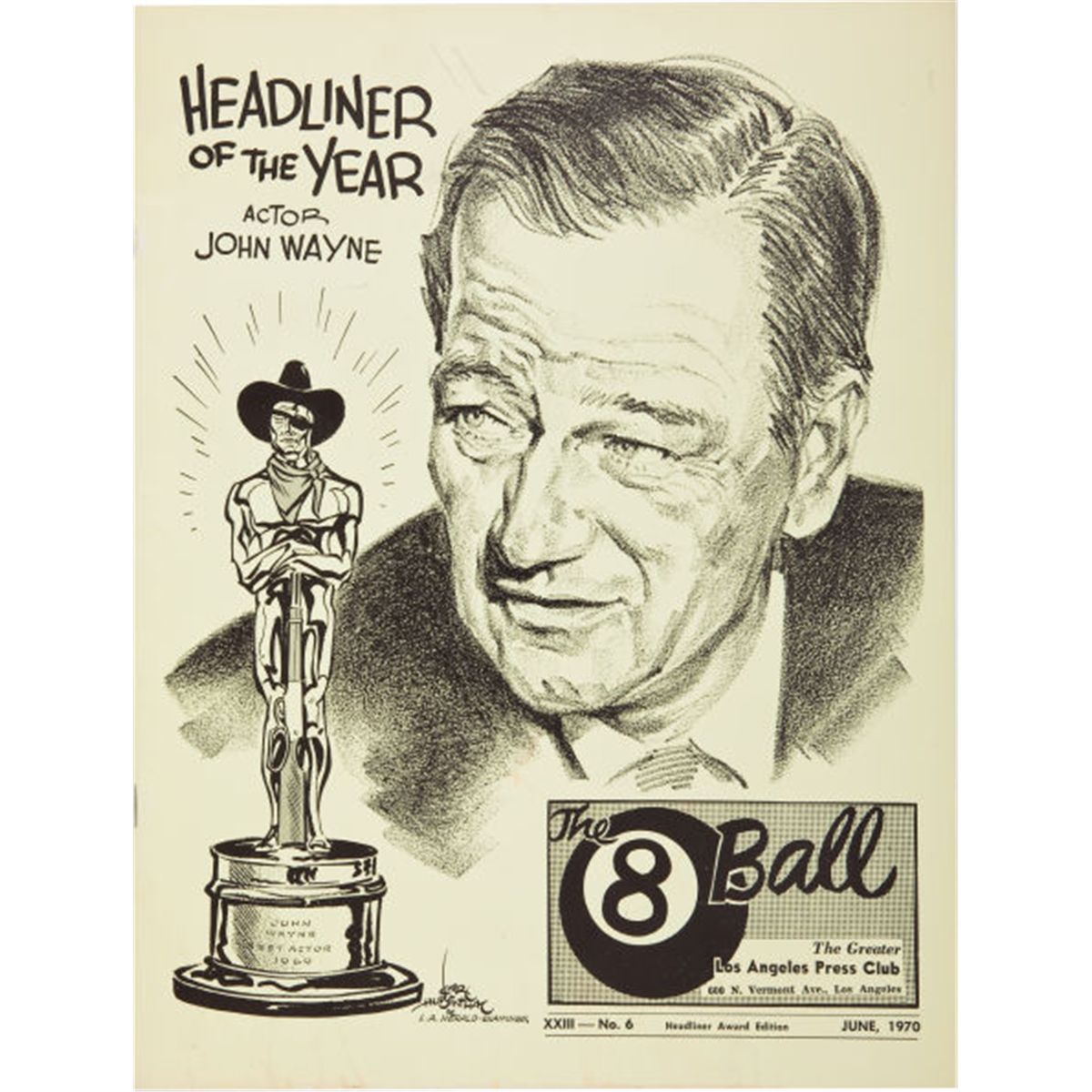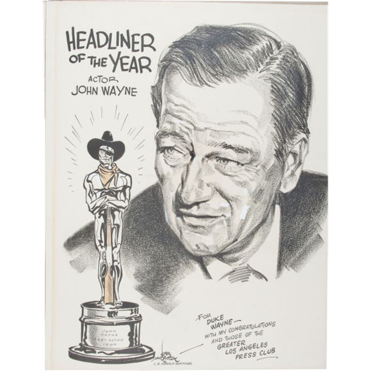 A 'Headliner of the Year' Drawing by Karl Hubenthal, 1970. Rendered in charcoal and pen and ink on board; image depicts Wayne looking at his Oscar which is dressed up like "Rooster Cogburn;" signed in the lower right corner in black ink "For / Duke / Wayne - / With My Congratulations / And Those of the / Greater / Los Angeles / Press Club / Karl Hubenthal / L.A. Herald-Examiner;" included is the June 1970 issue of "The 8 Ball" [the Greater Los Angeles Press Club's newsletter] featuring this same image on the cover. (Please note there is slight yellowing from when this piece was in a different frame.)Matted and Framed: 26" x 21"; Work Only: 18" x 14"