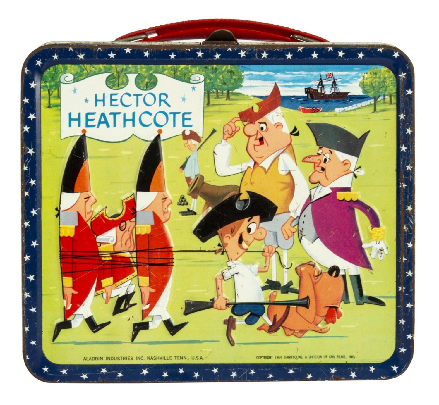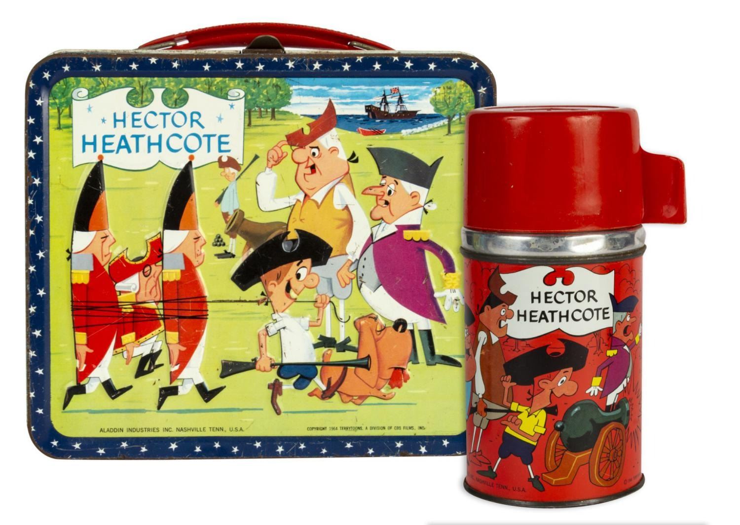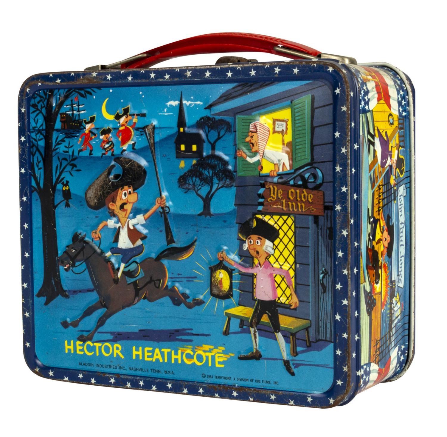 (Aladdin, 1964) A rare lunch box featuring Terrytoons character Hector Heathcote. The pint-sized Hector Heathcote is seen aiding American Revolutionary heroes on the panels of the lunch box. The lunch box measures 8" x 3.75" x 8" tall, and the thermos is 6.5" tall and 3.25" in diameter, both in good condition with scratches, wear, and oxidation from age.