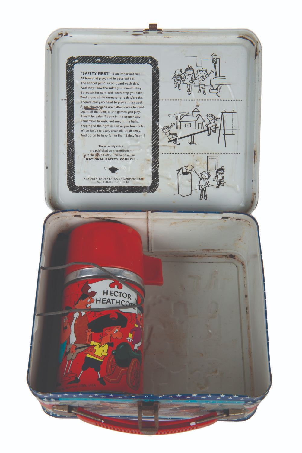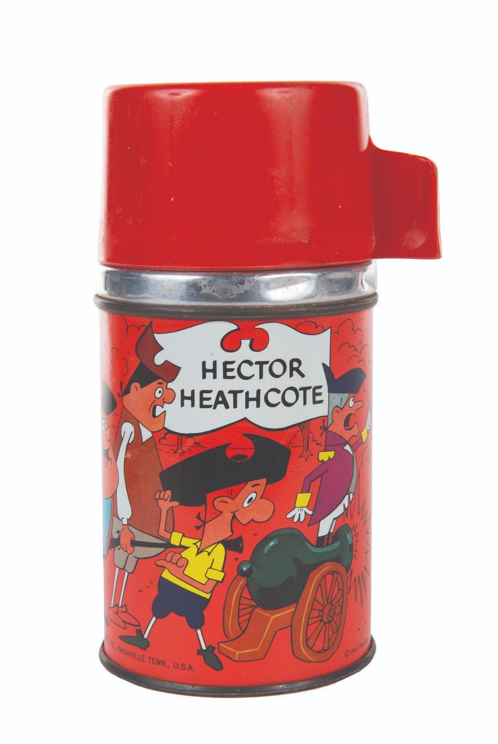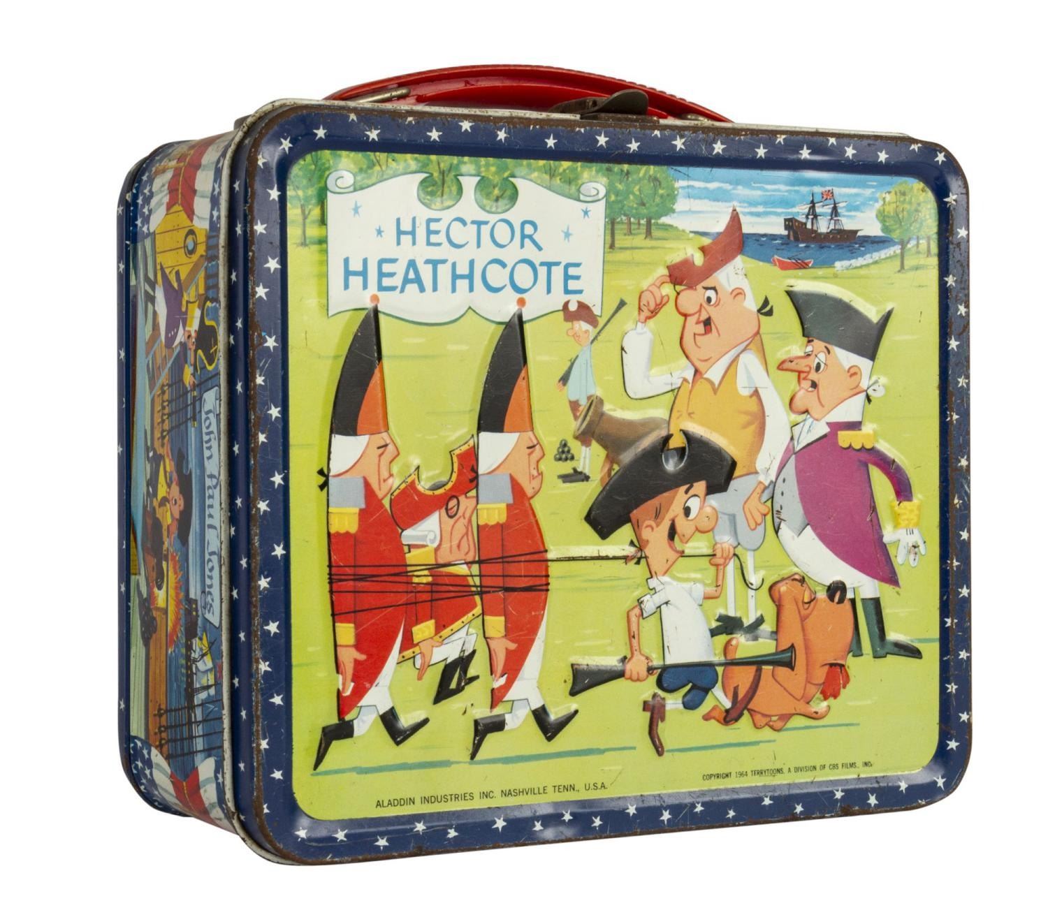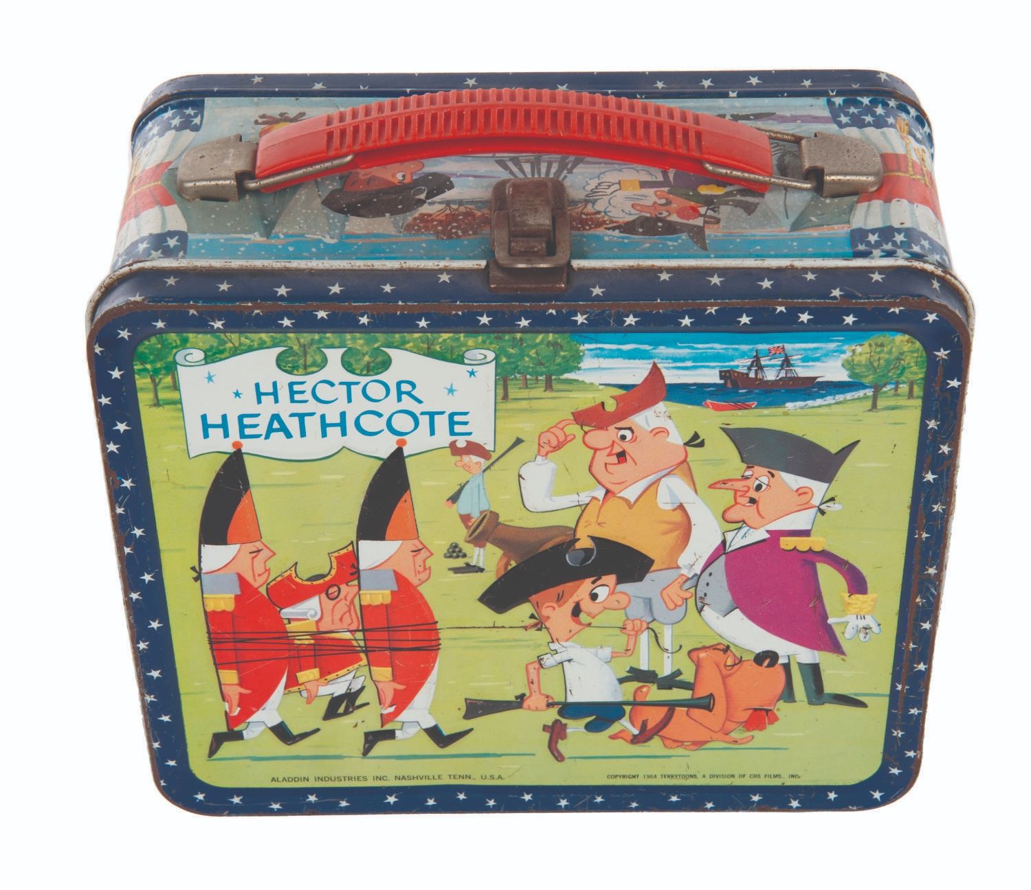 (Aladdin, 1964) A rare lunch box featuring Terrytoons character Hector Heathcote. The pint-sized Hector Heathcote is seen aiding American Revolutionary heroes on the panels of the lunch box. The lunch box measures 8" x 3.75" x 8" tall, and the thermos is 6.5" tall and 3.25" in diameter, both in good condition with scratches, wear, and oxidation from age.