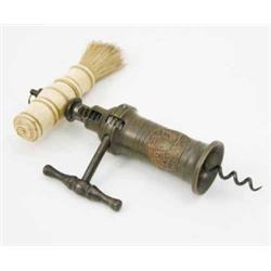 A Heeley Kings-screw mechanical corkscrew, with turned bone handle and brush, steel side handle, the brass barrel with applied Royal Coat of Arms signed Heeley, 8 ins. £250-300