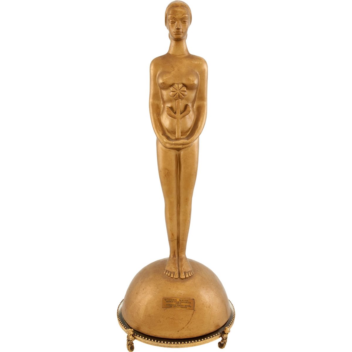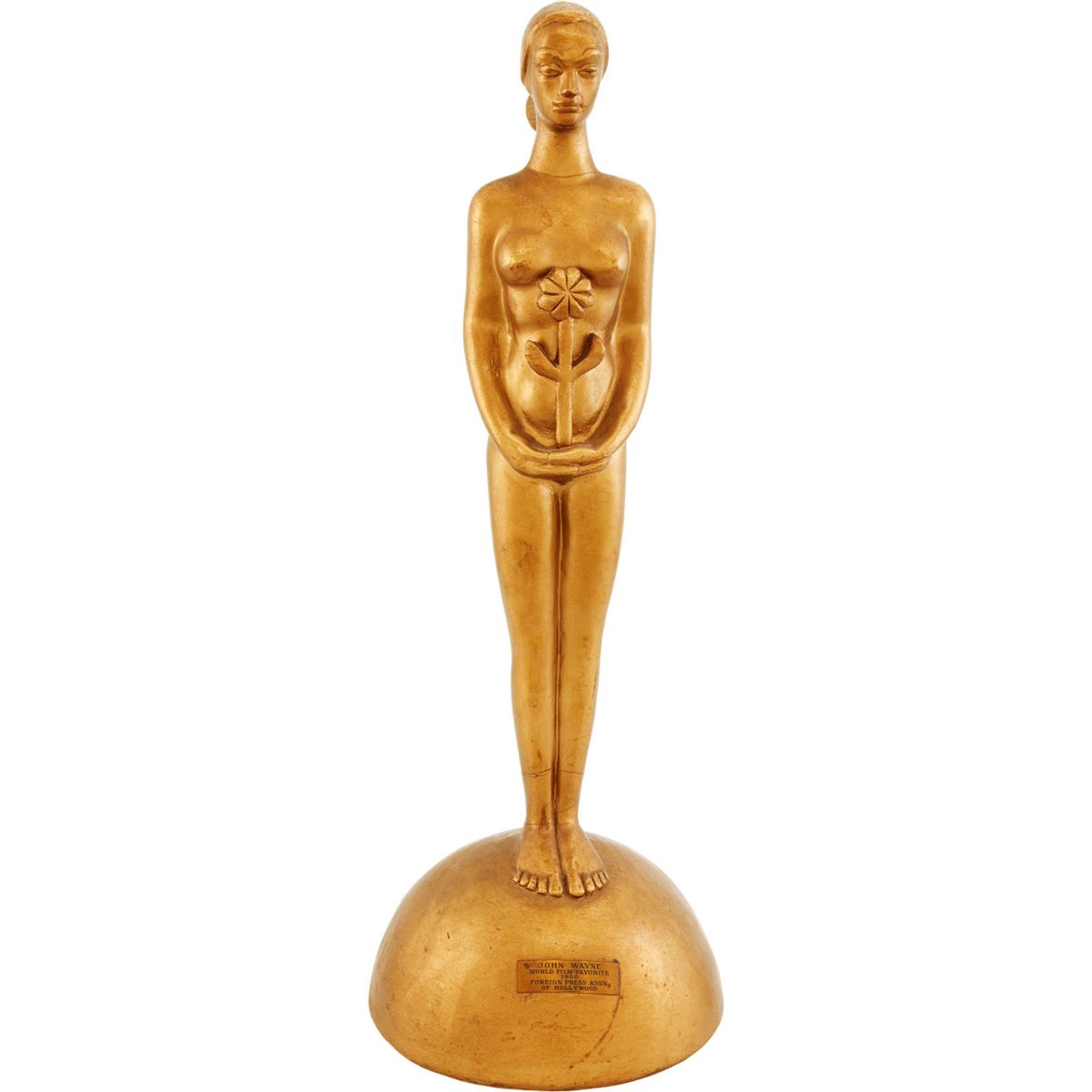 A 'Henrietta' Award, 1952. In the form of a nude woman atop a semi-globe, made of ceramic painted gold, placard on front reads "John Wayne / World Film Favorite / 1952 / Foreign Press Assn / of Hollywood," back signed by artist "A. Katcha Makoff;" included with a circular mirrored base that Wayne used for its display. (Please note the statuette shows repair work at the neck and ankles.)Height: 25"The Hollywood Foreign Press Association gave out these 'Henrietta' awards from 1950 until they retired the category in 1979, though the design of the 'Henrietta' had changed from this early 'female' form to the more standard 'Golden Globe' form many years beforehand. This style of the award is quite rare.