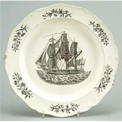 A Herculaneum creamware ship plate, with shaped rim, printed in black with a view of an American...