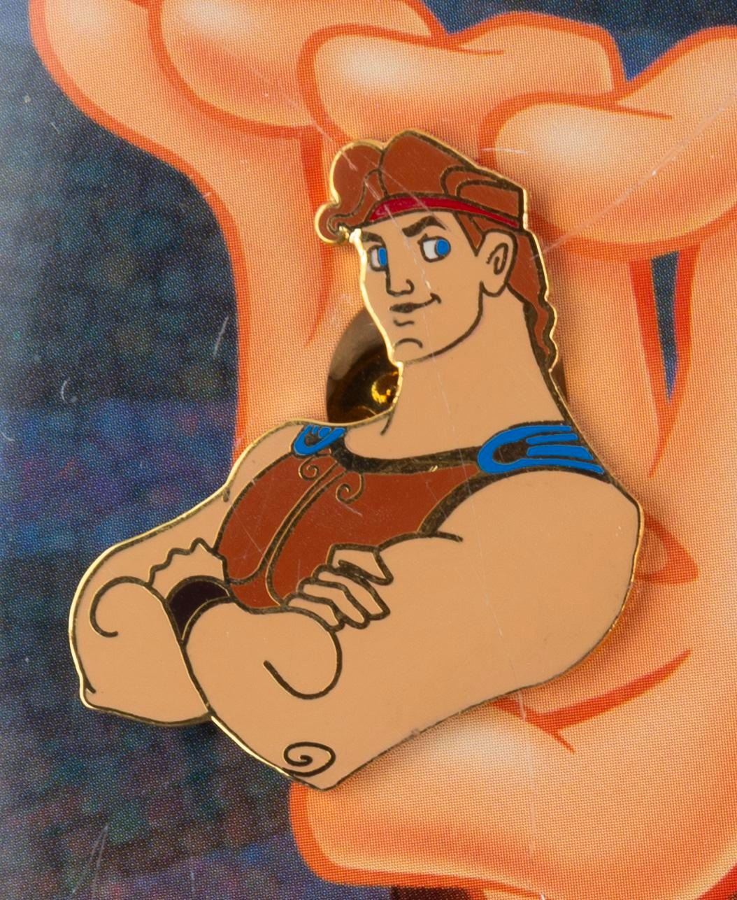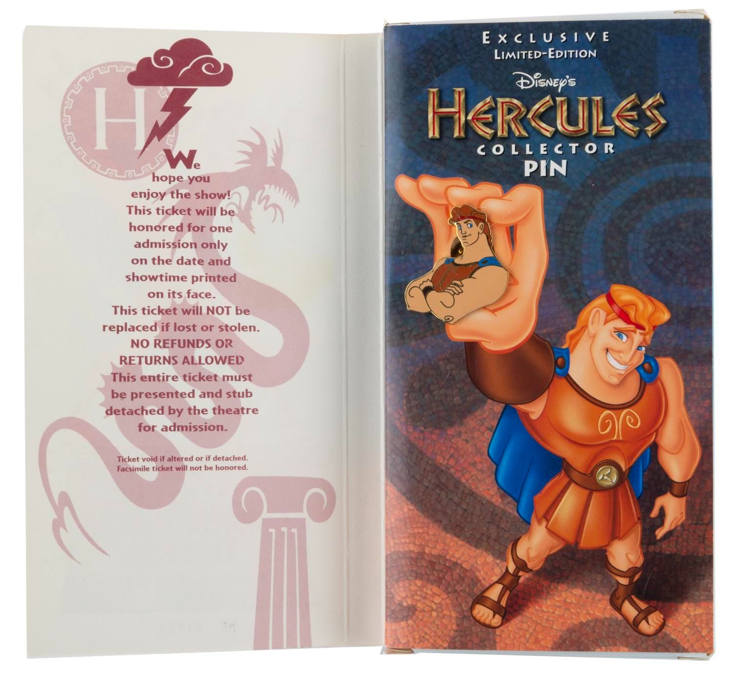 (Disney, 1997) A "Hercules” Collector Pin and Sneak Preview Weekend Commemorative Ticket Box. This is one of seven pins offered with the purchase of a ticket for the Sunday, July 22, 1997 showing of the film. Measuring 4” x 7”, the ticket and pin are in good condition with light creasing and soiling to the ticket, and the stub missing from use.