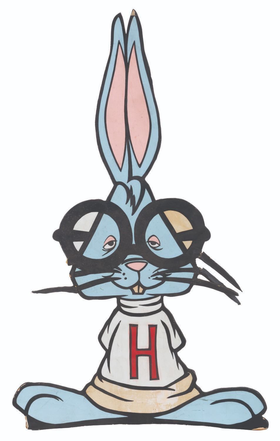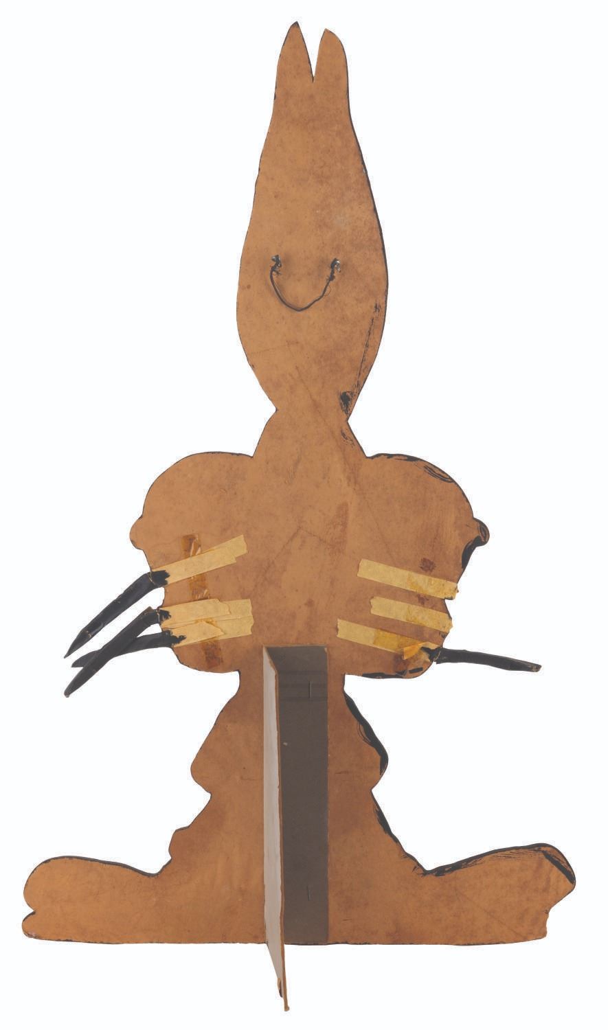 (Clampett, 1960s) A handmade wooden cut-out of Hercules Hare from “Beany and Cecil.” Measuring 25” x 15.5” and 0.25” thick, the display is in fair condition with edge wear, two missing broken whiskers on the left, two broken but still attached whiskers on the right, peeling, scratches, cracks, soiling, and discoloration. Due to size and weight, this item requires special shipping arrangements. Please inquire before bidding.
