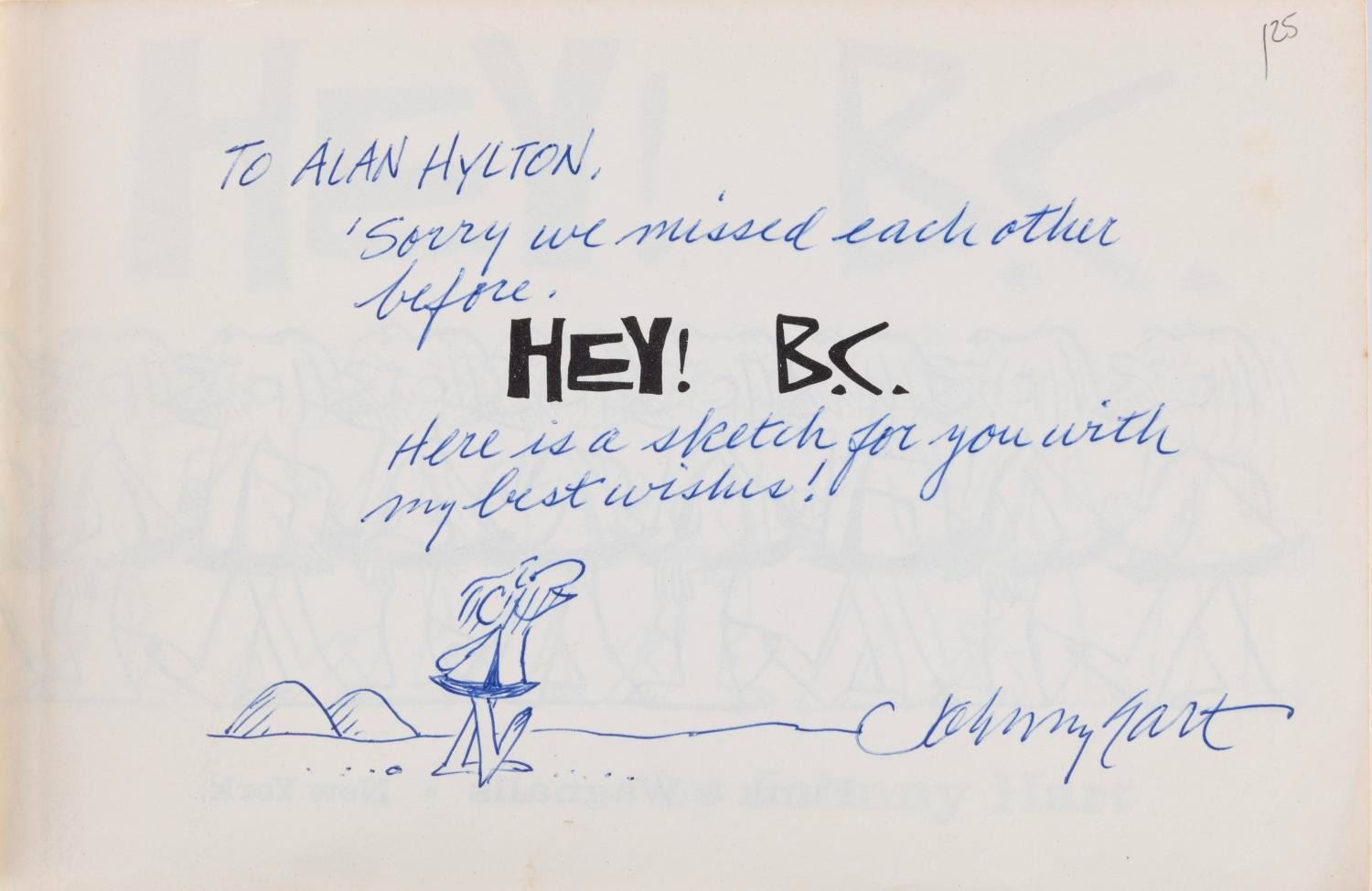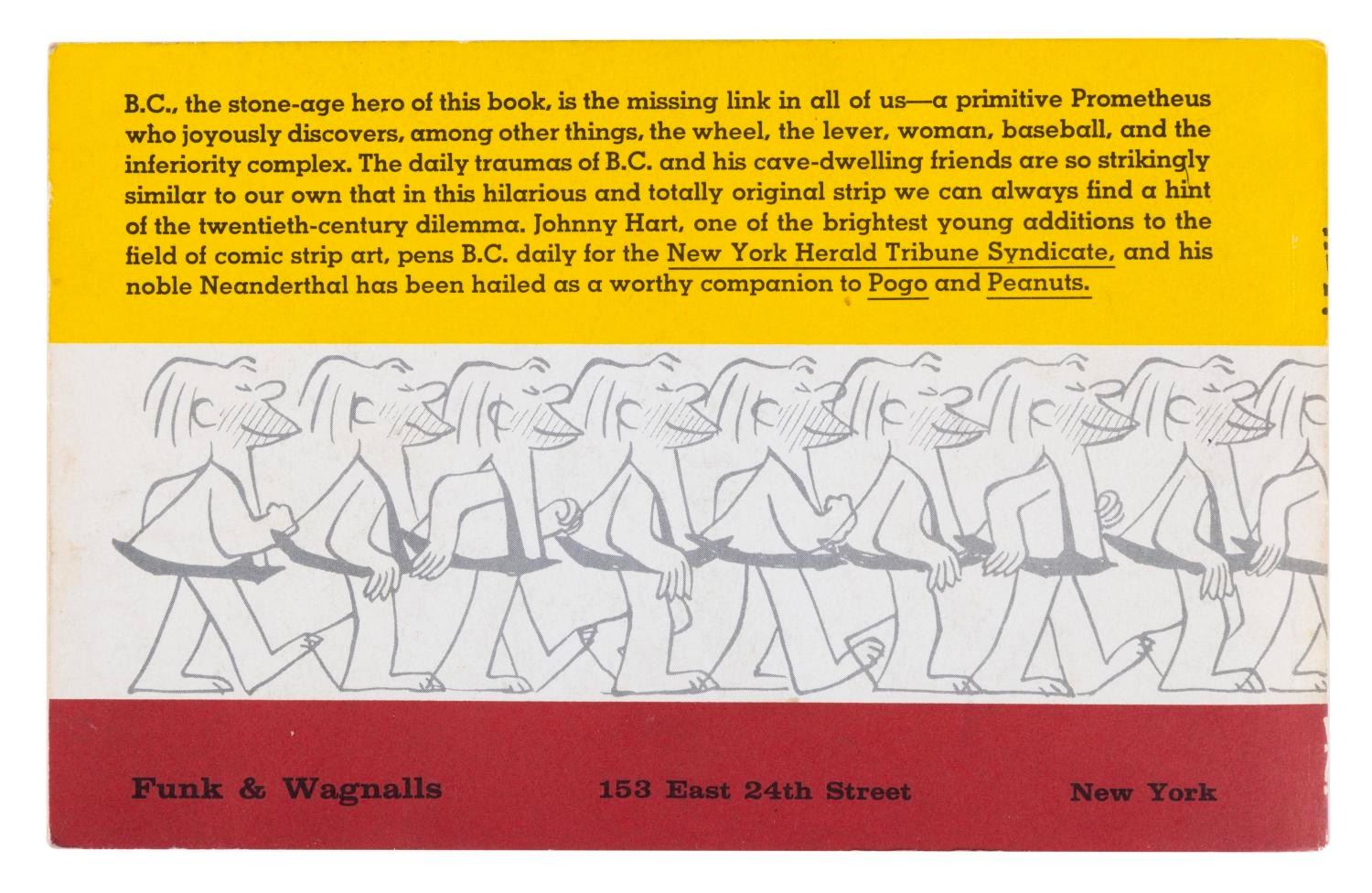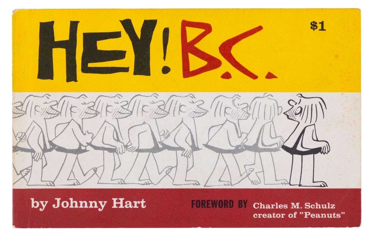 (Funk and Wagnalls, 1959) A rare copy of "Hey! B.C.," a book of comic strips by artist Johnny Hart. This first paperback release of Hart's popular strip is boldly signed on the title page with dedication and an iconic sketch of the title character walking in a prehistoric landscape. The 48-page book measures 5.25"x 8.25" and is in good condition overall with minor cover wear including faint spotting.