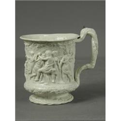 A Hicks & Meigh white moulded mug, with a Bacchanalian frieze, printed underside with 'Arts and Commerce promoted for the Best Model, of a mug ornamented in relief', 13cm Est. 70/90