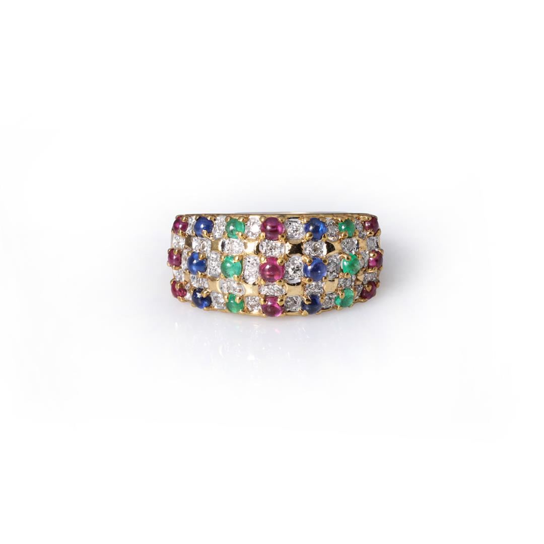 A graduated broad band set with five distinct rows of claw set diamonds spaced between rows of cabochon rubies, sapphires and emeralds, stamped on the interior 14k and maker mark BJ within a diamond shape, circa 1970s; gross weight 7.0 g, size 6.5