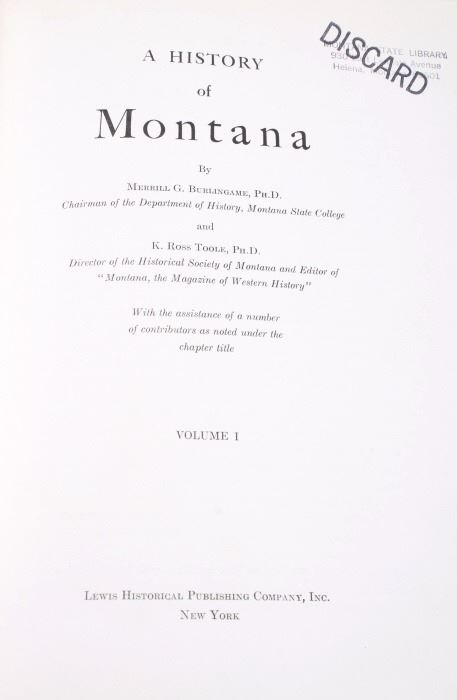 For your consideration in this lot is A History of Montana Vo. 1 & 2 By Merrill G. Burlingame, Ph.D. and K. Ross Toole, Ph.D. First edition published 1957. These books came from the Montana State Library, Helena Montana. Volume one covers from chapter 1 "Montana before Man" to chapter 16 "history of Banking in Montana. Volume 2 covers from Chapter 17 " Forest and Stream" to 31 "Education" and then an Index. These books have over 100 illustrations. The books are bound in blue cloth with gold embossed lettering on the spines, the pages are intact with very little cover wear. These books are in very good condition. Please see the images for an accurate accounting of condition.