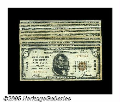 <B>A Hoard from the Sterling National Bank & Trust Company</B></I><BR>Included are: $5 1929 Ty. 1 (2) Fine and VF; $ $5 1929 Ty. 2 Fine; $10 1929 Ty. 1 (3) Fine; $10 1929 Ty. 1 EF; $10 1929 Ty. 2 (2) F and VF.<BR>A starter set including roughly 20% of the known census from this small only issuer.<BR>
