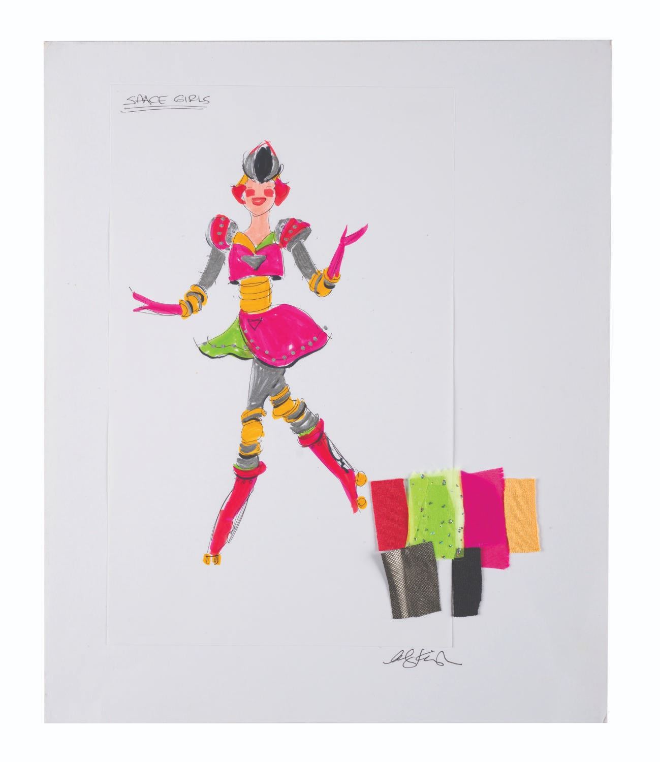 (Hong Kong Disneyland, 2005) A character costume design for Hong Kong Disneyland by Imagineer Alyja Kalinich. Accomplished in ink, graphite and marker on 8.5"x14" drawing paper, the artwork features a colorful design for a Space Girl character featured in a show or parade at Hong Kong Disneyland. The artwork has been mounted to 14"x17" artists board with suggested fabric samples attached. Signed by Kalinich, it displays in very good condition.