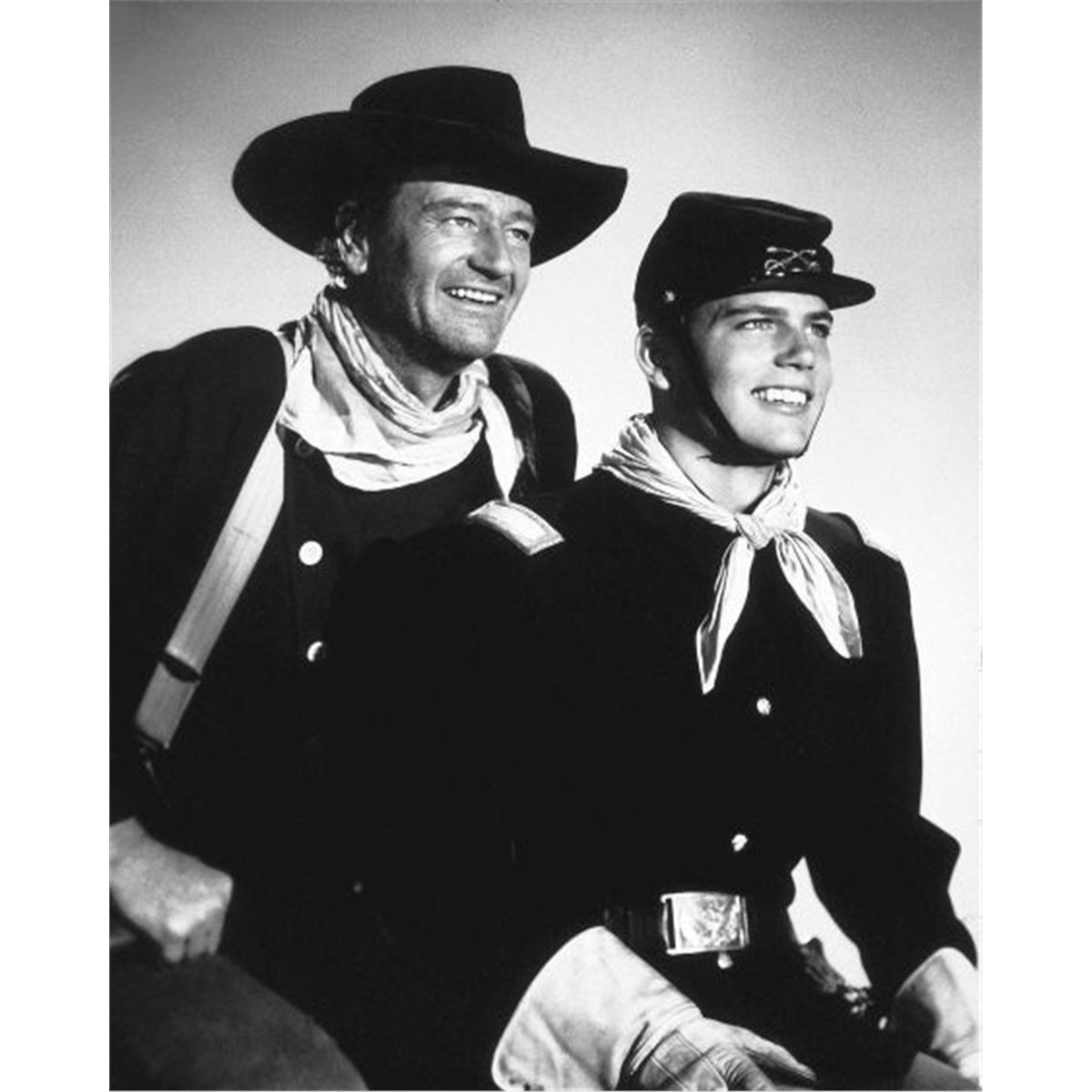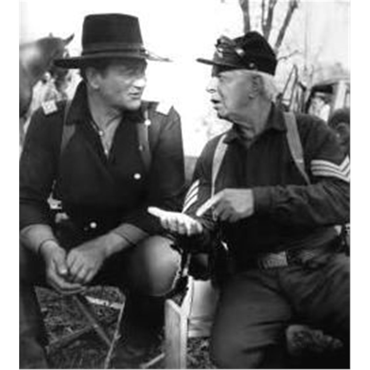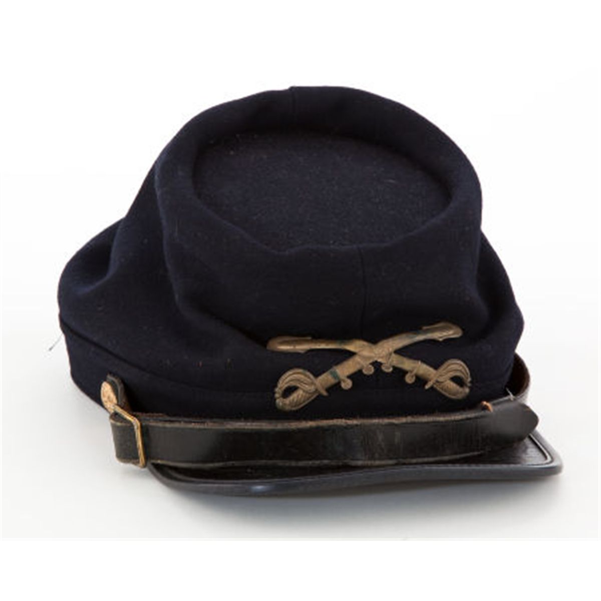 A Hoot Gibson Cavalry Kepi Hat from "The Horse Soldiers." United Artists, 1959. Of standard design, made of navy blue wool, black leather band rests on small black brim, brass cavalry insignia affixed to front, inside has handwritten annotations in black ink reading "John Wayne" and "Duke Wayne;" appearing to be the one worn as Gibson portrayed "Sergeant Brown" in the film, though possibly also used by Patrick Wayne three years earlier in the 1956 Warner Bros. release of "The Searchers" -- in either case, Wayne kept it as a souvenir.