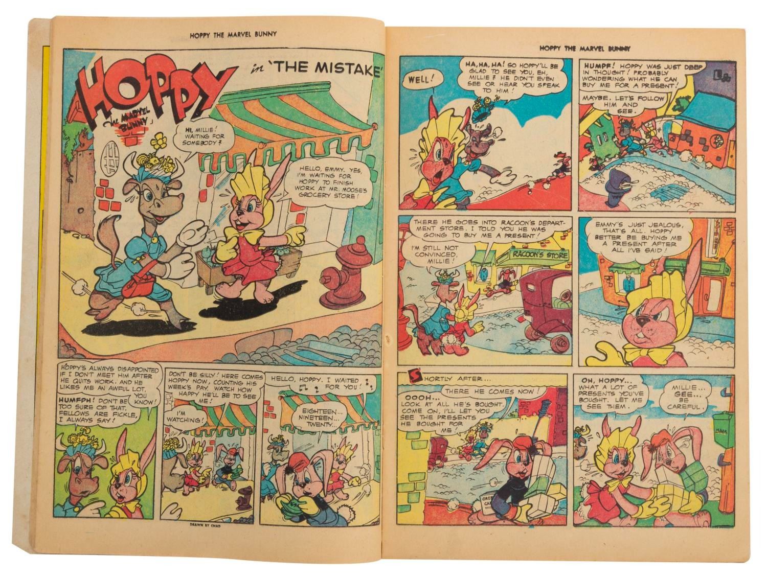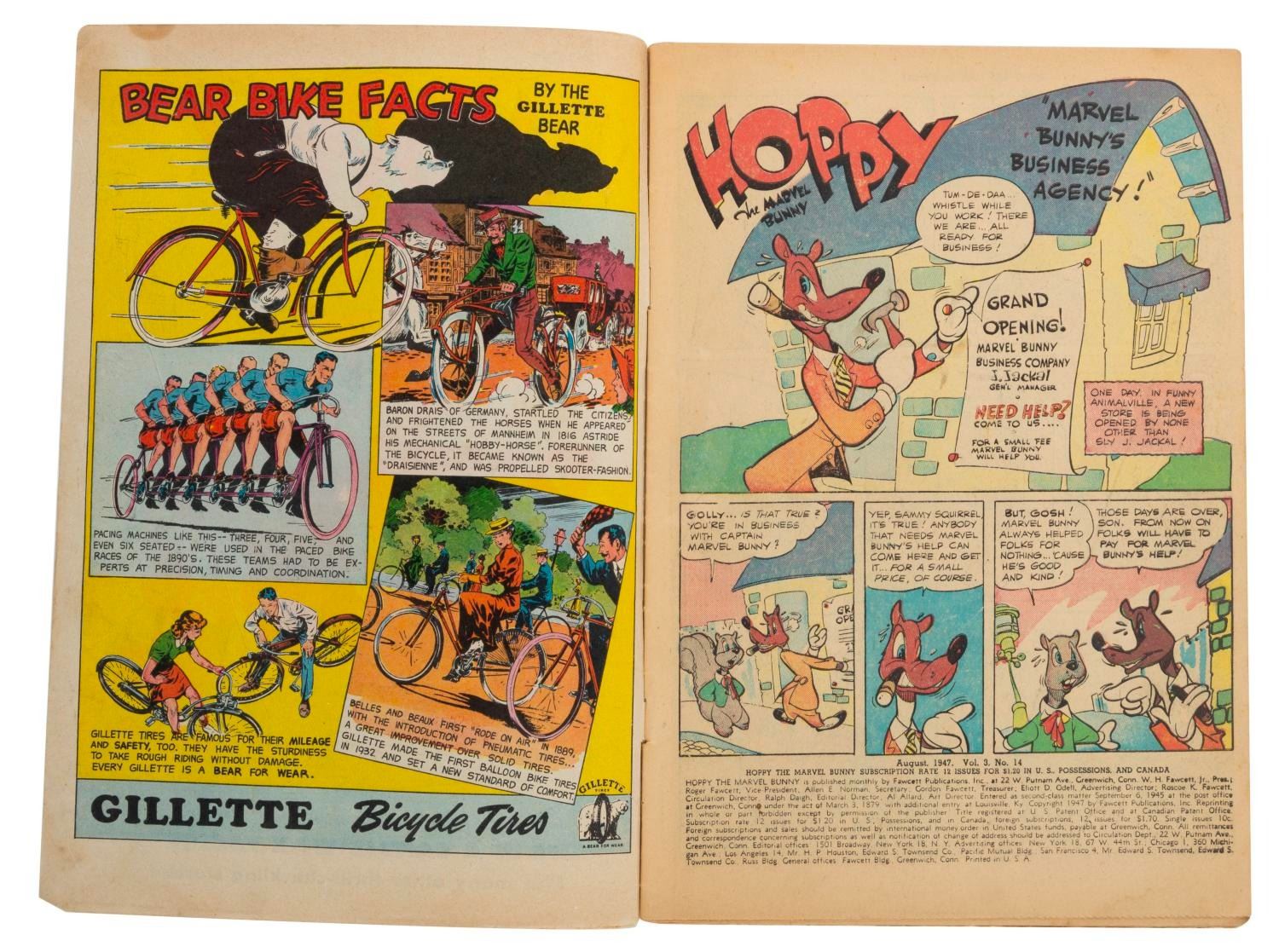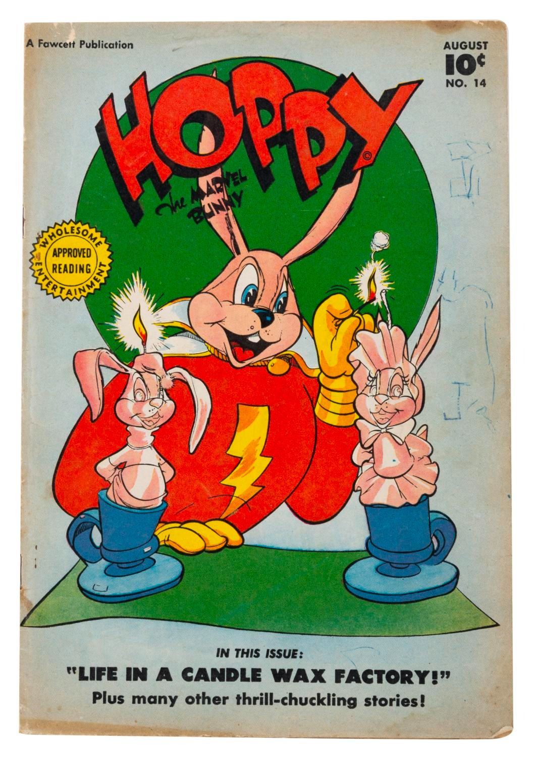 (Fawcett, 1947) A Hoppy the Marvel Bunny Vol. 3 No. 14 comic book. Measuring 7" x 10.25", the comic book is in fair condition with heavy pen and ink inscriptions, scuffs, handling wear, and discoloration from age.