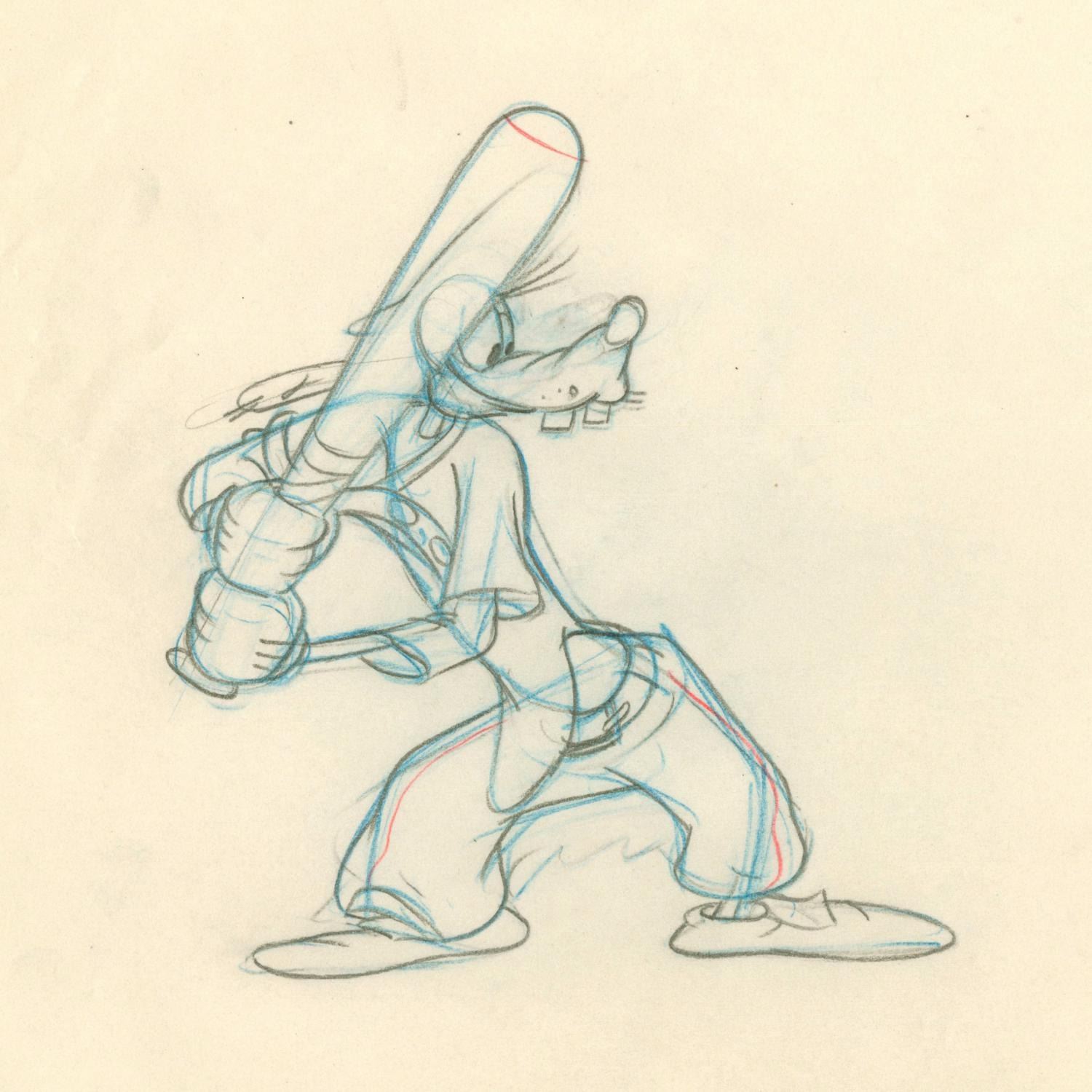 (Disney, 1942) An excellent graphite and color pencil production drawing of Goofy from the animated short "How to Play Baseball.” With a character image measuring 5" x 4.75" on 10” x 12” animation paper, the drawing is in very good condition with typical discoloration to the paper from age, particularly around the edges, and a slightly creased bottom right corner.