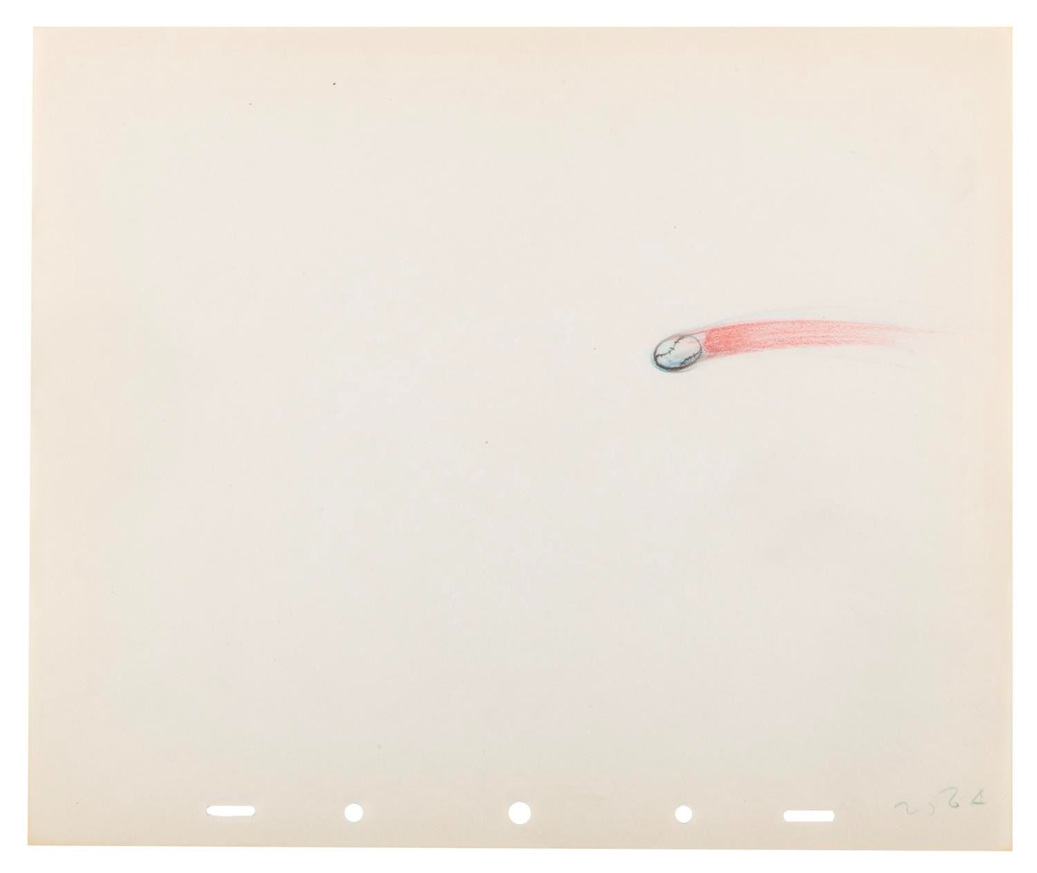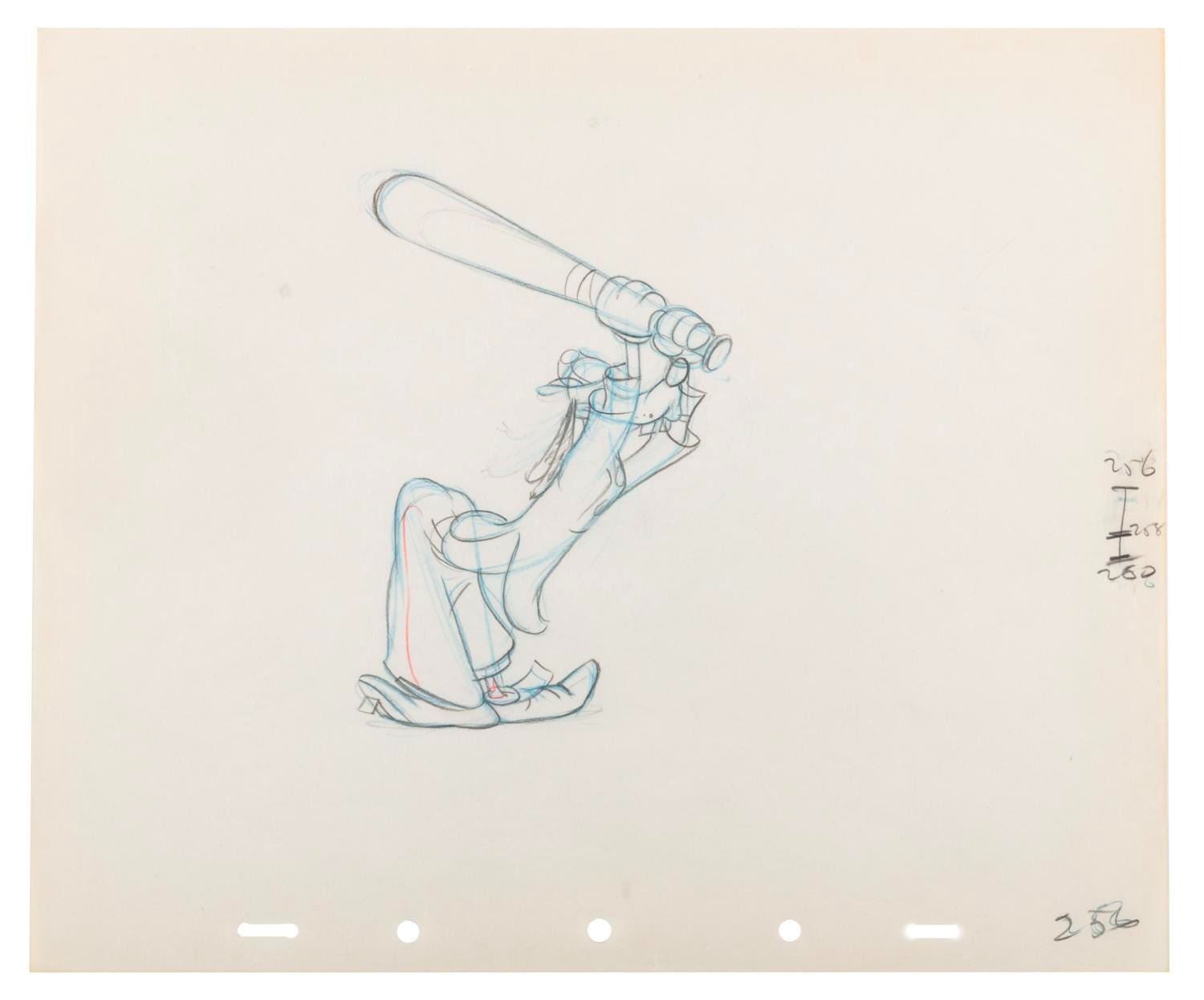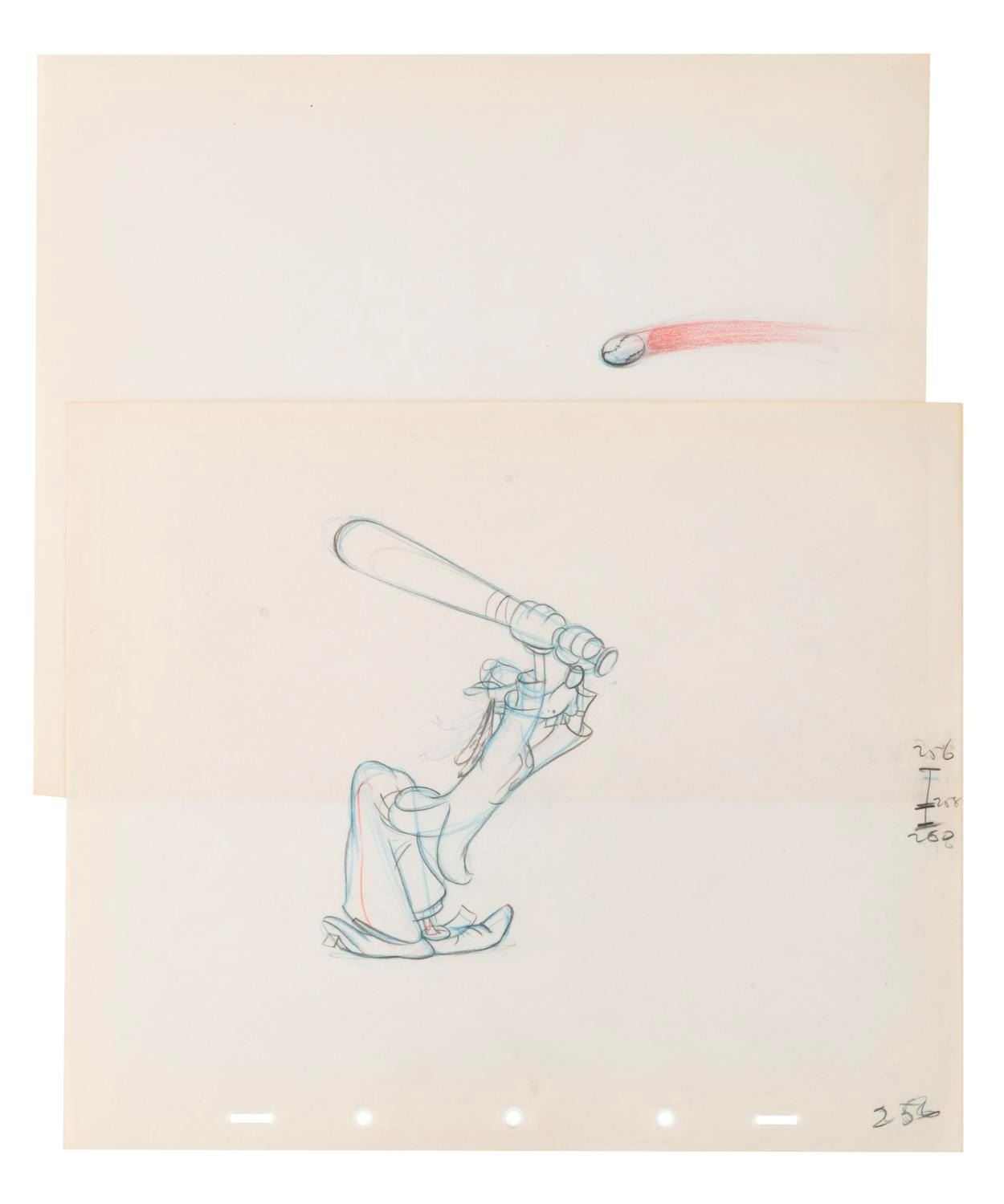 (Disney, 1942) An excellent graphite and color pencil production drawing of Goofy from the animated short"How to Play Baseball." Also included is a matching animation drawing of the baseball in motion. With a character image size of 6" x 4" on 10" x 12" animation paper, the drawing is in very good condition with discoloration, particularly on the edges.