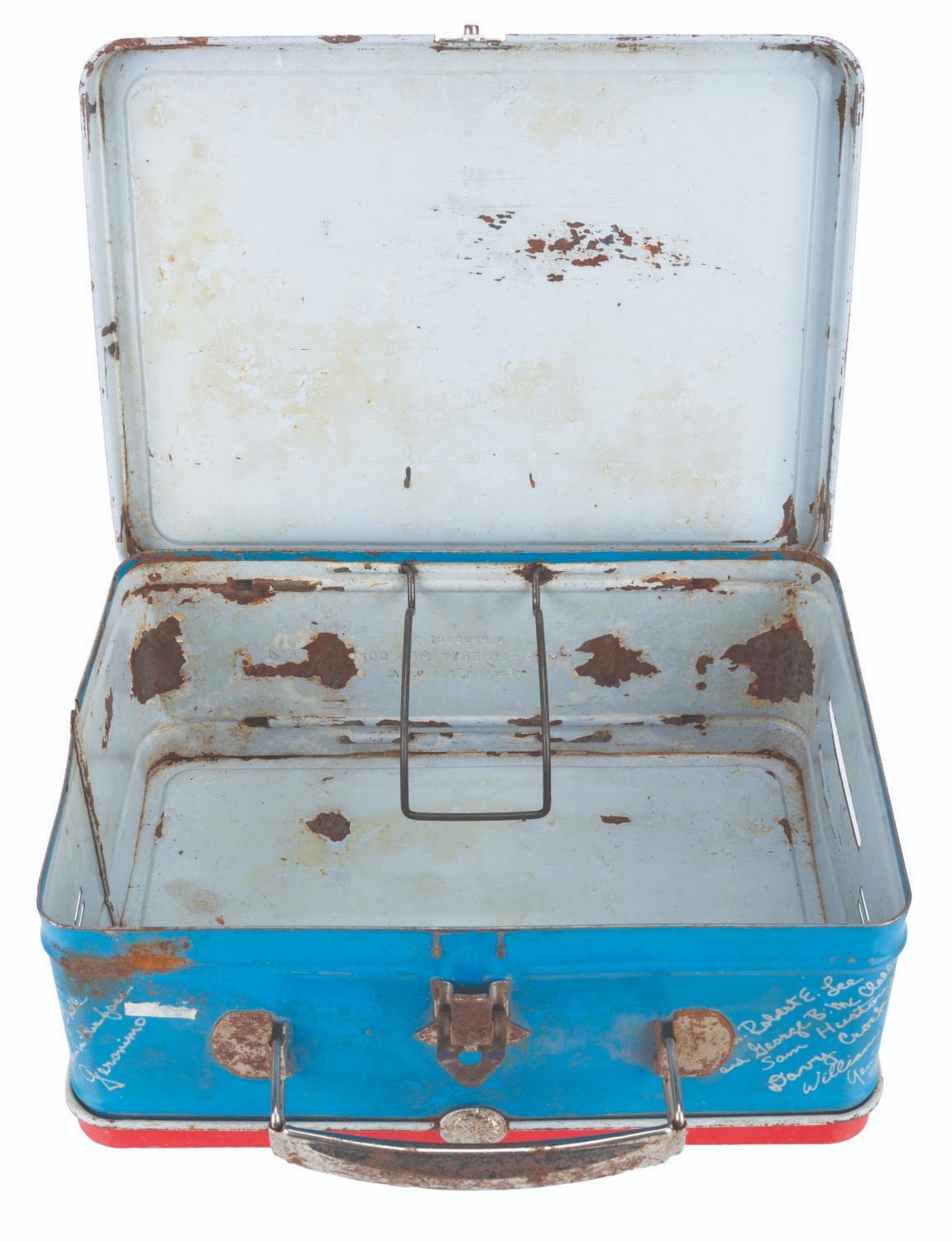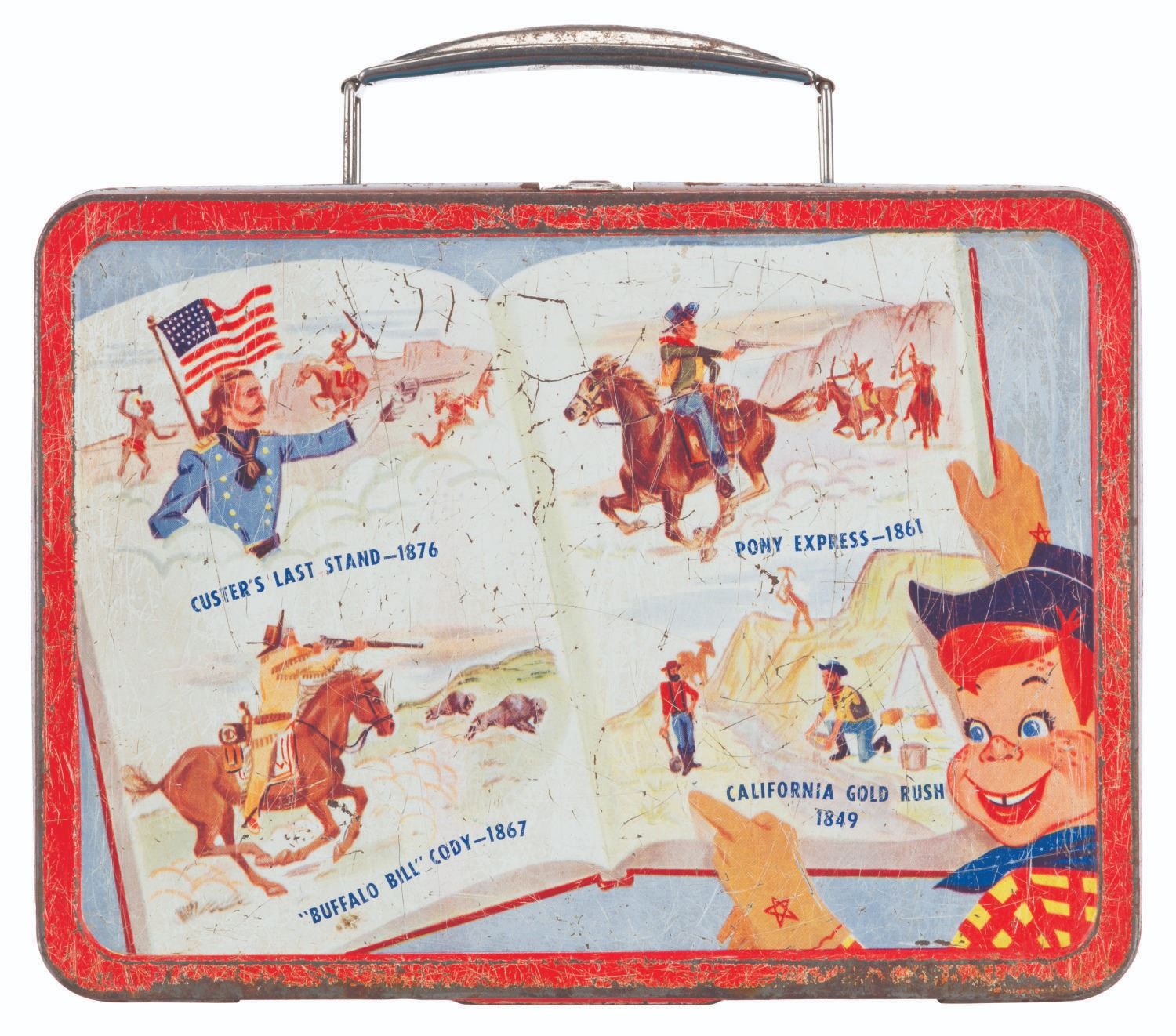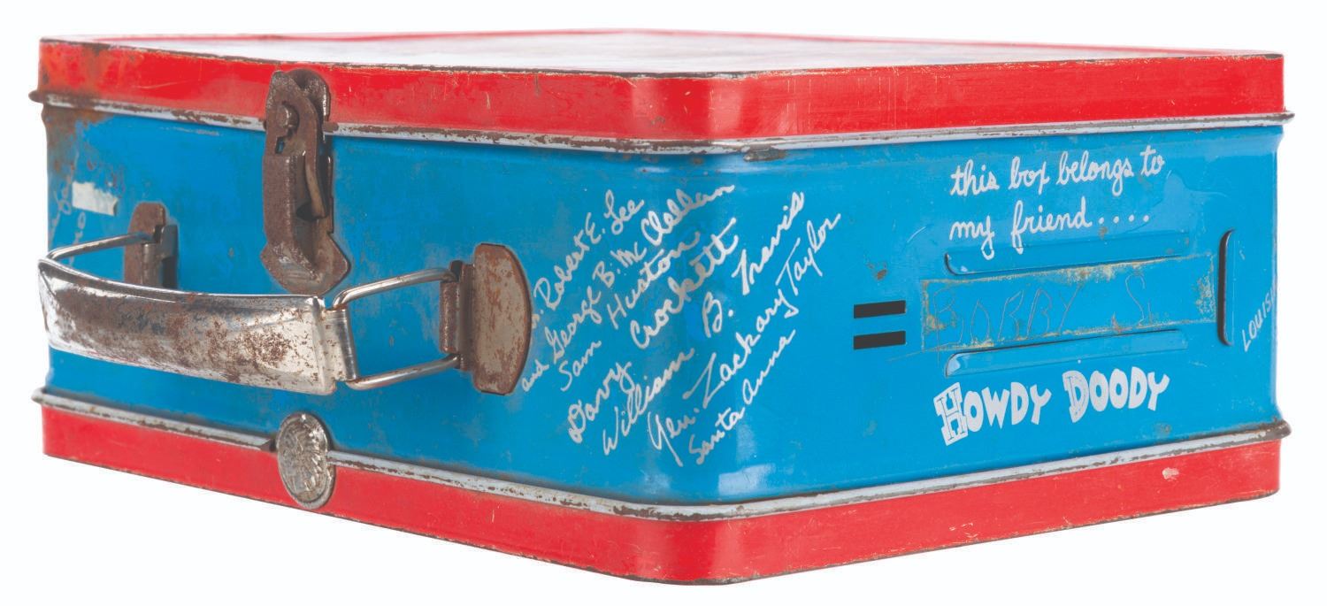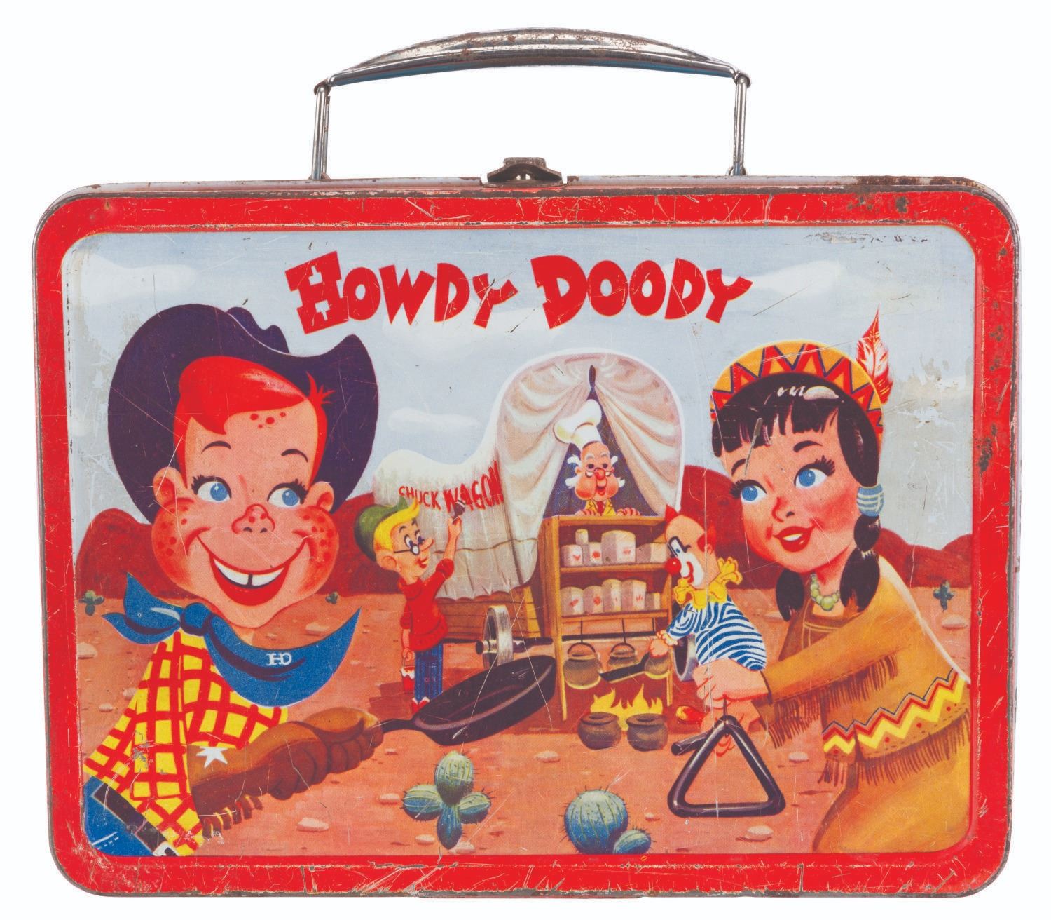 (Adco-Liberty, 1954) An original Howdy Doody lunch box featuring Howdy and the gang, and milestones in old west history on the back. Measuring 9” x 3” x 7.5” tall, the lunch box is in fair condition, with wear overall including scratches, spots of paint loss with oxidation to exposed metal, and the thermos missing.